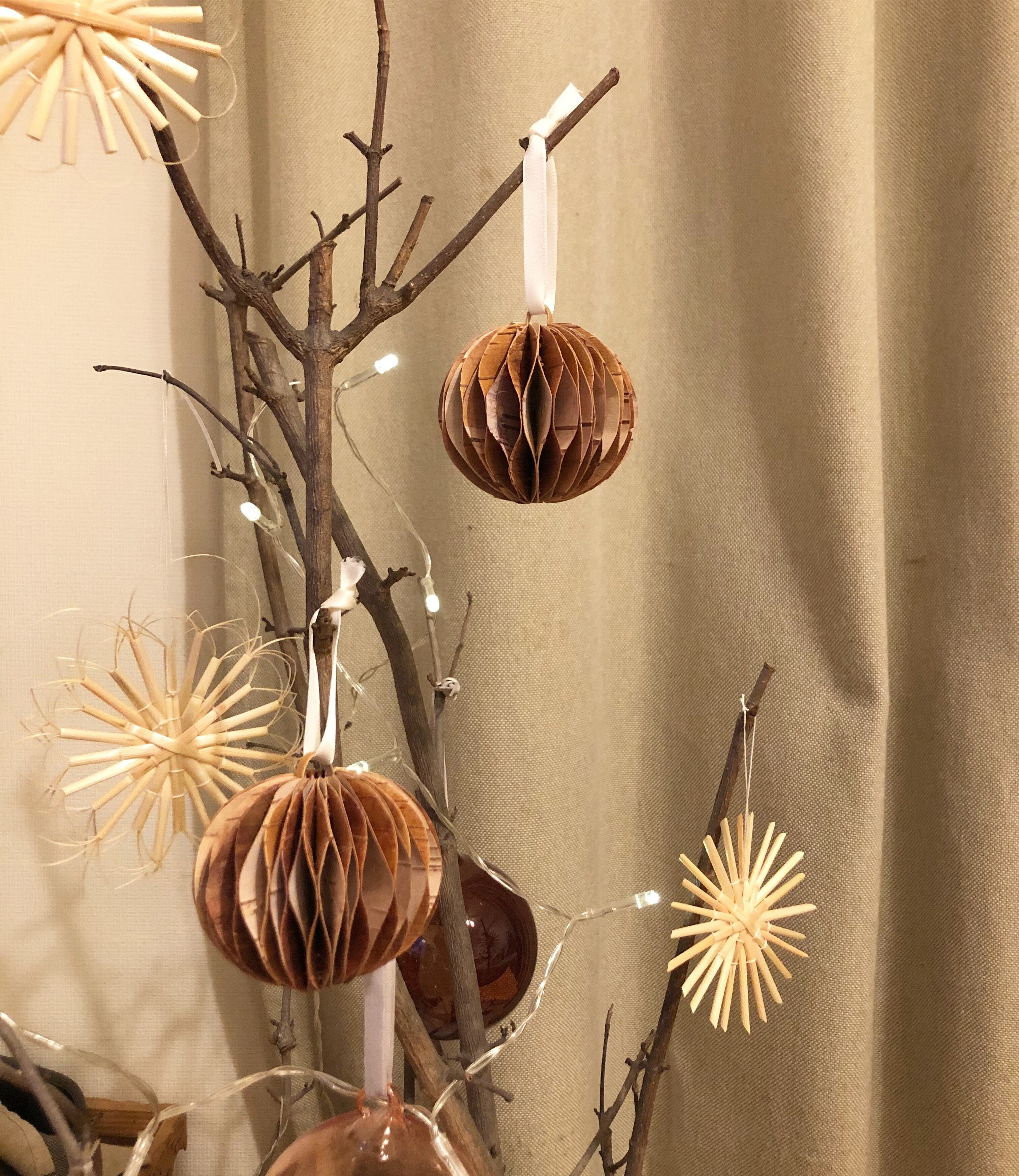 白樺の樹皮を何枚も重ねてボール状にした、とても凝った作りの白樺のオーナメントボール。