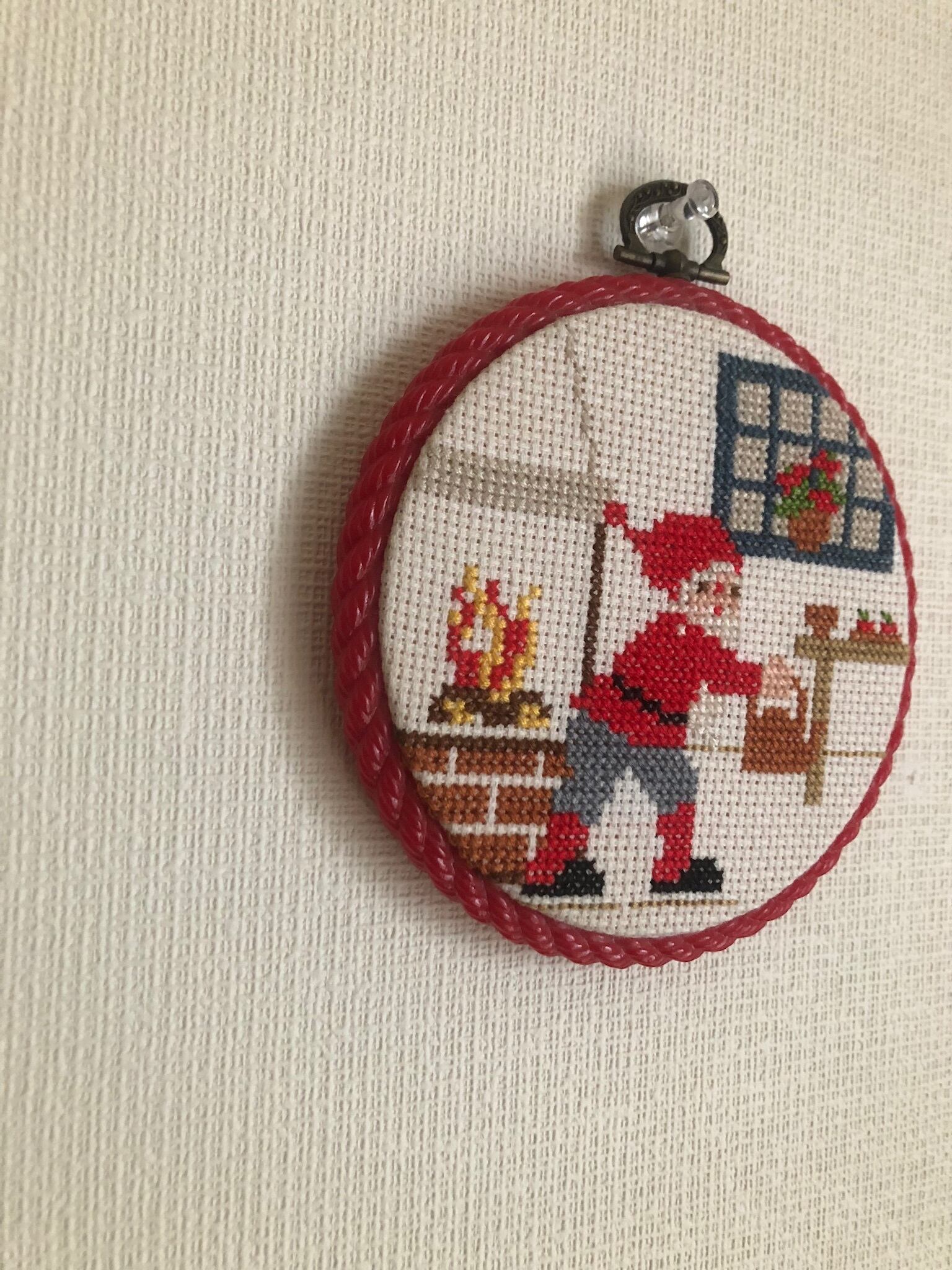 サンタクロースの刺繍が可愛いらしい、クリスマスの丸額入り刺繍飾りです♫
