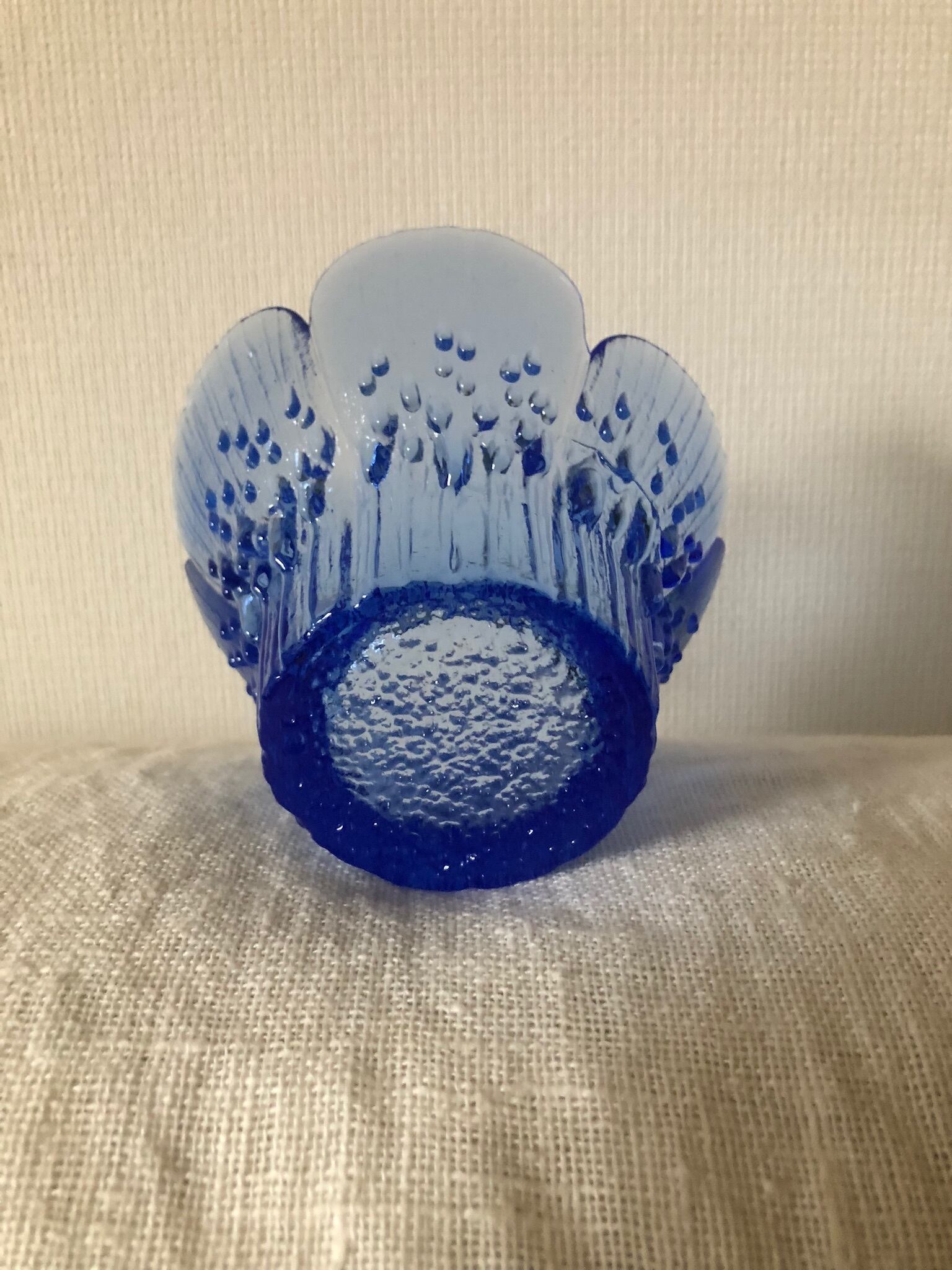 ブルーのガラスに、フィンランド語でHeina(干し草)の柄がシンプルでシックなキャンドルホルダー。