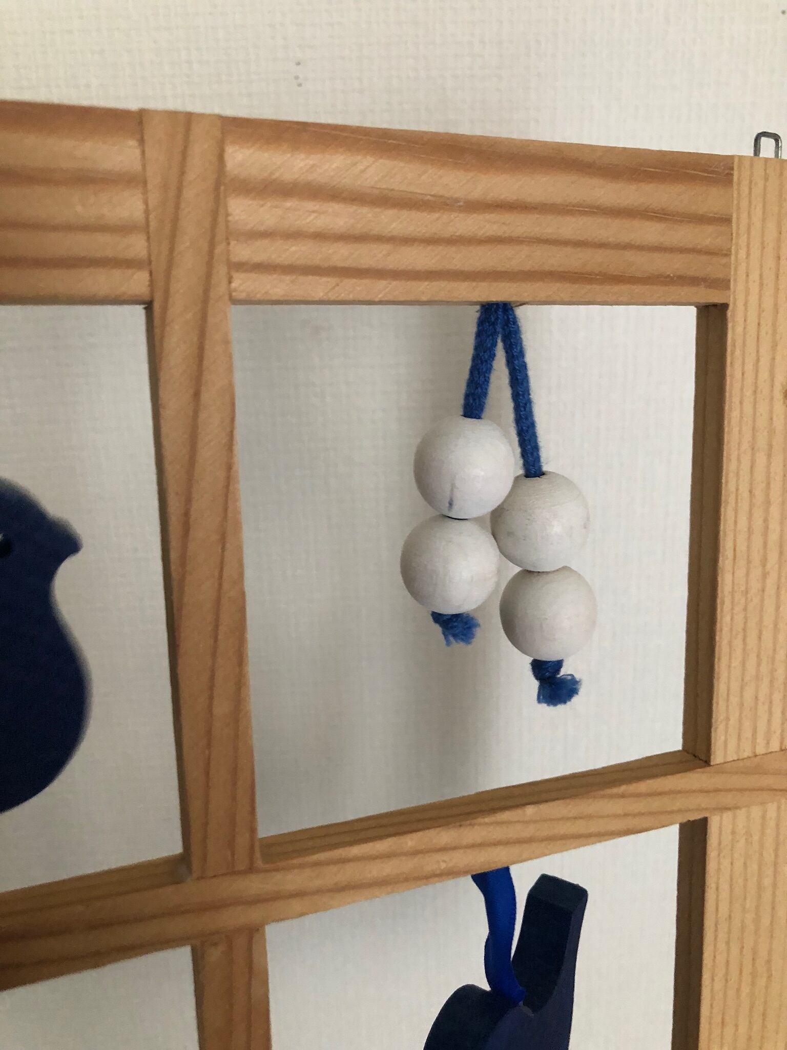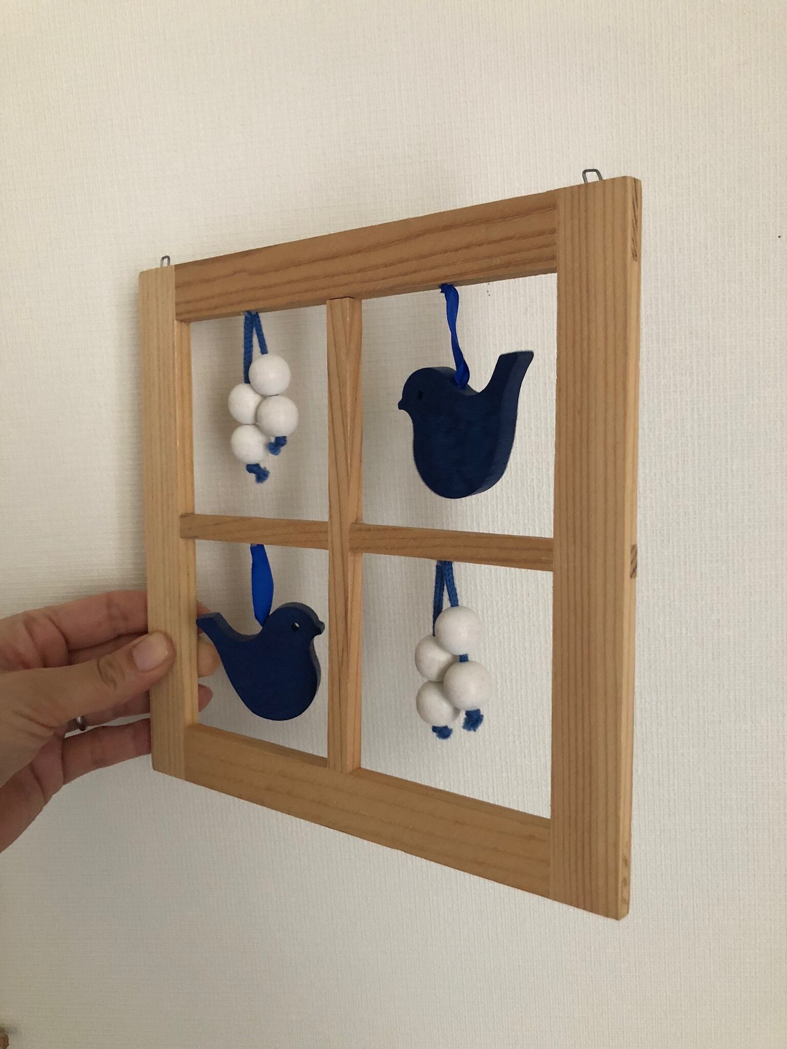 四角い木枠に、ゆらゆら揺れる2羽の青い鳥と白い実がとても可愛らしいモビールになります。