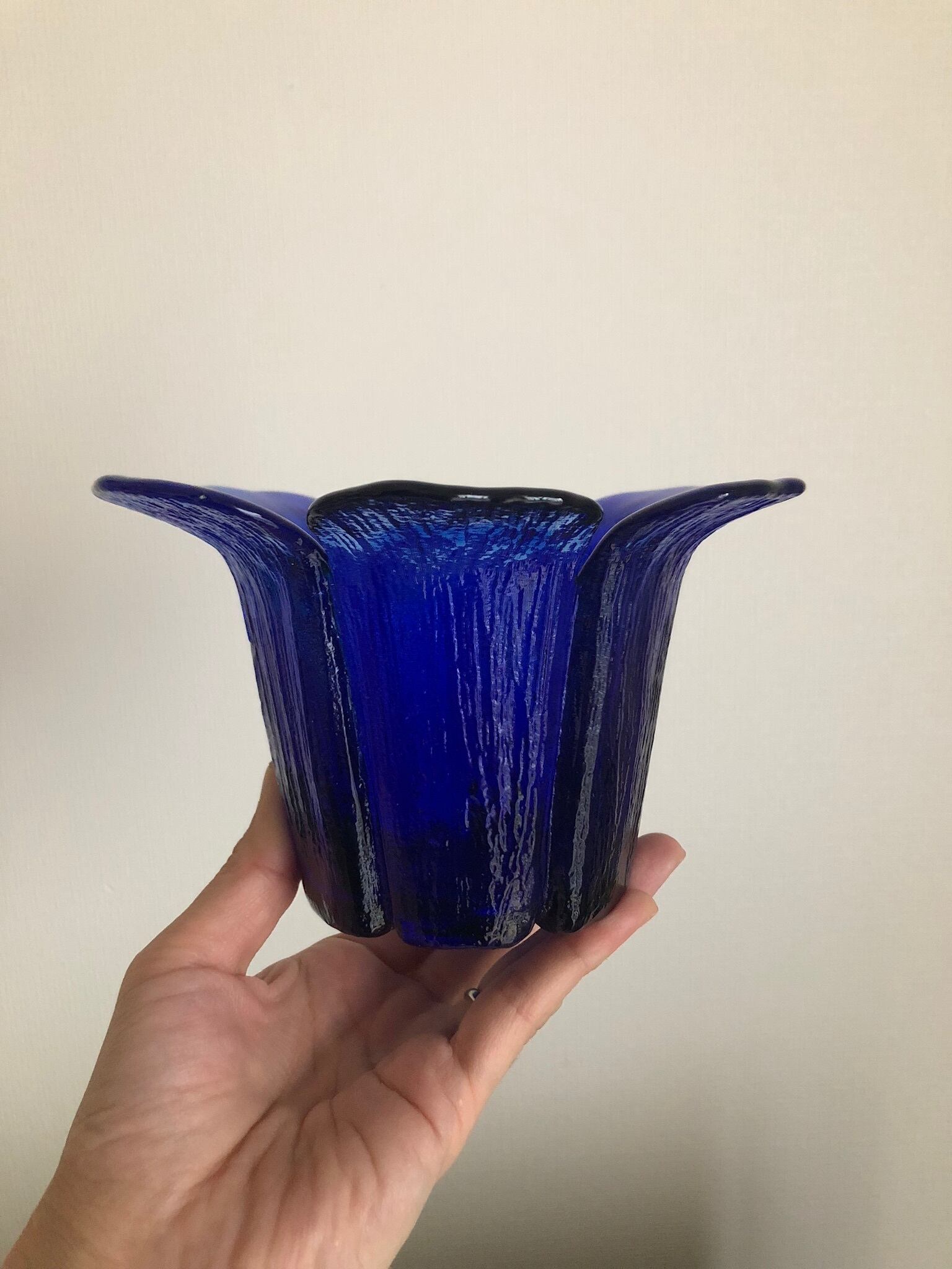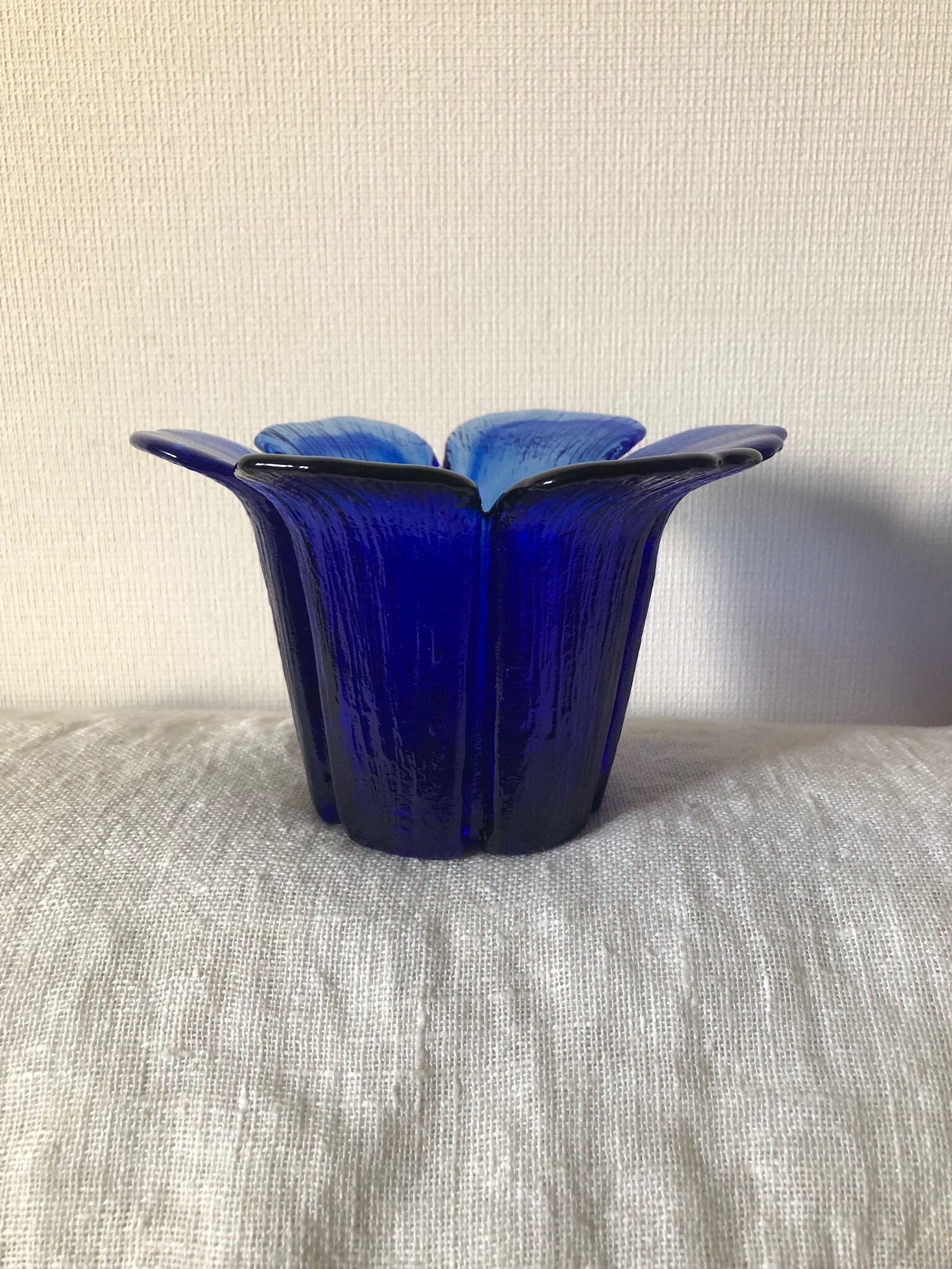 Teralehtiシリーズのガラスのキャンドルホルダーです。Teralehtiとは花びらの意味。その名の通り、お花がパッと開いたようなデザインと、濃いブルーの色味がシックで素敵なキャンドルホルダーです。