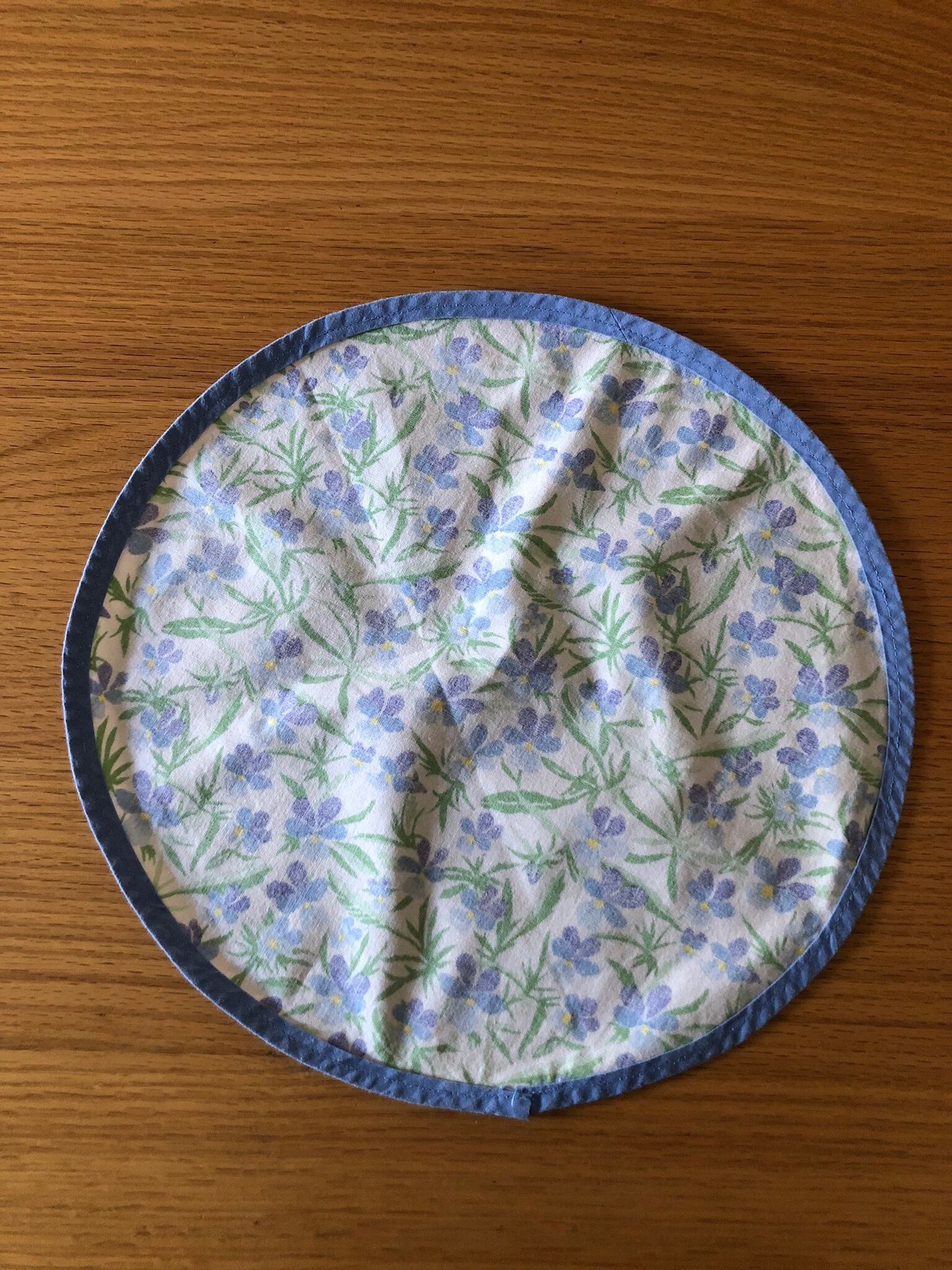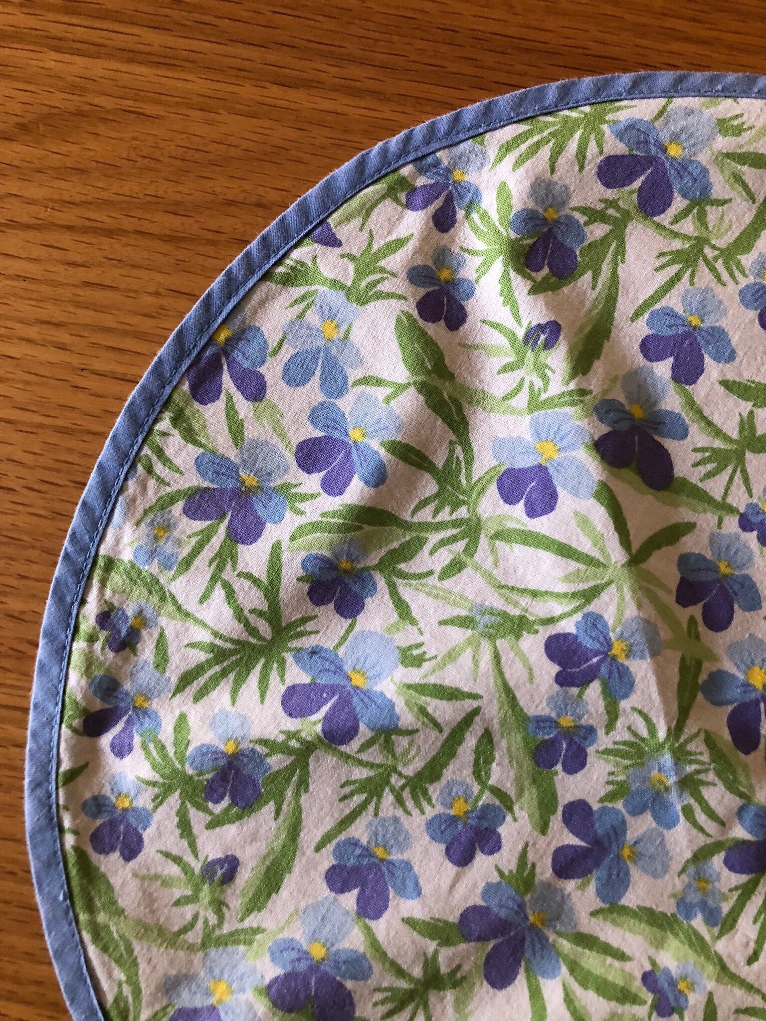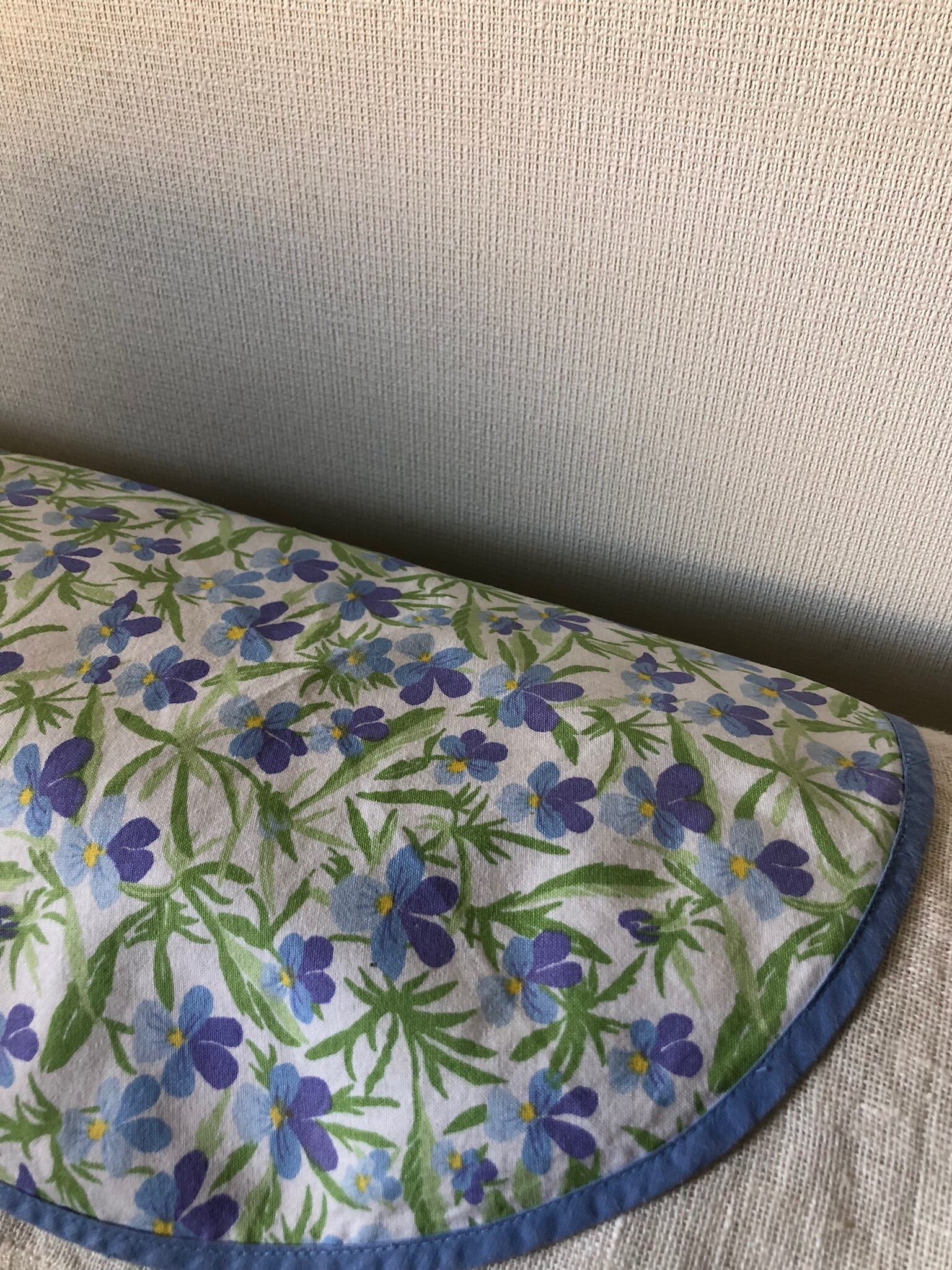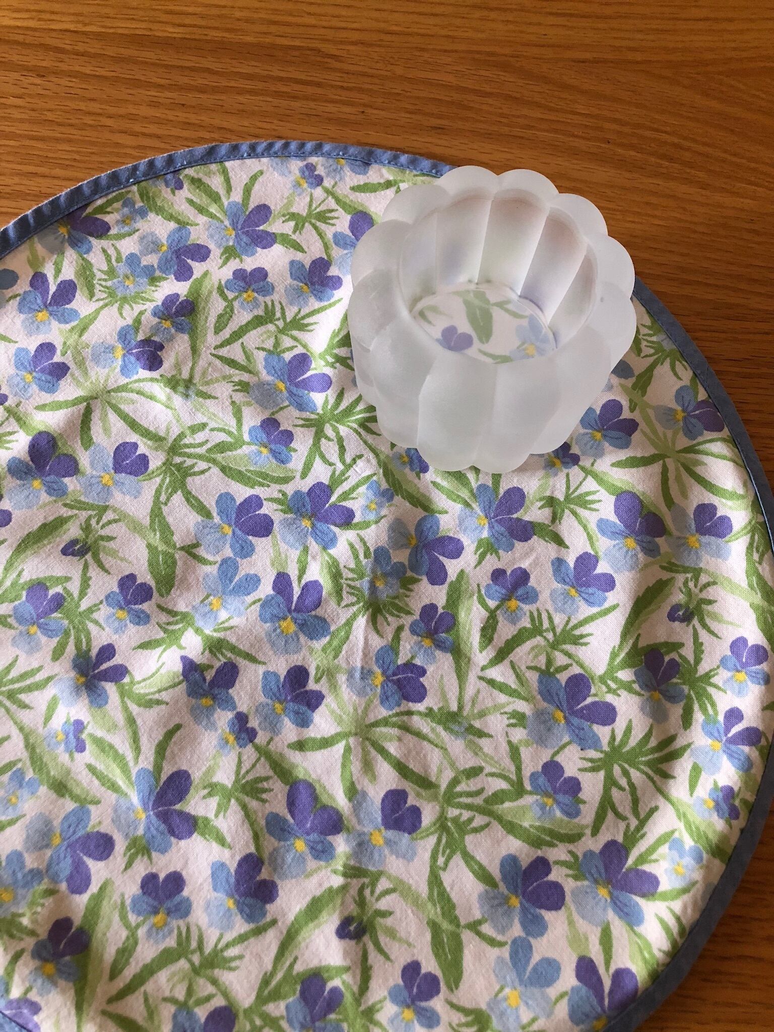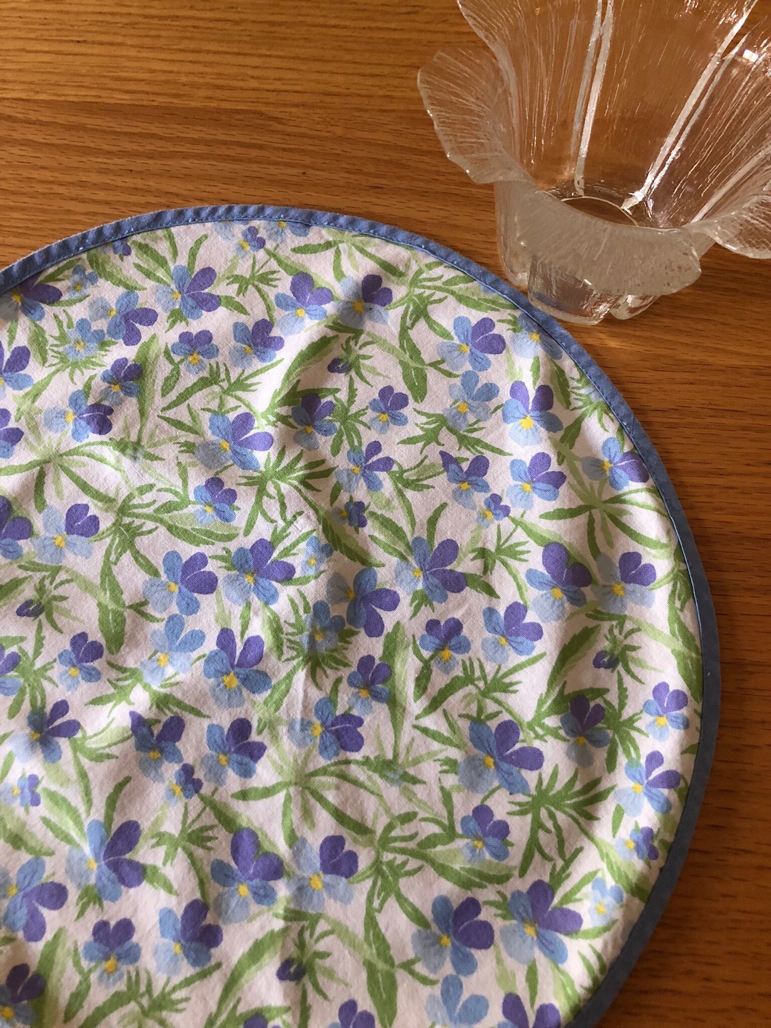 クロス全体にプリントされた薄いブルーとパープルのビオラ模様が素敵な丸いクロス。