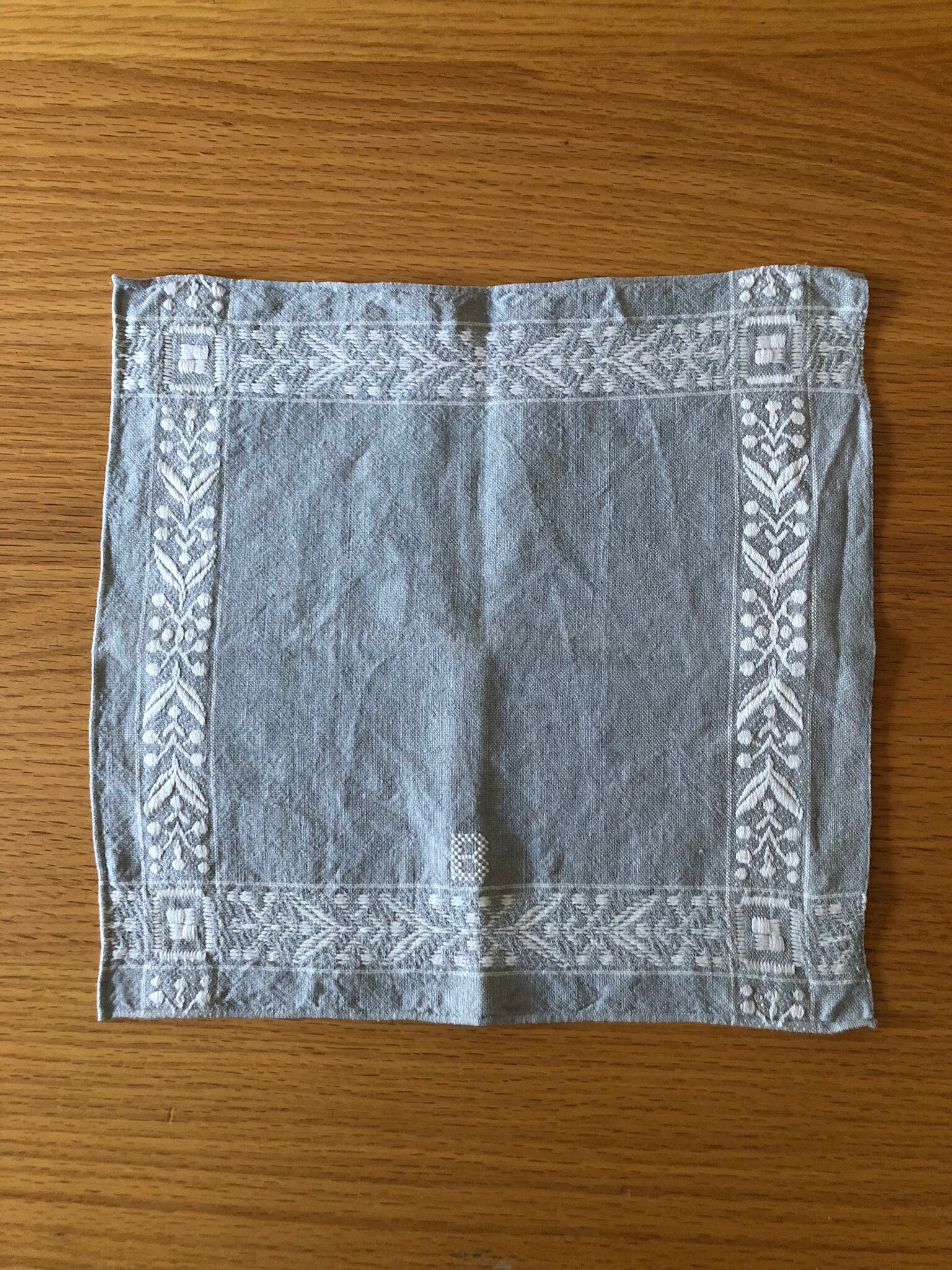 薄いグレーのハーフリネンの生地に、アルファベットのBのモノグラム刺繍と、回りをぐるっと囲った葉っぱと実の刺繍が、とてもシックで素敵なクロスです。