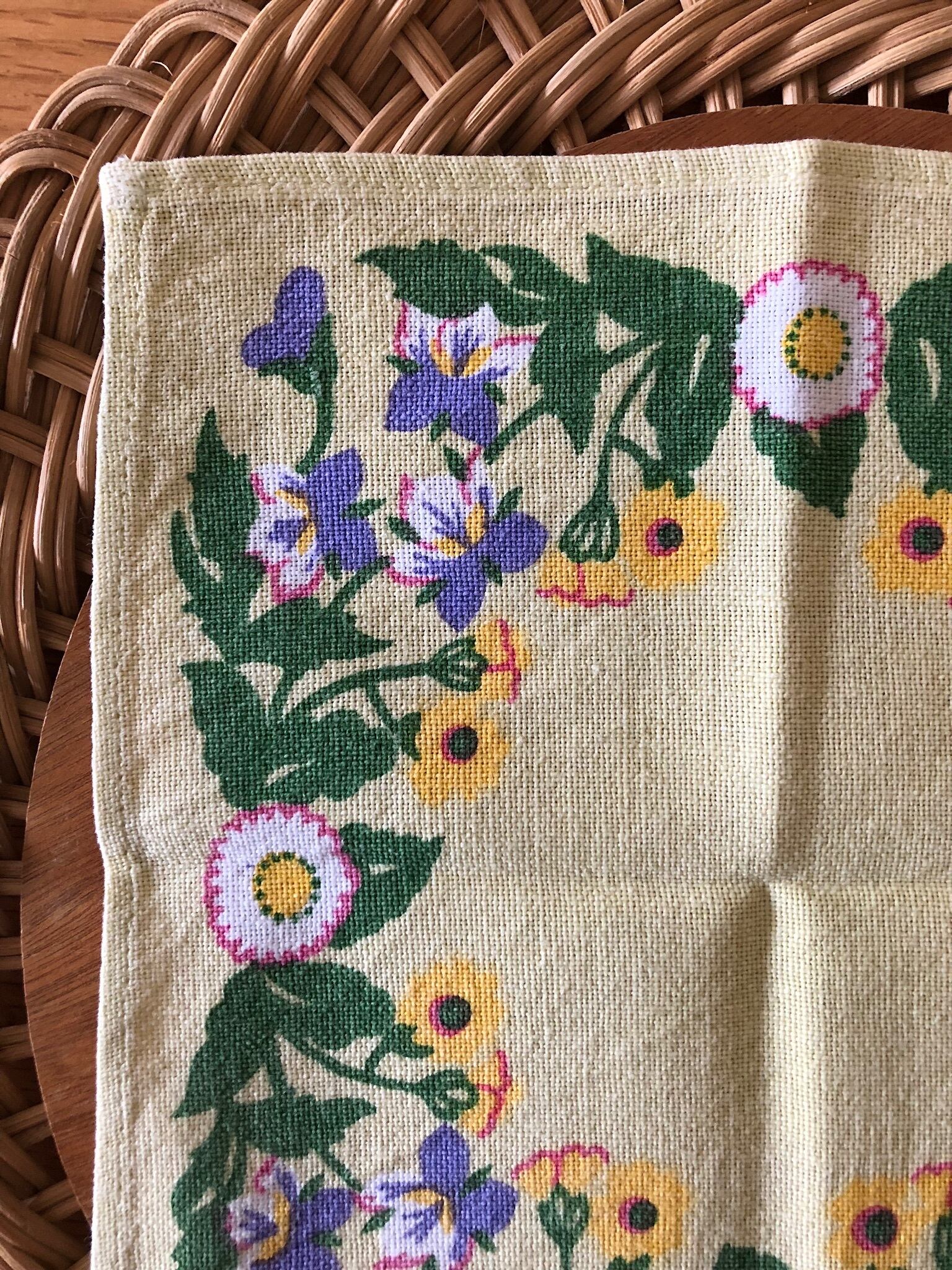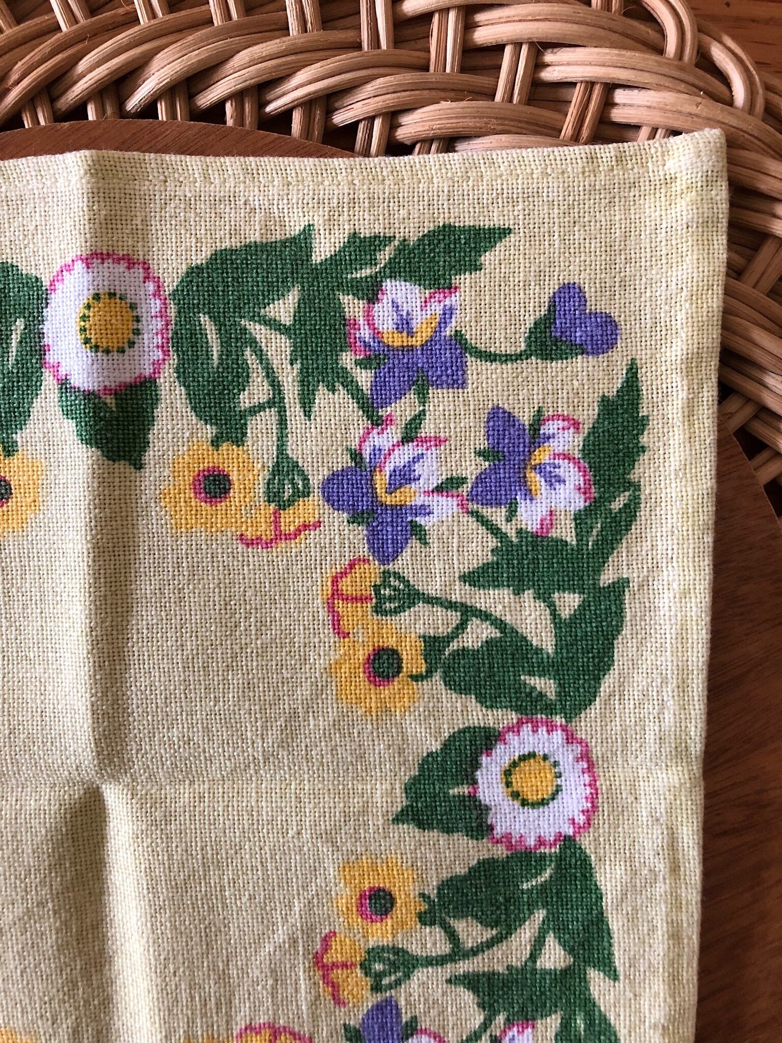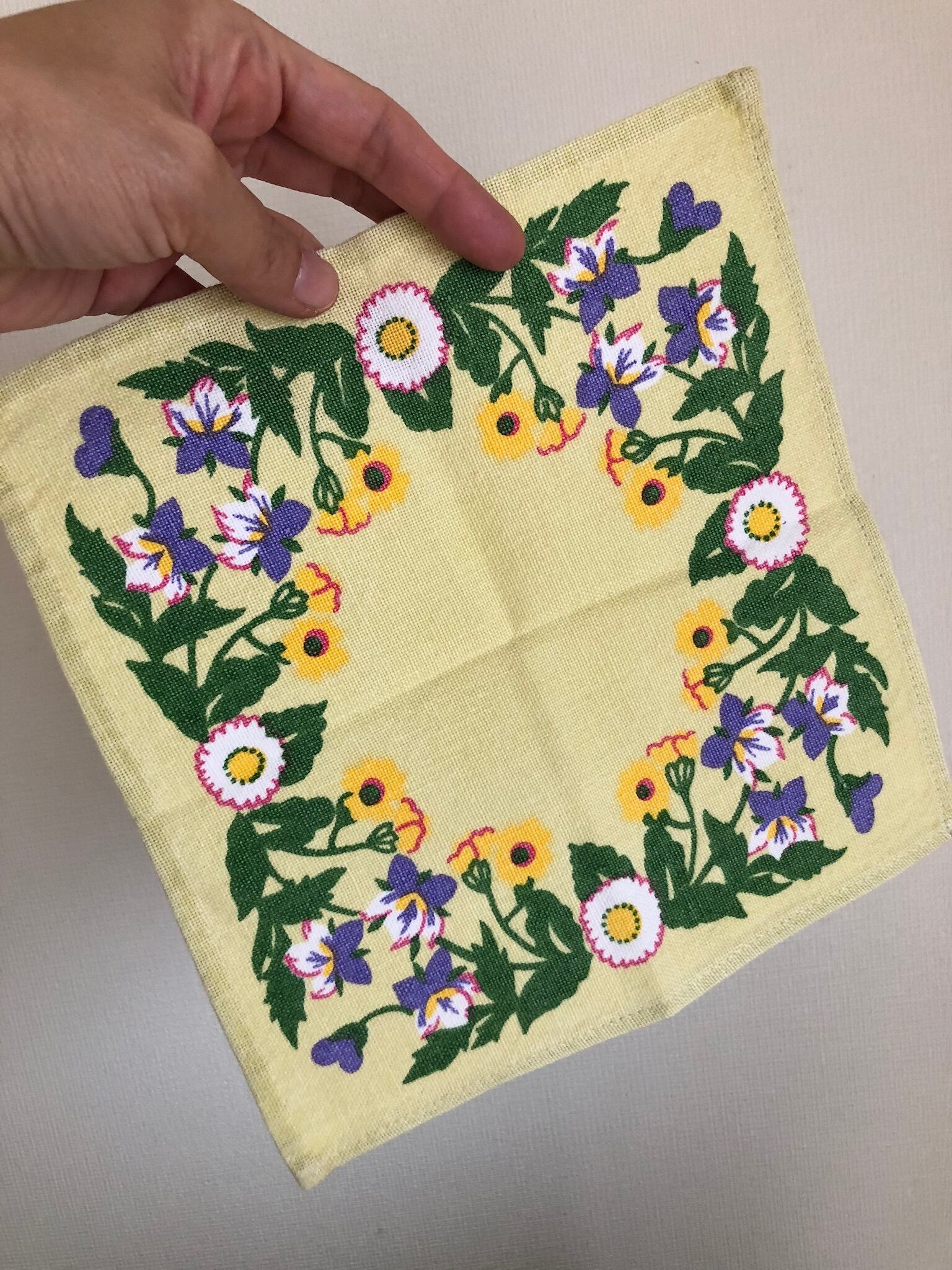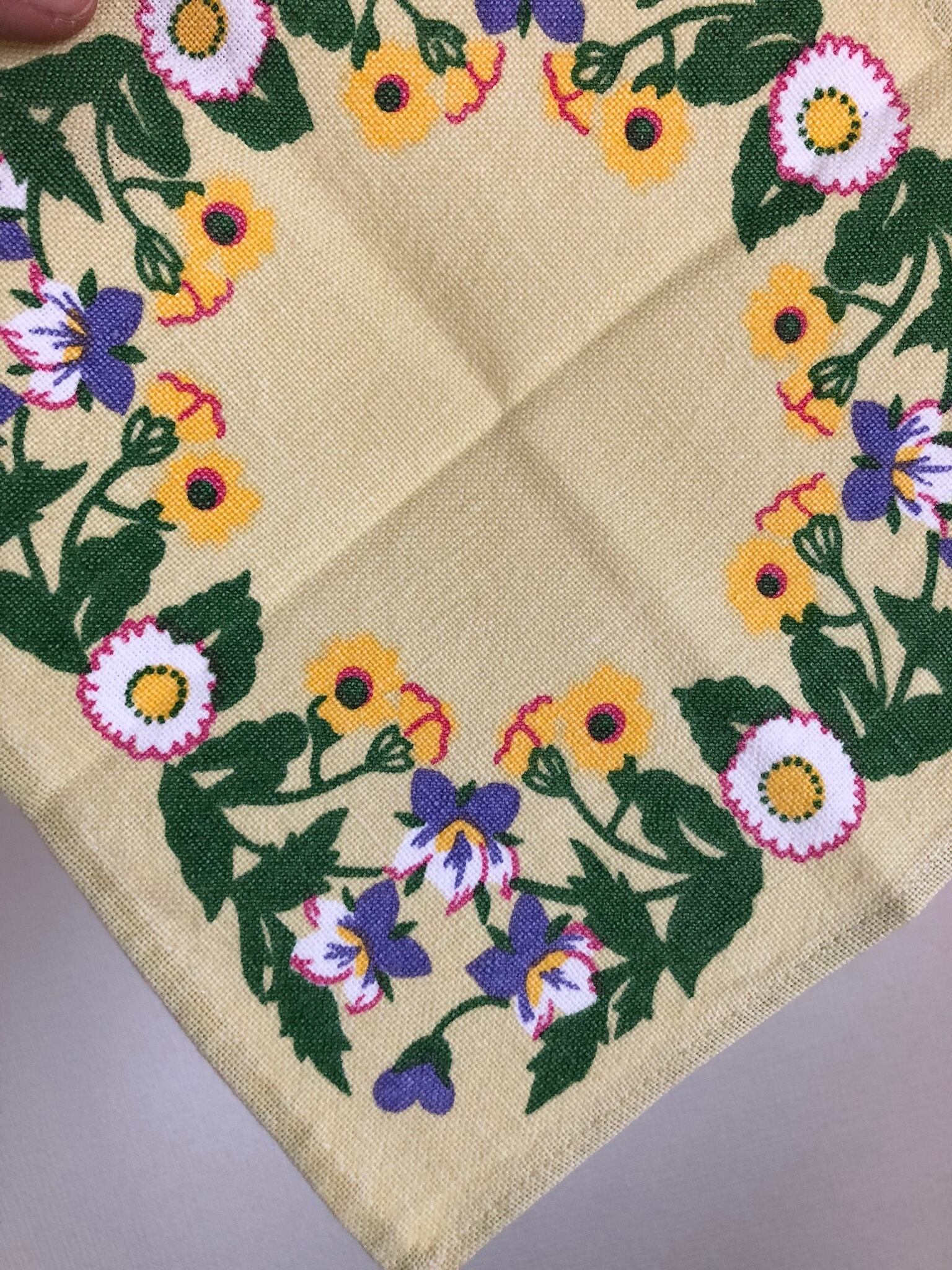 しっかりしたコットン生地の薄いイエローをベースに、デイジーやタンポポなど、春お花がリース状に描かれた、可愛らしく春らしい1枚♫