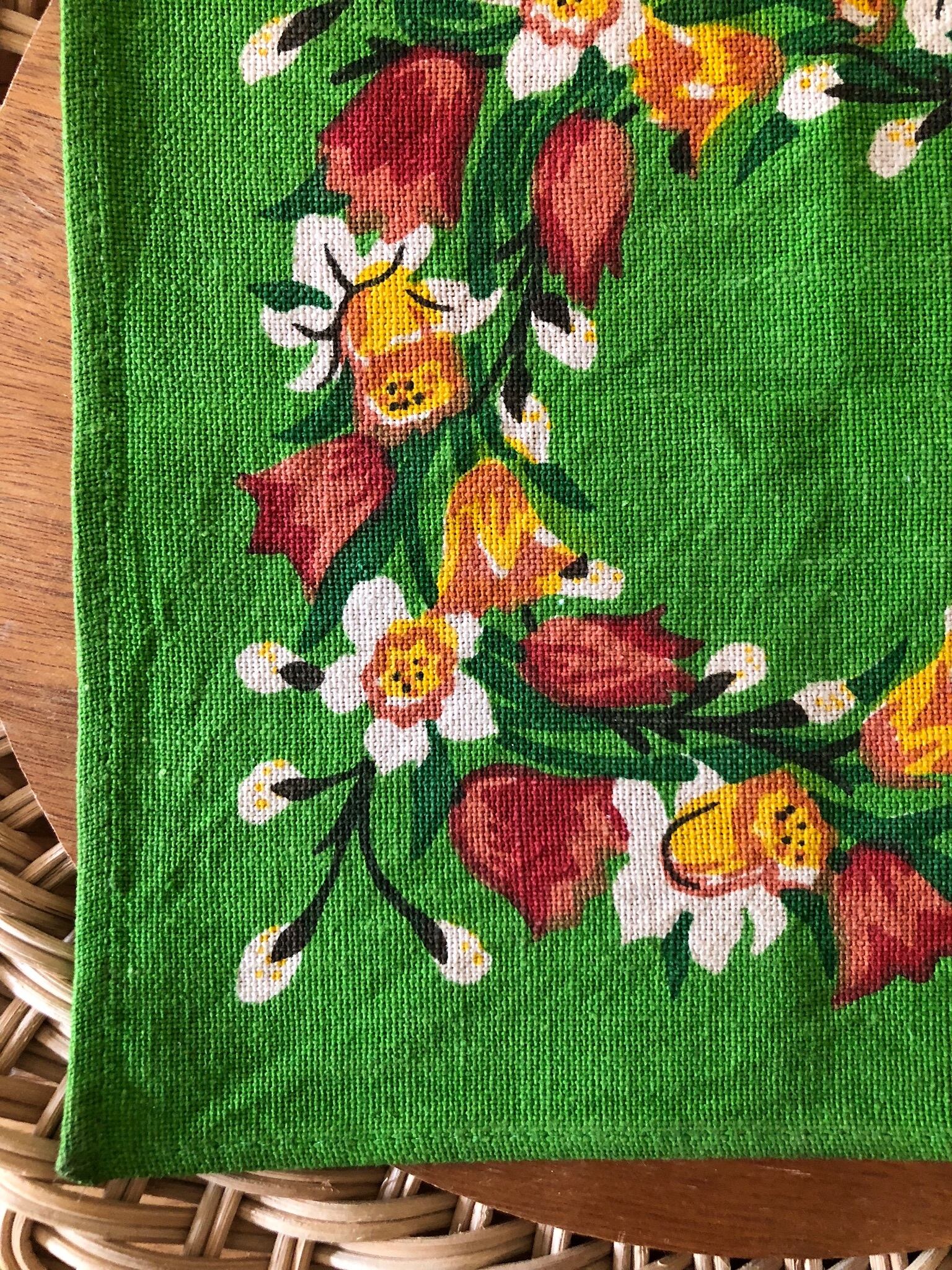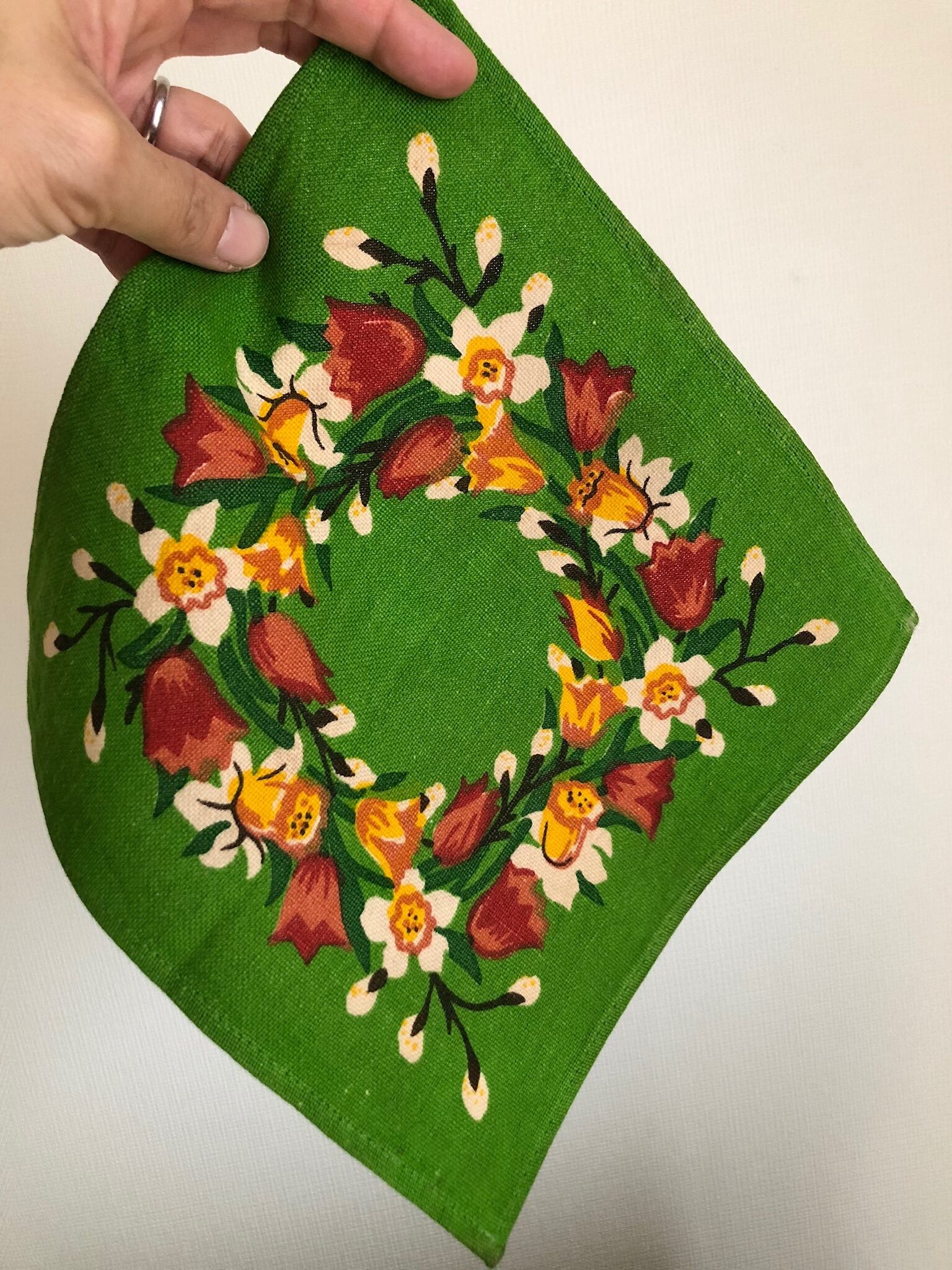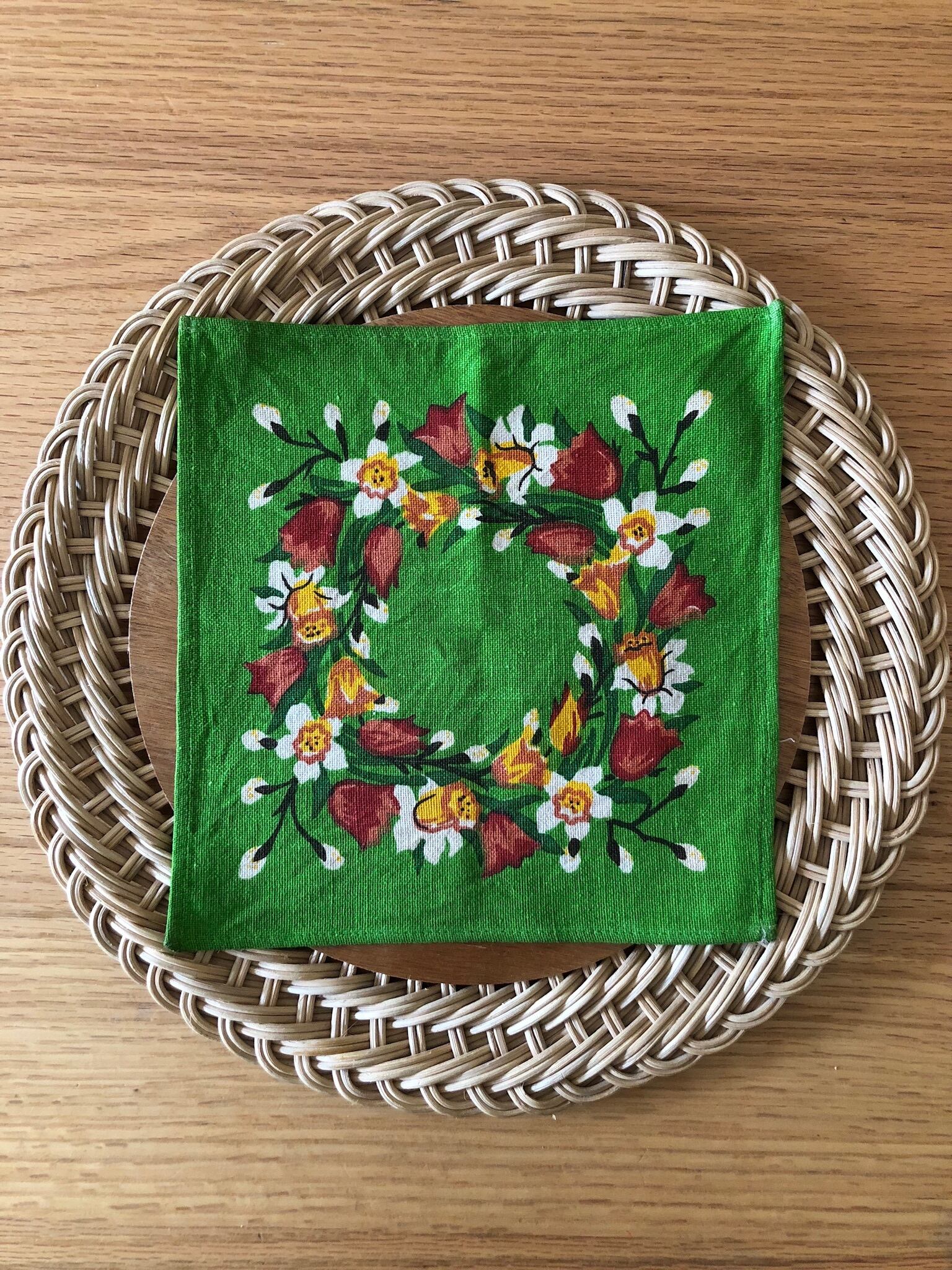 濃いグリーンをベースに、チューリップを中心に、春のお花がリース状に描かれた、可愛らしく春らしい1枚♫