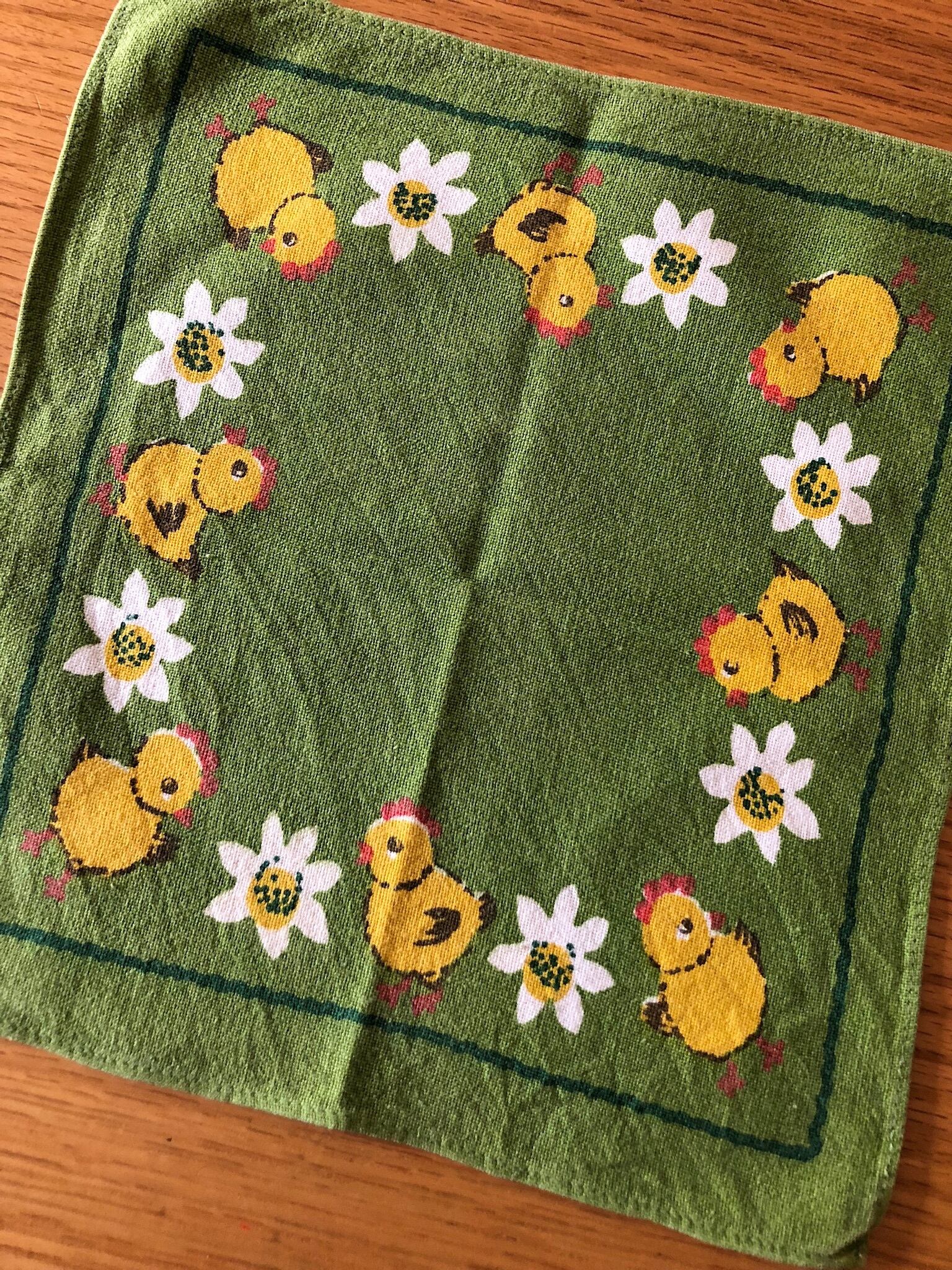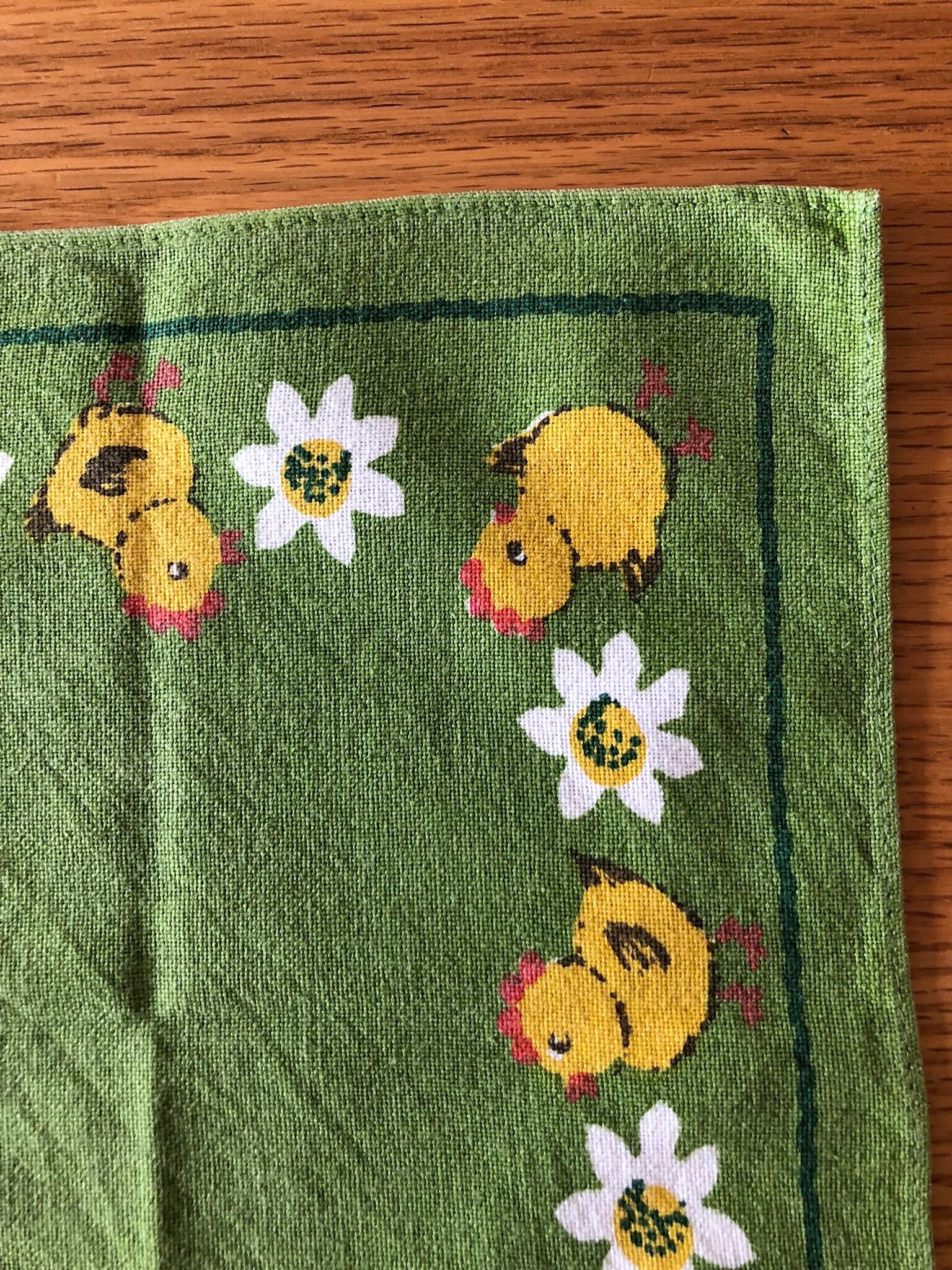 グリーンのコットン生地に、ヒヨコと白いお花のイースターの絵柄が可愛らしい1枚♫