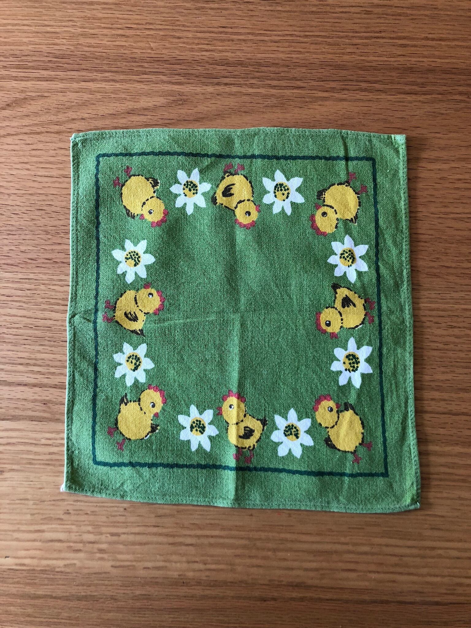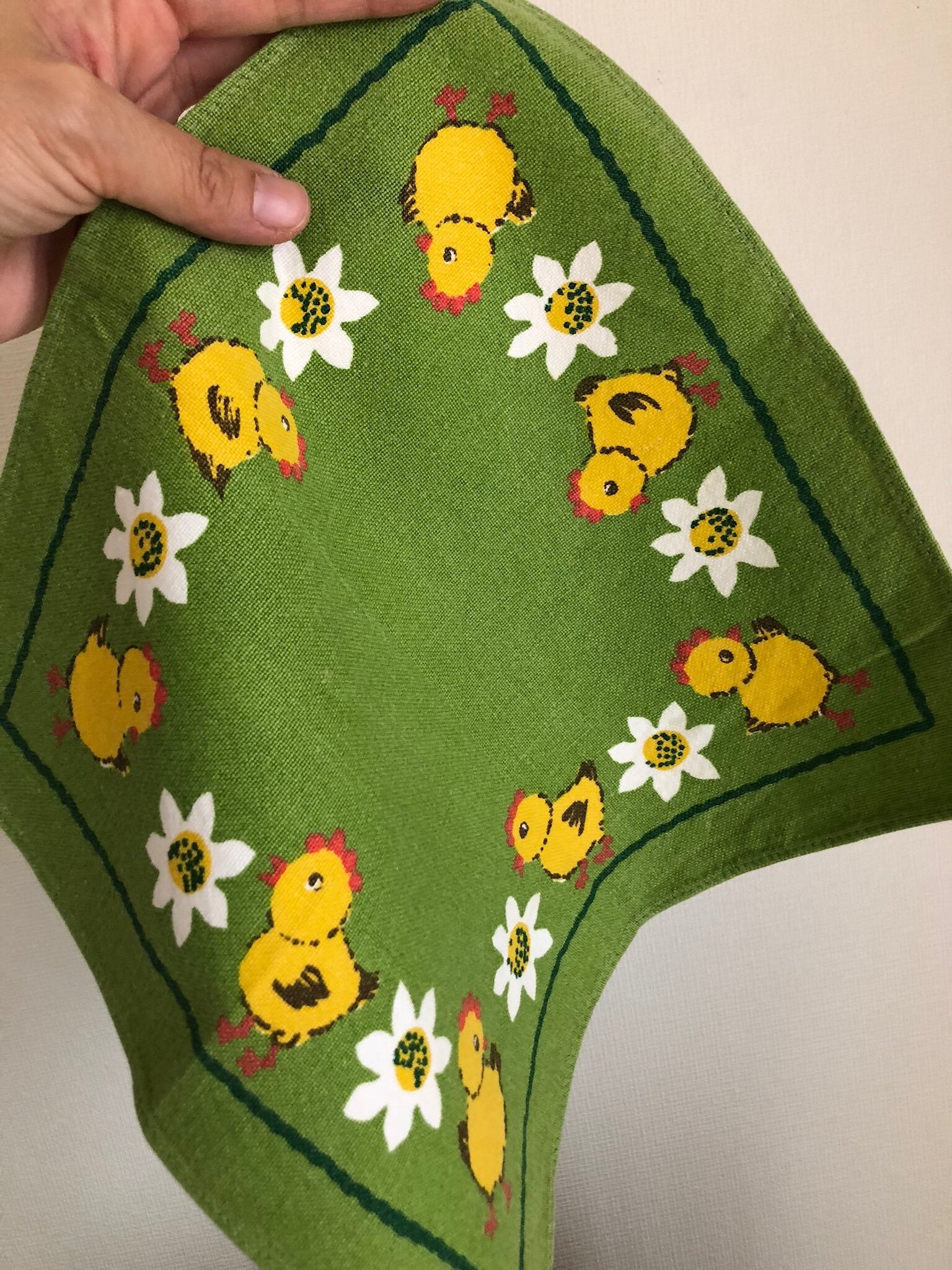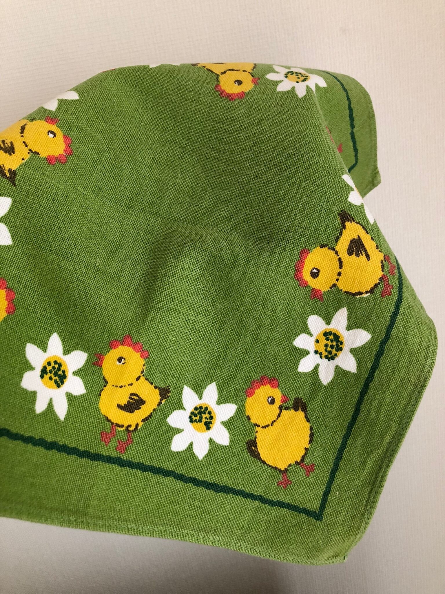 グリーンのコットン生地に、ヒヨコと白いお花のイースターの絵柄が可愛らしい1枚♫