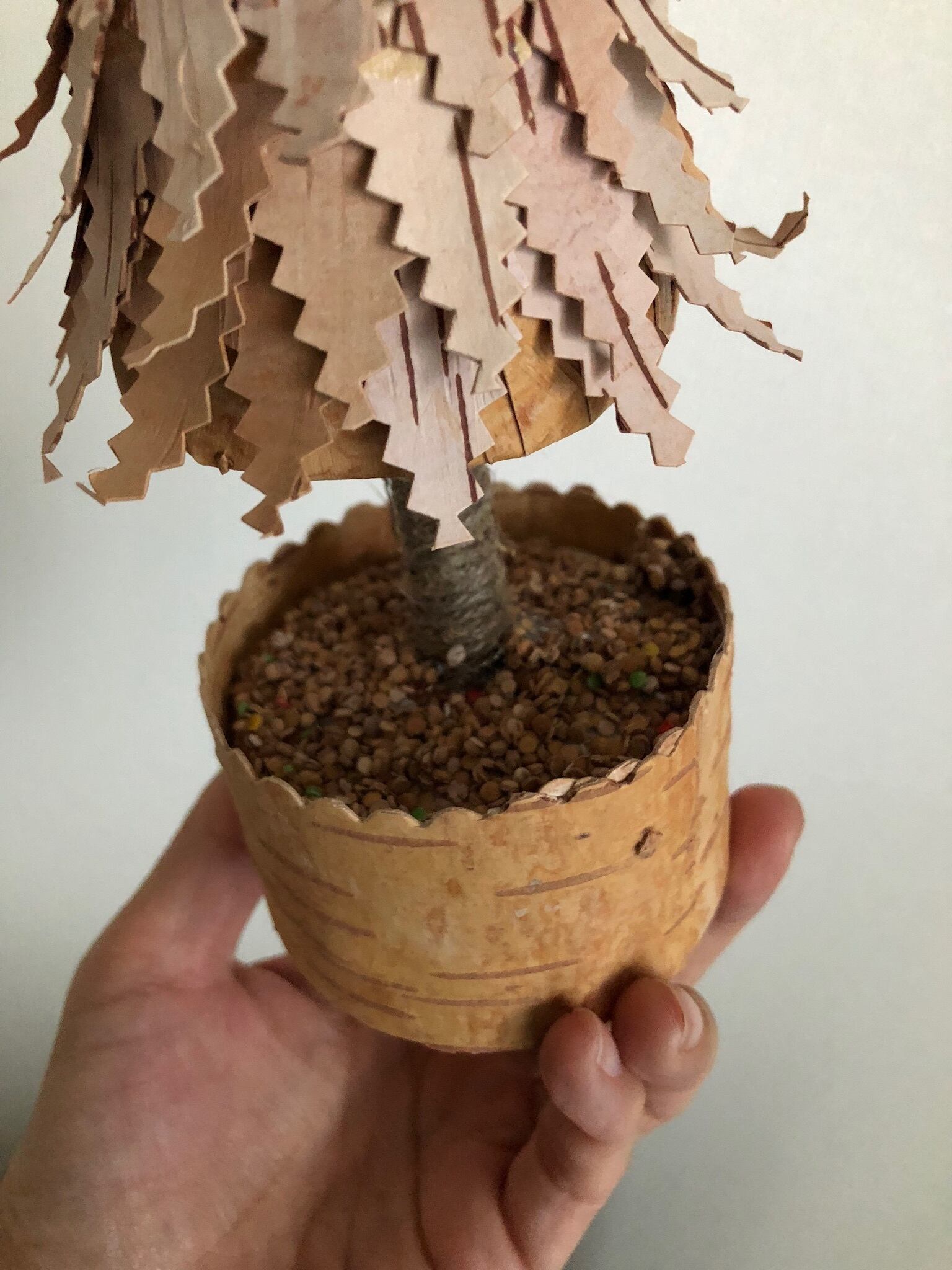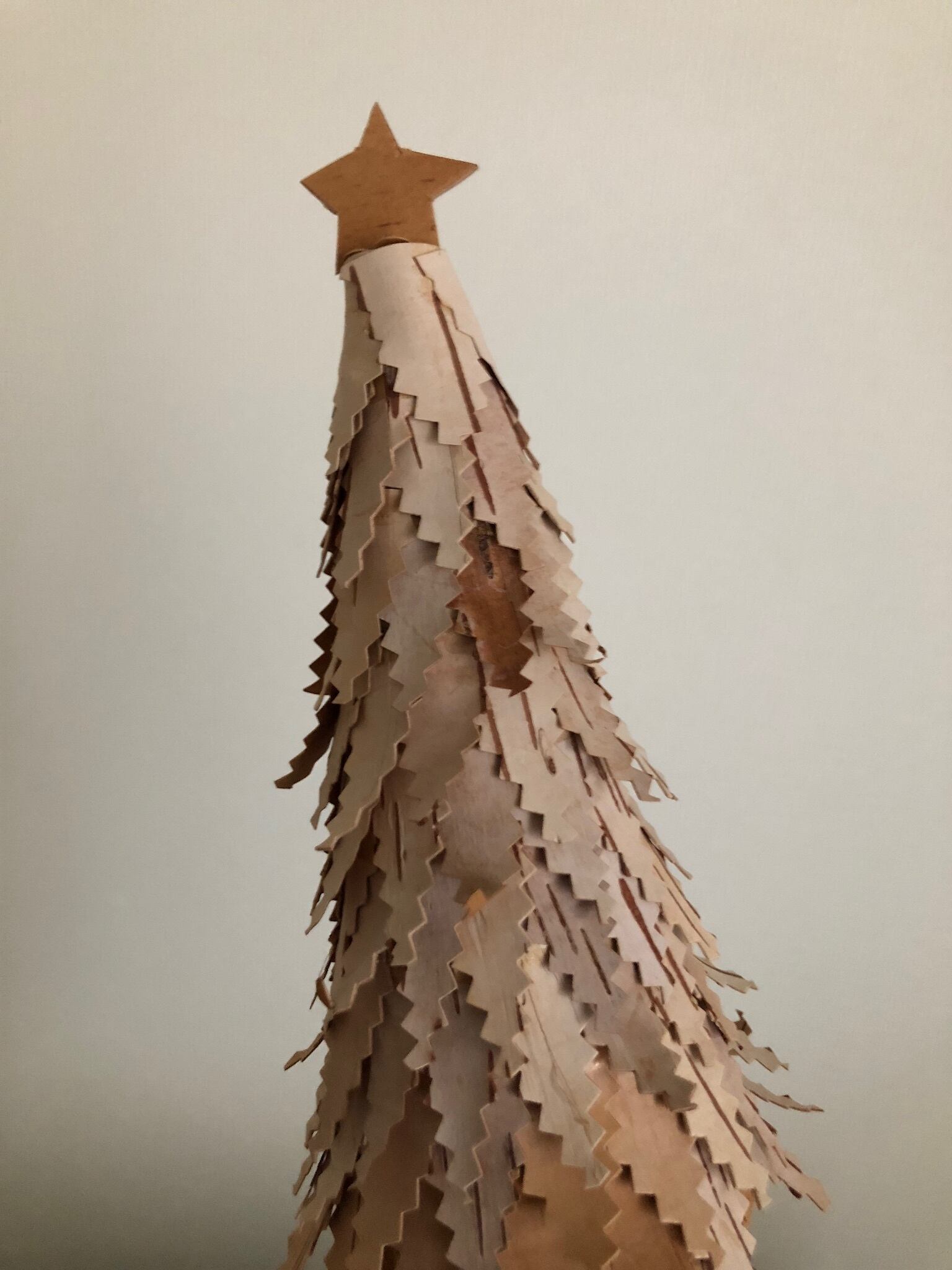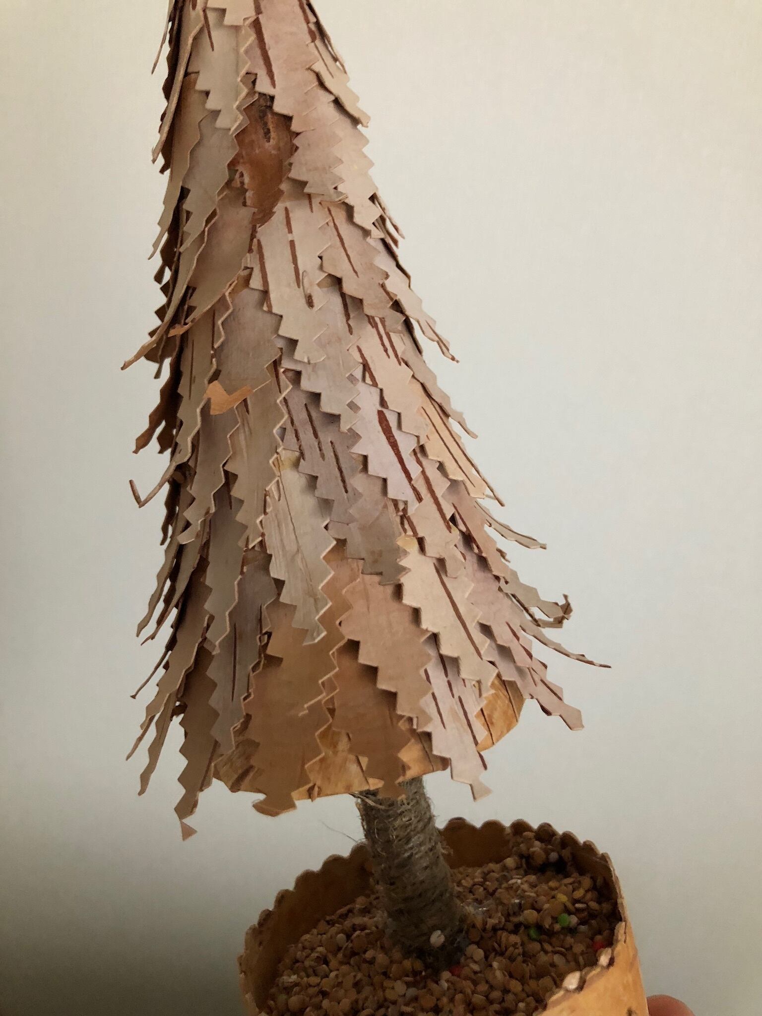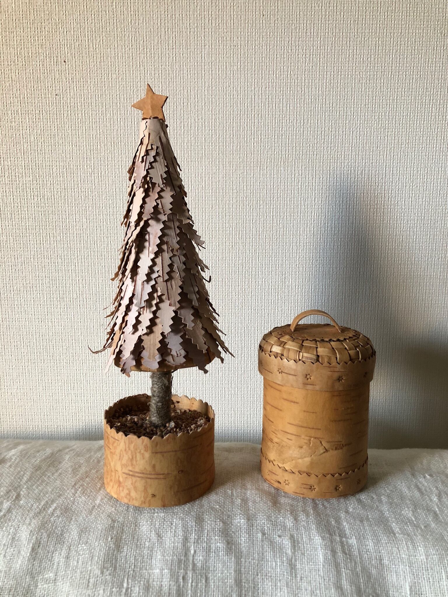 白樺の樹皮を重ねて作れられたとても凝った、白樺のツリー。木の幹は麻紐でしっかり巻かれており、鉢に入ったツリーと星がとても可愛らしいツリーのオブジェです。
