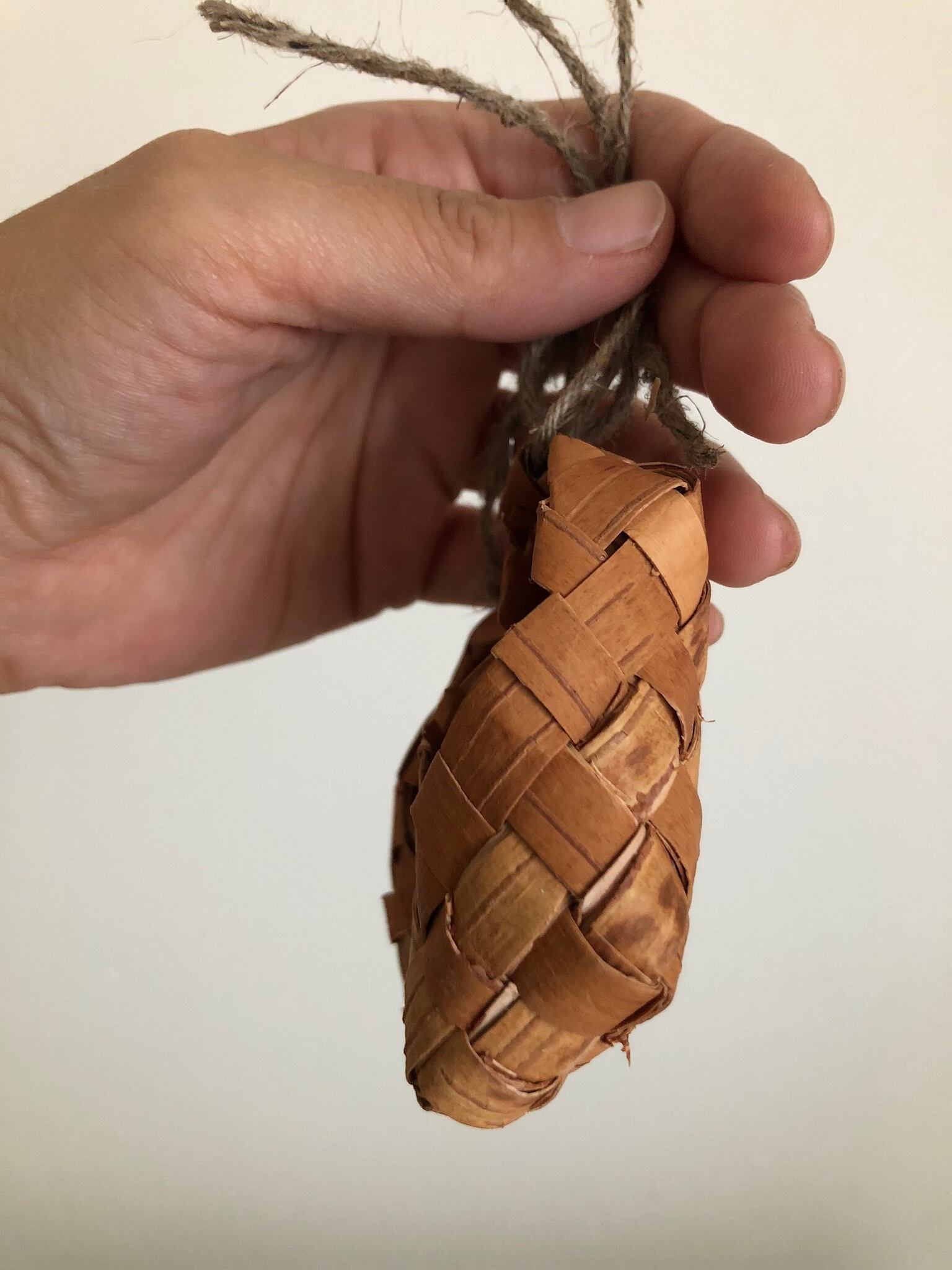 白樺の皮で編まれた靴のオーナメント。少し、甲浅で、幅広のタイプが、あまり見かけない、可愛らしい形です♫