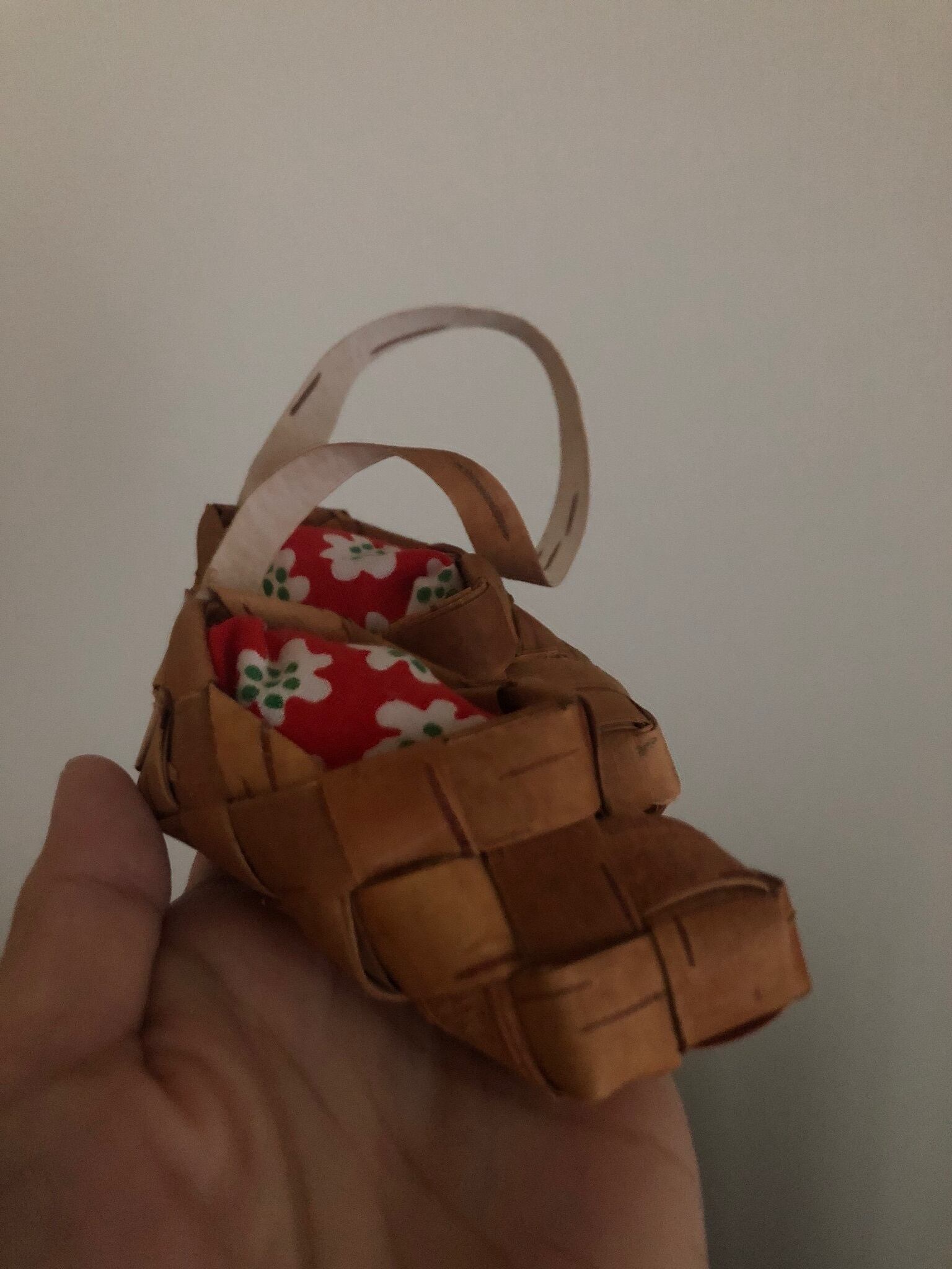 紐がわりの白樺の皮がクルンとなっているので、枝ツリーなど、空間があるところに飾って頂くのがおススメです。紐が気になる方は、薄い皮ですので、切って、白樺の靴のオブジェとして飾って頂いても。高さがあるので、ミニピンクッションなどにしても可愛いです♫