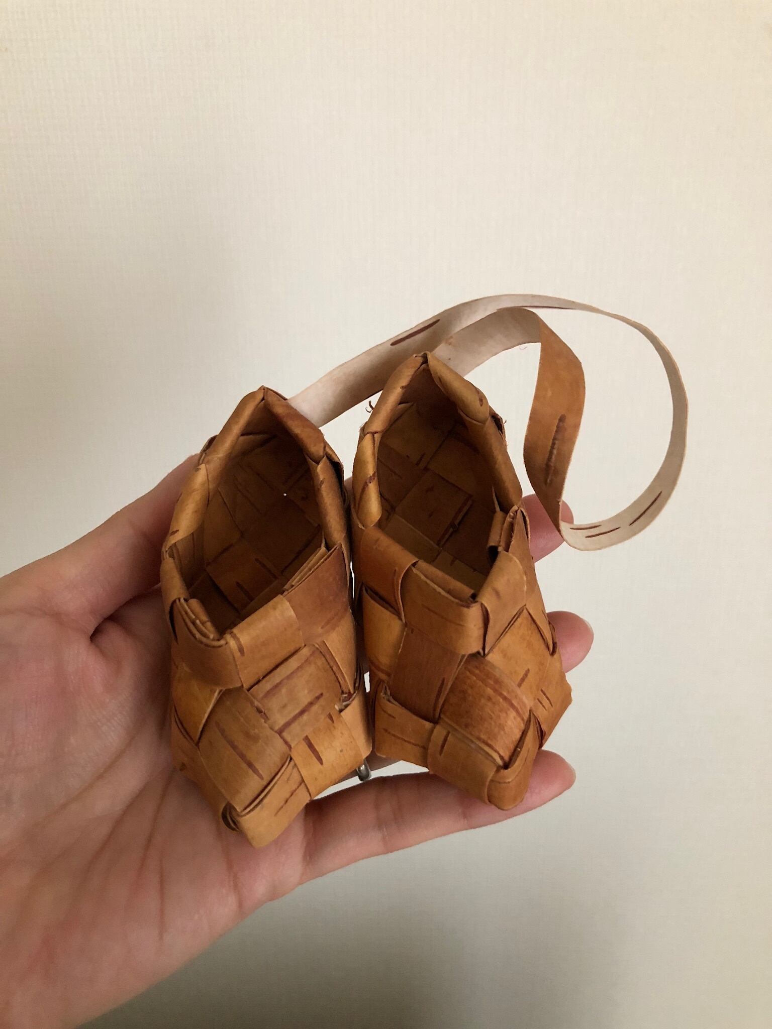 しっかりした白樺の皮で編まれた靴のオーナメントと、星型のモチーフ。