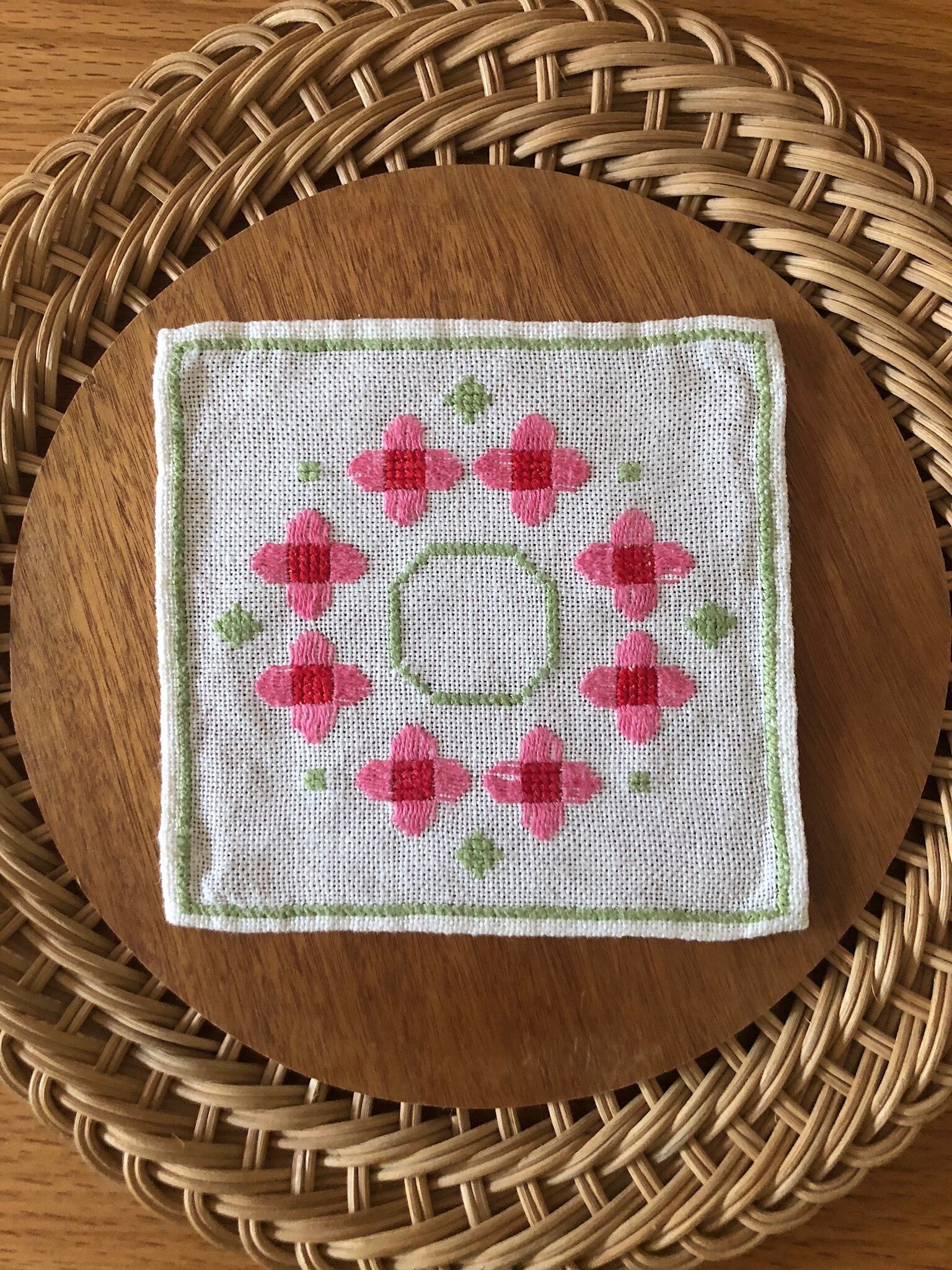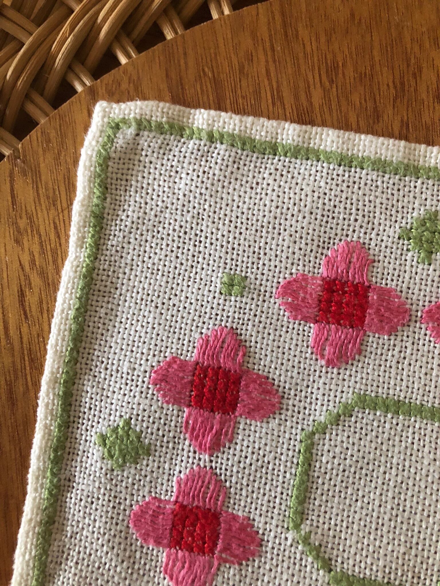 2北欧 ピンクのお花刺繍のリネンクロス ヴィンテージ