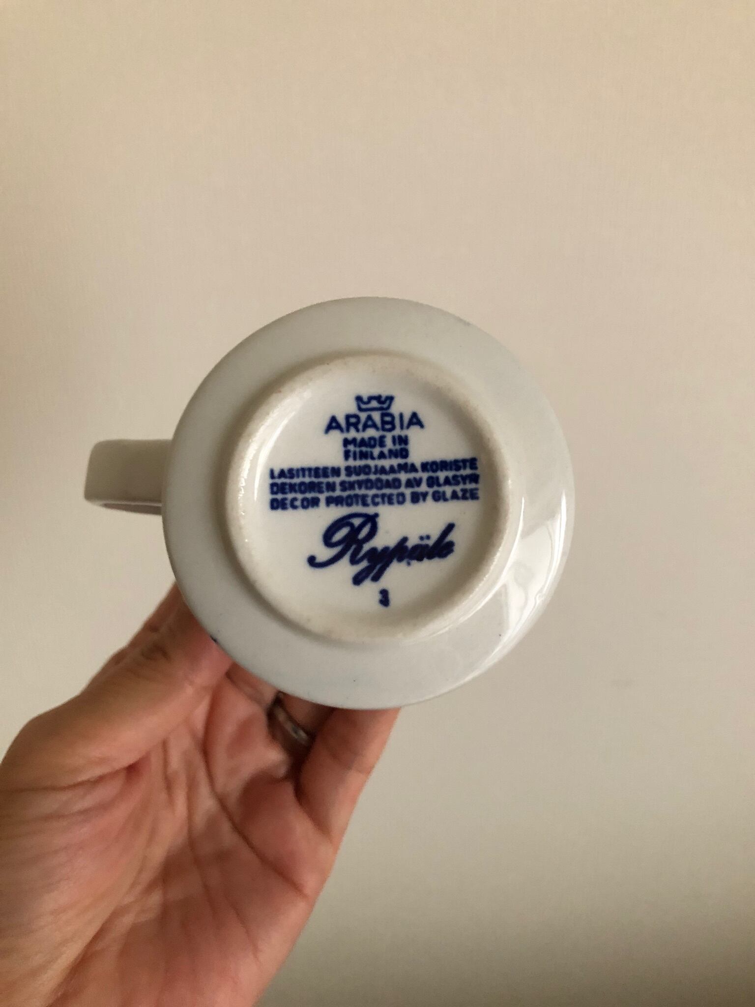 Raija Uosikkinen ライヤ・ウォシッキネン らしい、素朴で可愛いらしい絵のタッチが人気なRypaleシリーズ。製造期間も短いので、貴重な一品です。Rypale ルパレは、ベージュとブルーのは2色展開ですが、こちらはブルーになります。