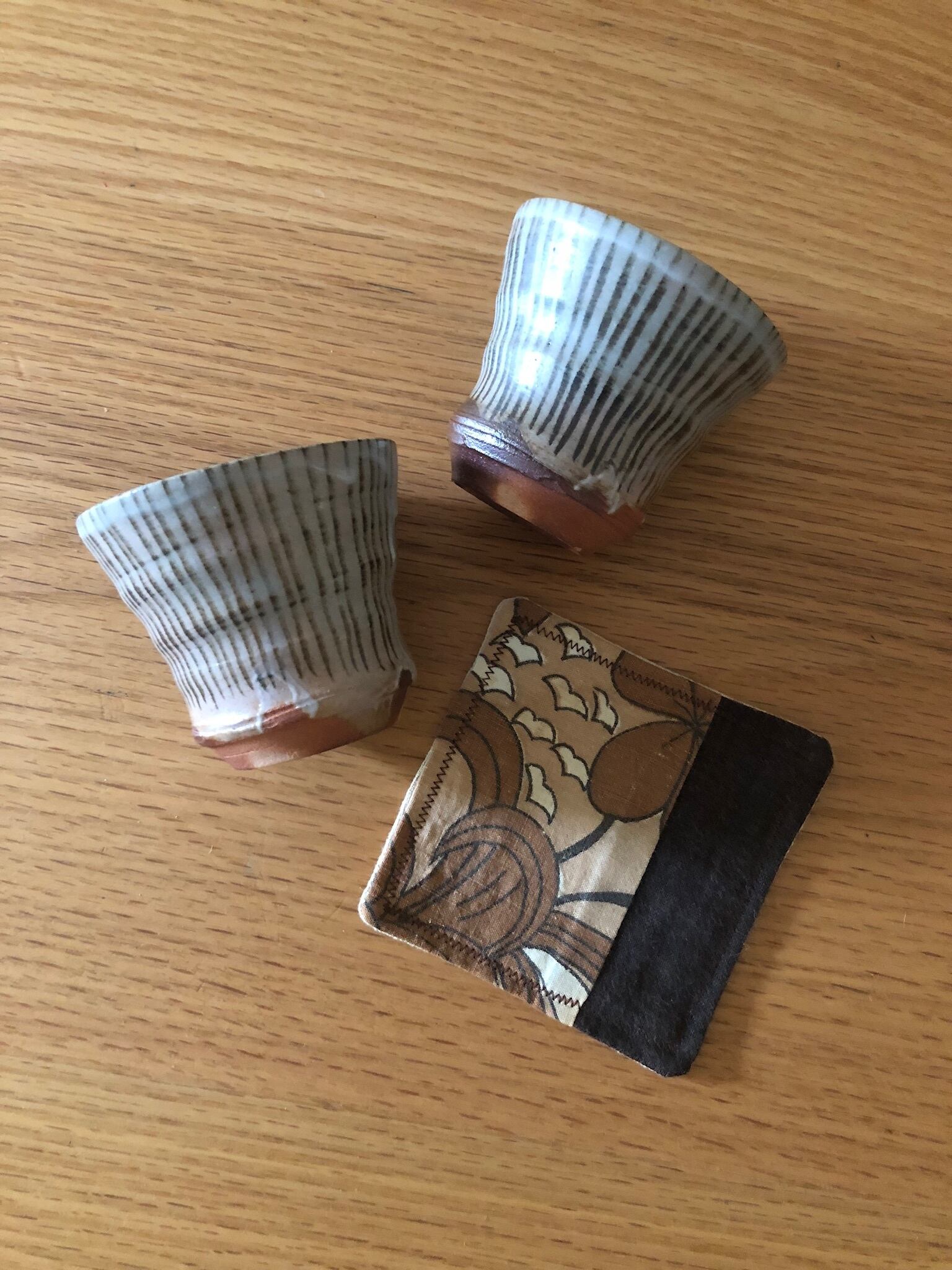 日本の作家さん作の、湯のみ 2点セットになります。おまけで、こちらの湯のみと合わせても可愛いヴィンテージ生地で作られたコースター、1枚お付けします♫