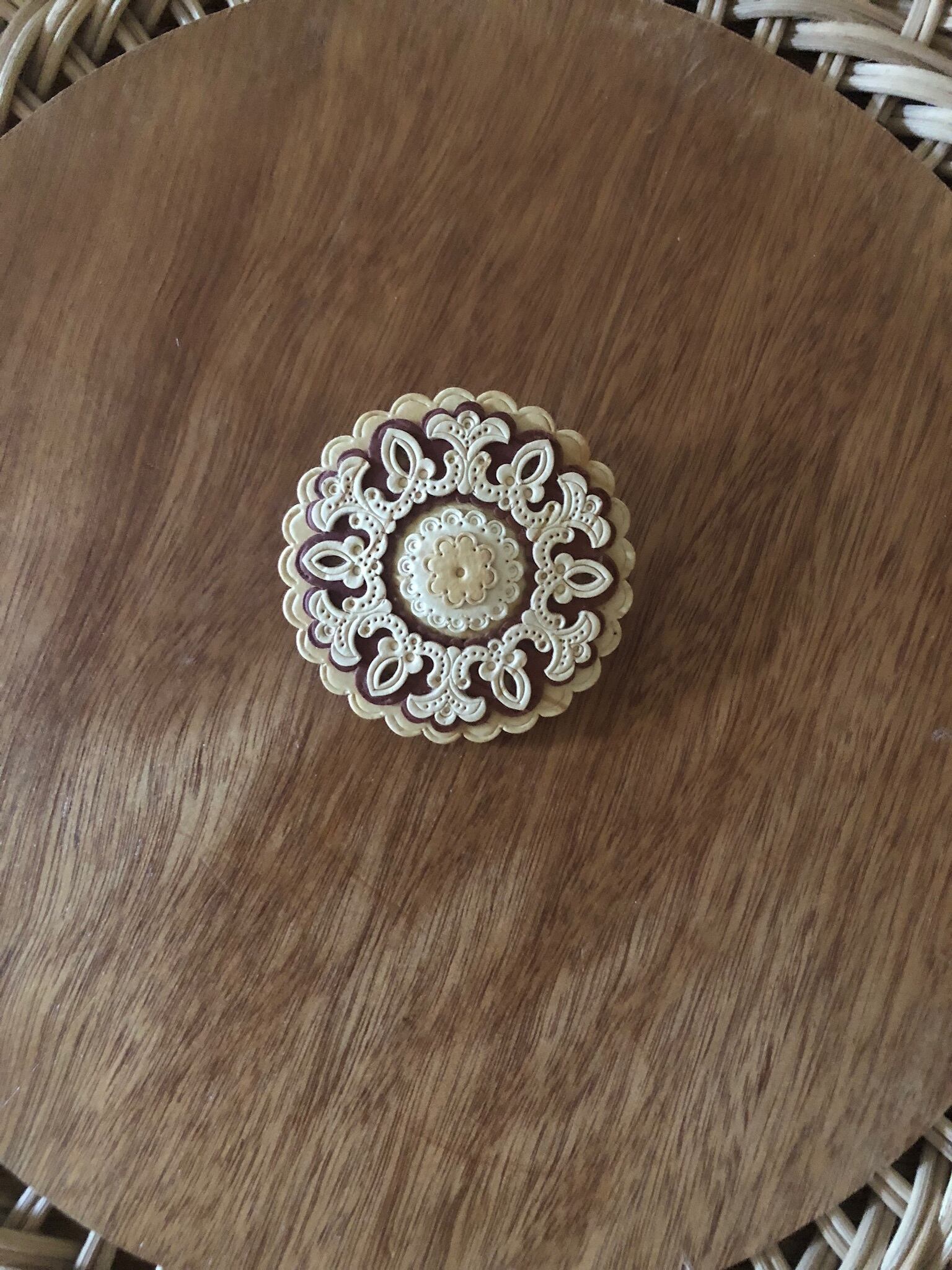どこか焼き菓子や、ケーキを思い起こさせる多重柄のベレスタ♫