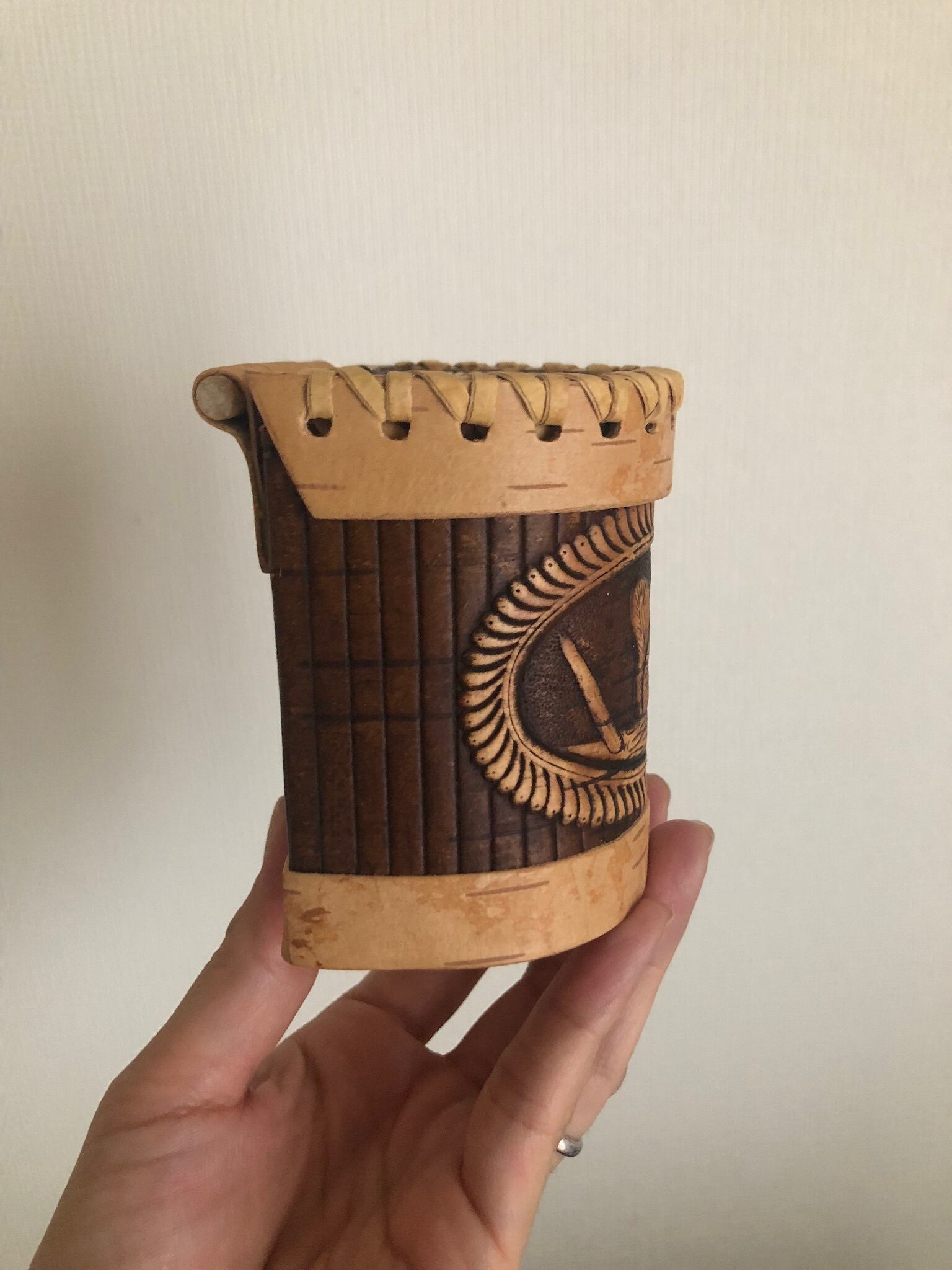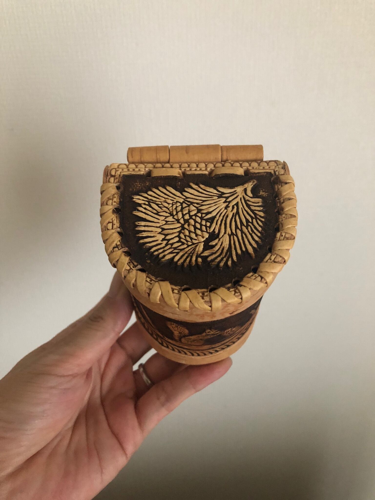 ロシアの白樺細工、ベレスタの型押しの蝶つがい型の蓋つきキャニスターになります。