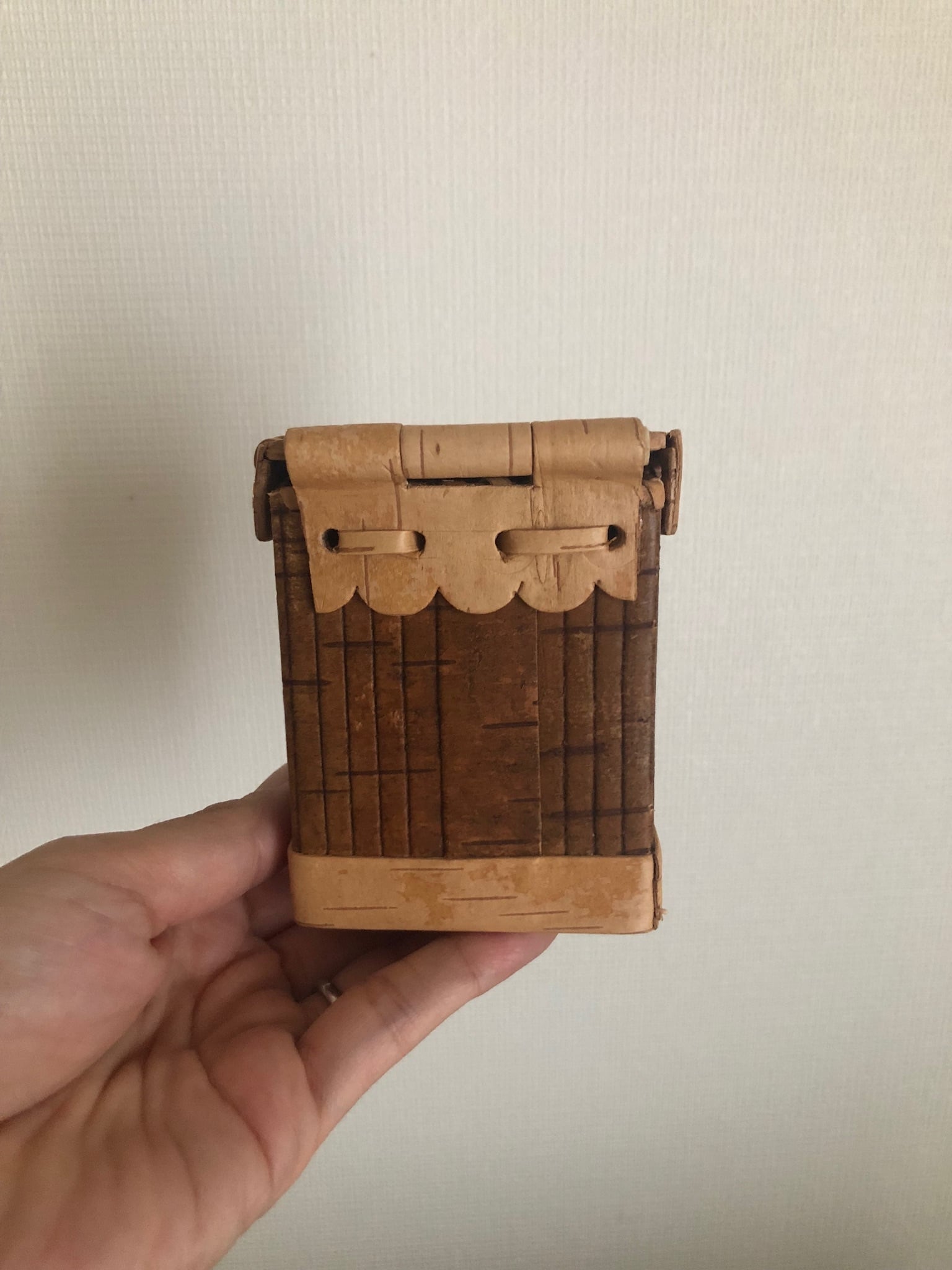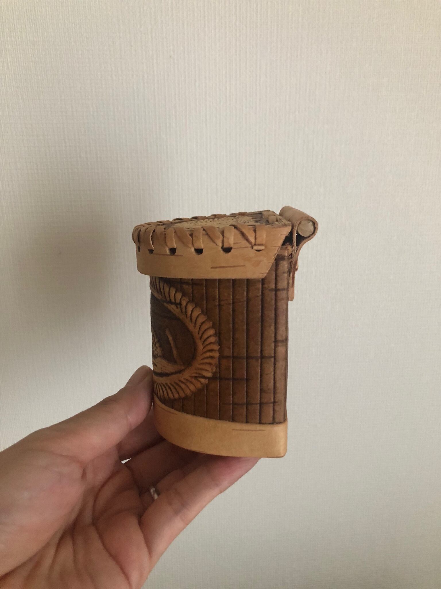ロシアの白樺細工、ベレスタの型押しの蝶つがい型の蓋つきキャニスターになります。