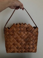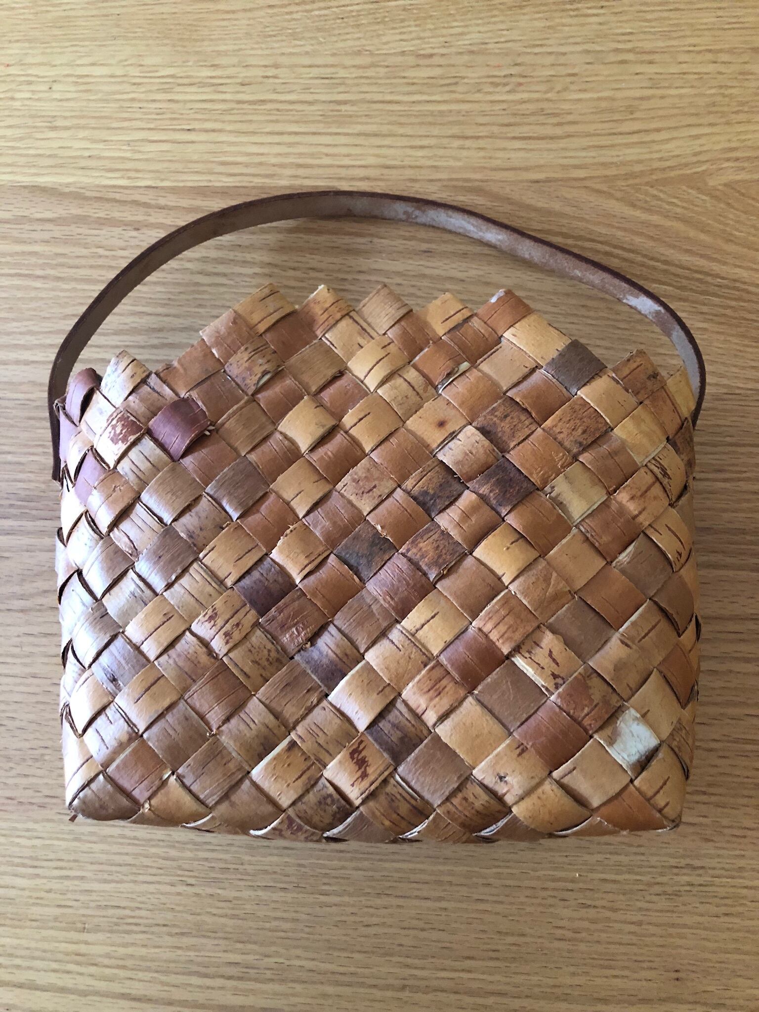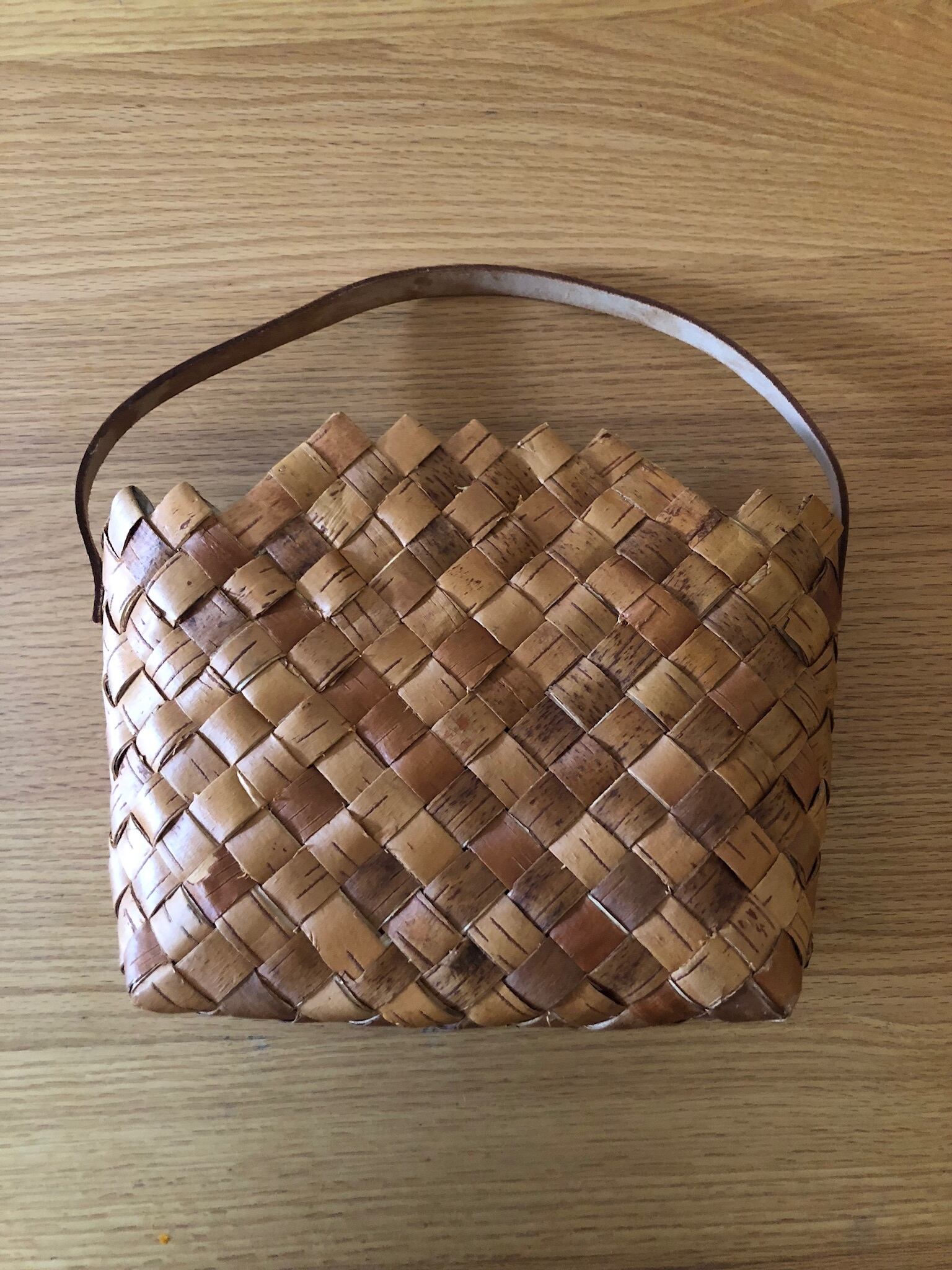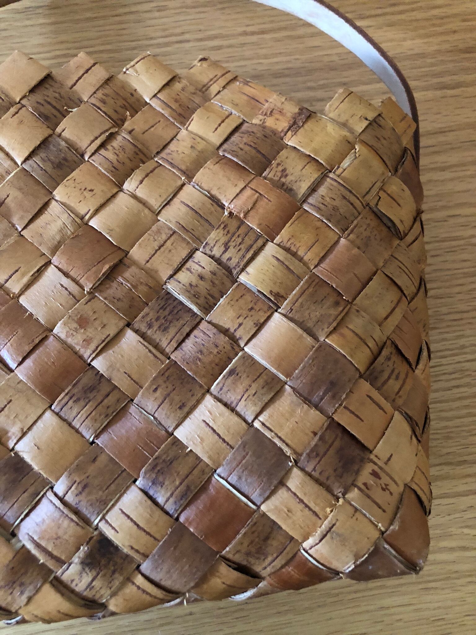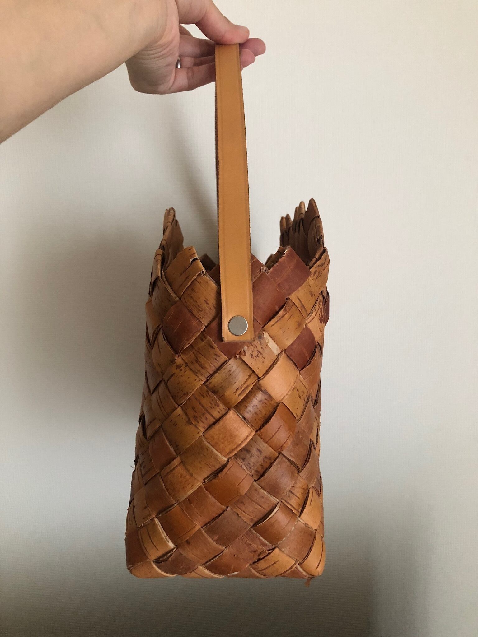 時を経て、こっくりとした色合いに変化した、素敵な白樺のバッグです。持ち手はレザーで、形もシンプルなので、いろいろな洋服のコーディネートにも合わせやすそうです♫