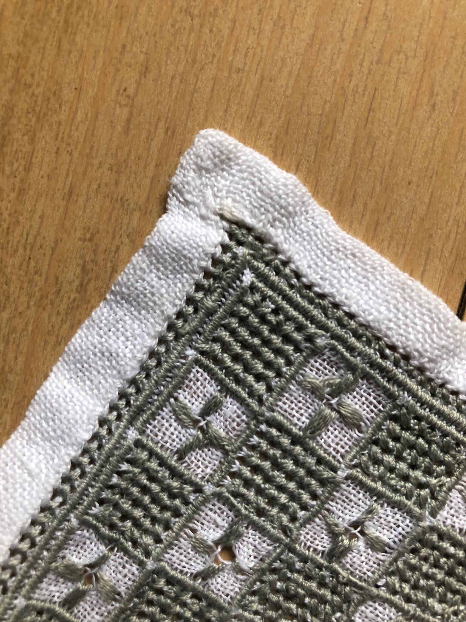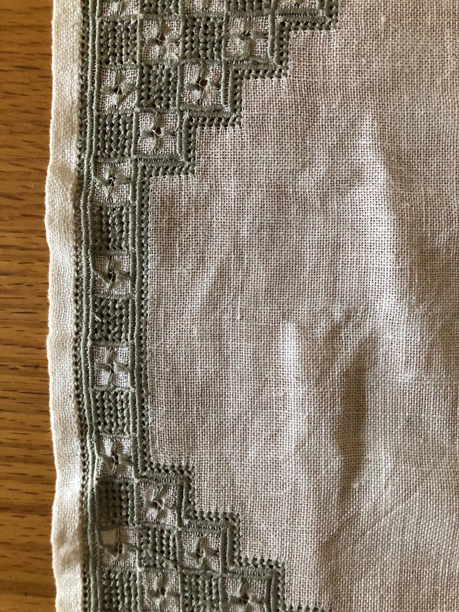 白のリネン生地に、スモーキーグレーの細かい刺繍がとても凝っていて、シックで素敵なリネンクロスです♫