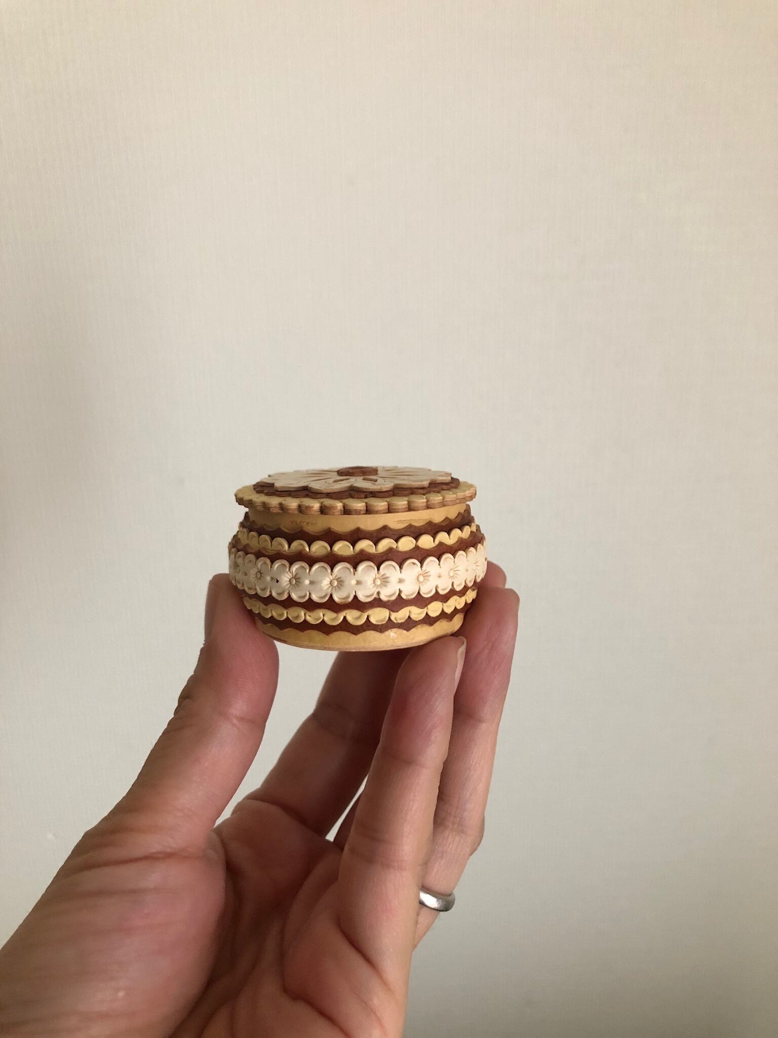 ロシアの白樺細工、ベレスタの多重柄のとても小さなキャニスターなります。