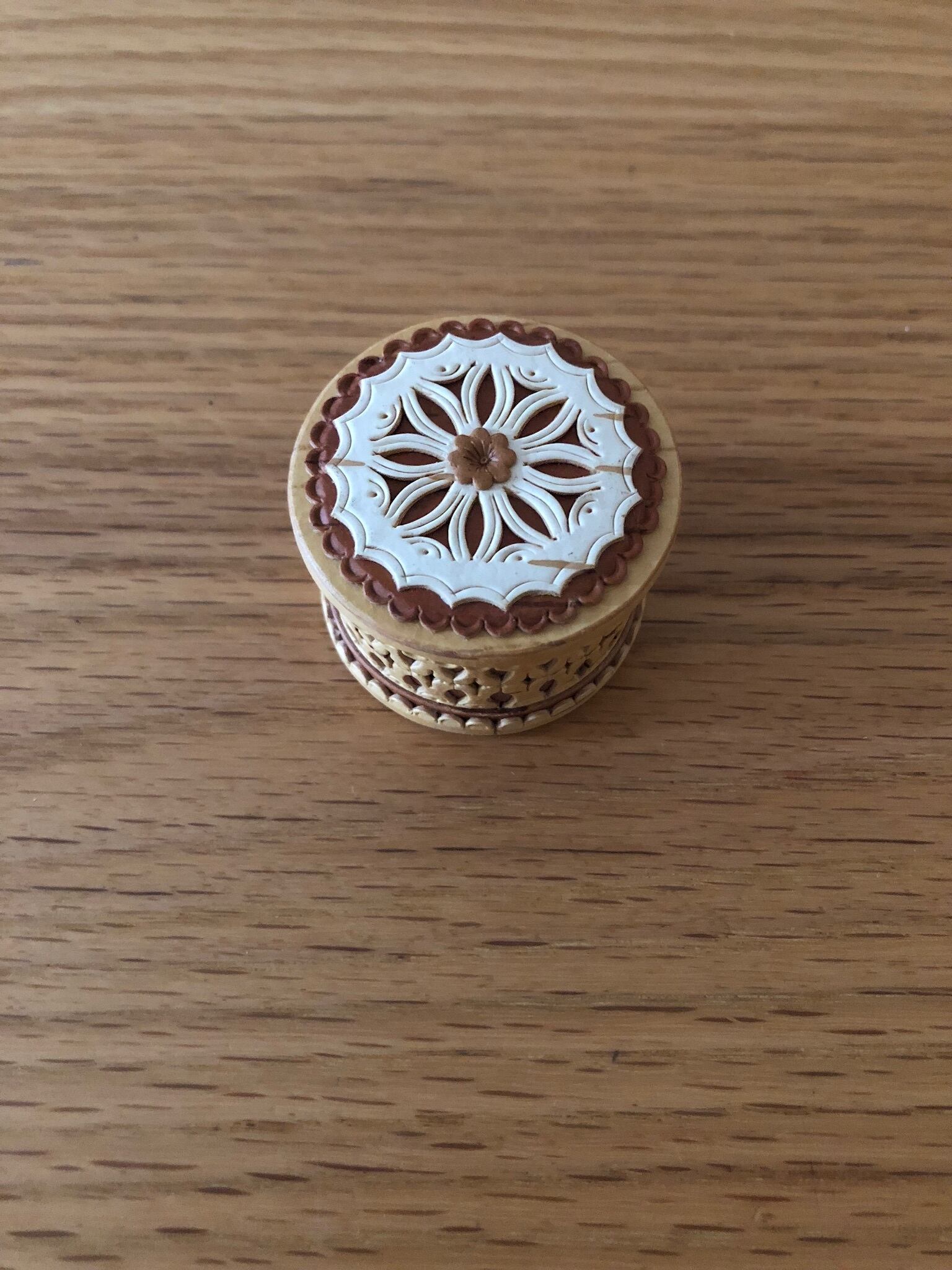 ロシアの白樺細工、ベレスタの多重柄のとても小さなキャニスターなります。