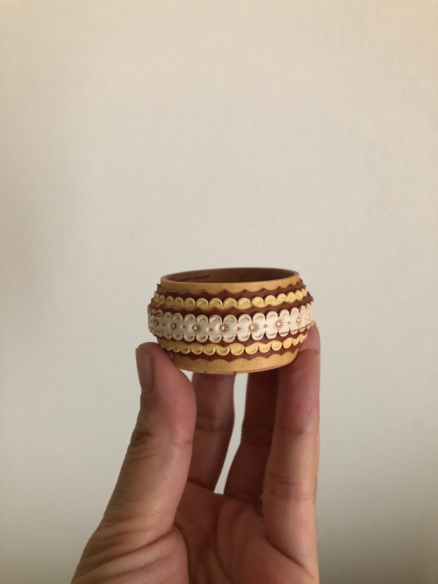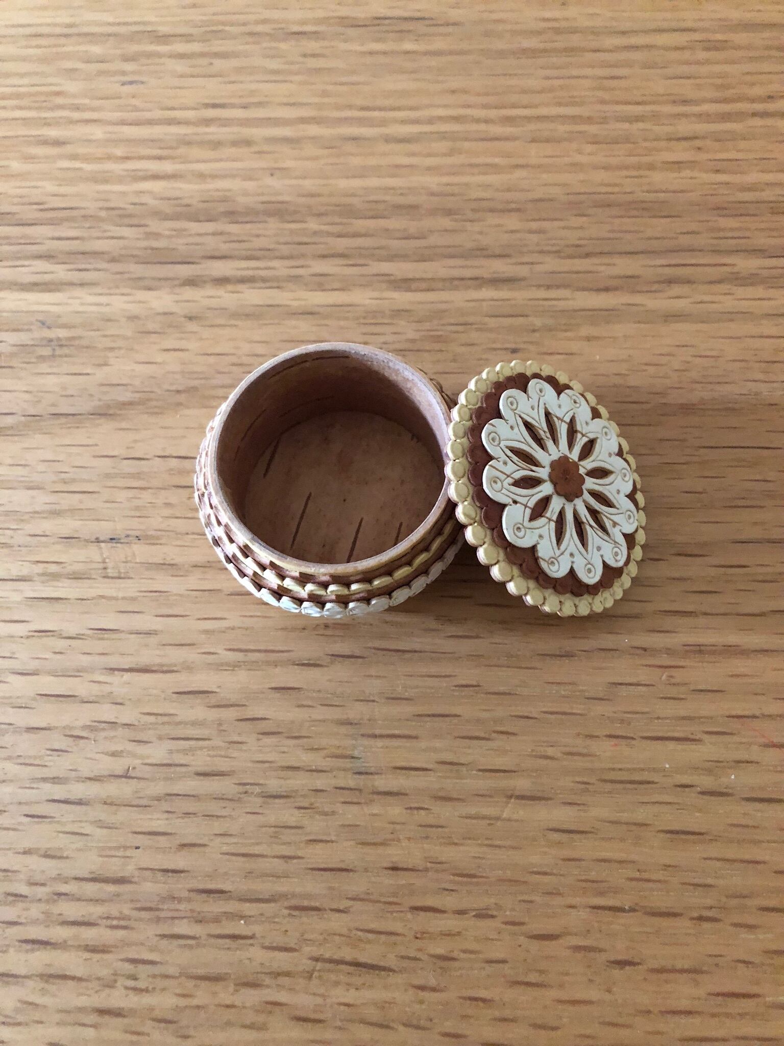 ロシアの白樺細工、ベレスタの多重柄のとても小さなキャニスターなります。