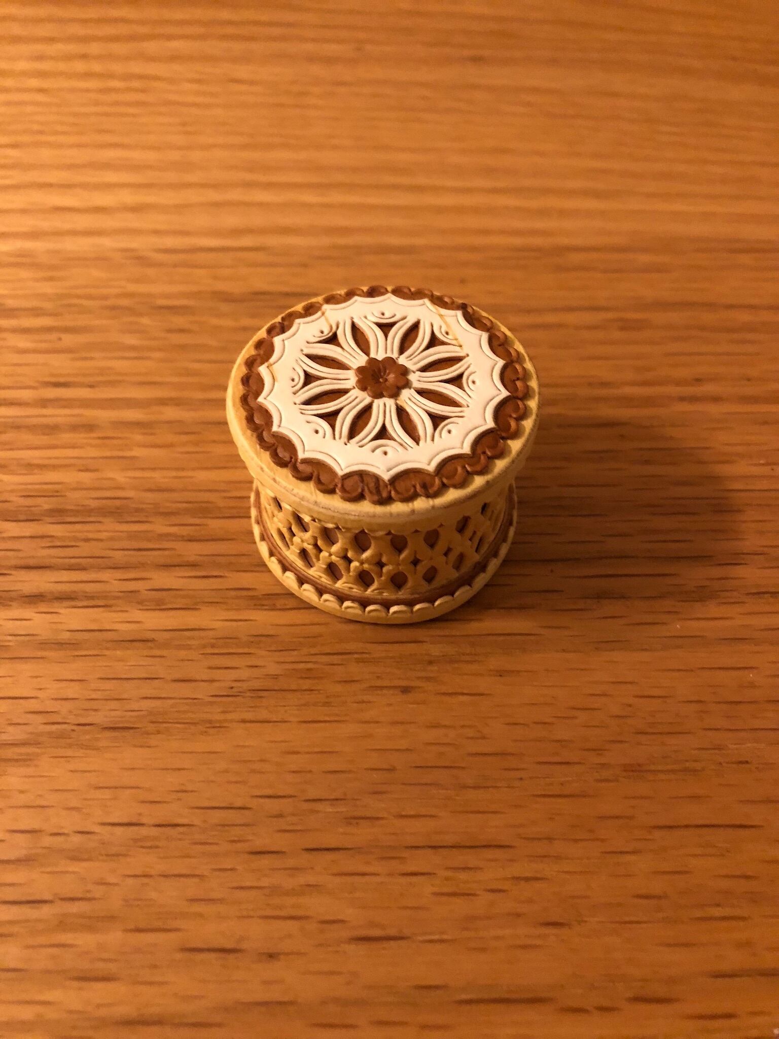 ロシアの白樺細工、ベレスタの多重柄のとても小さなキャニスターなります。