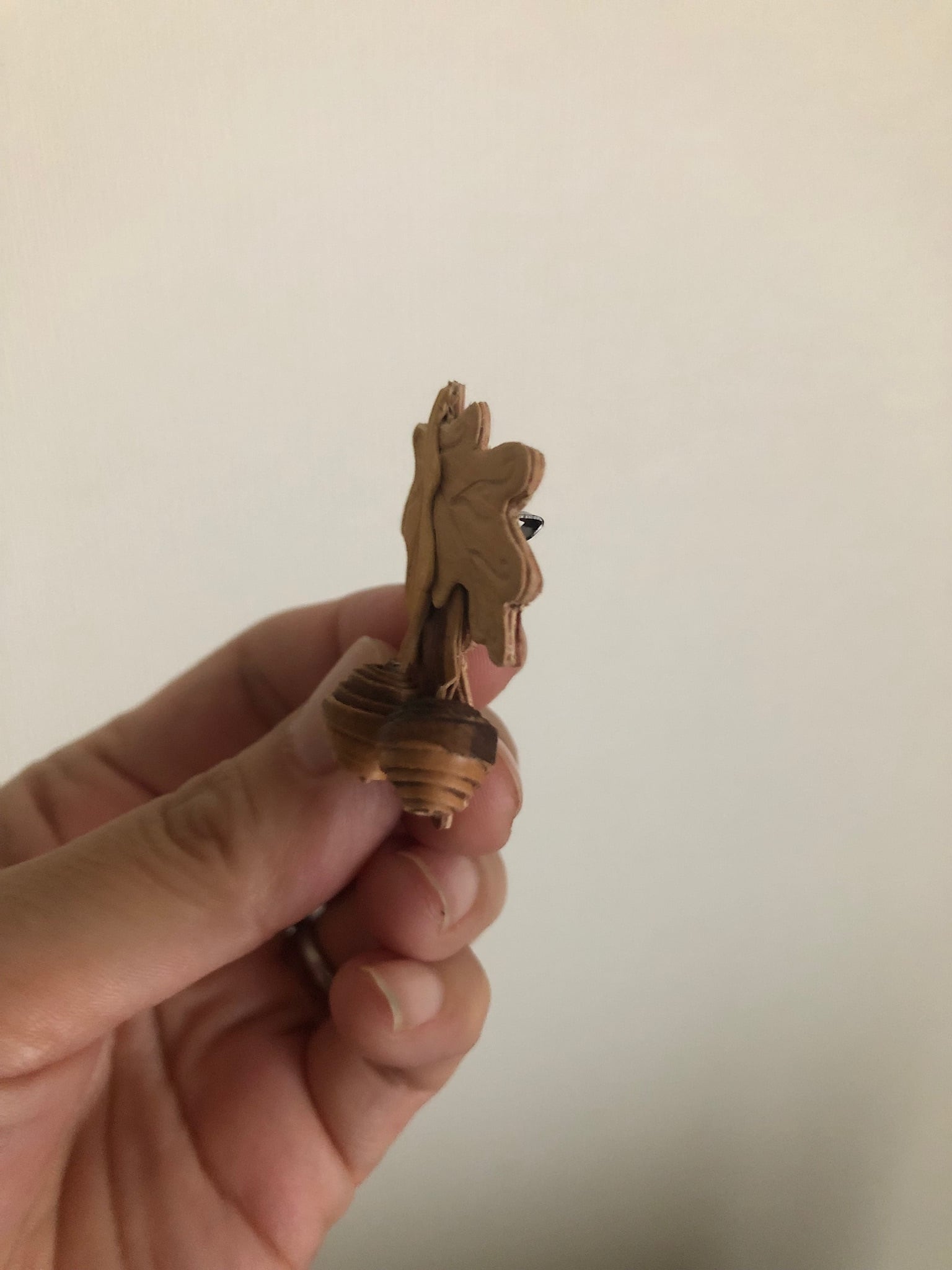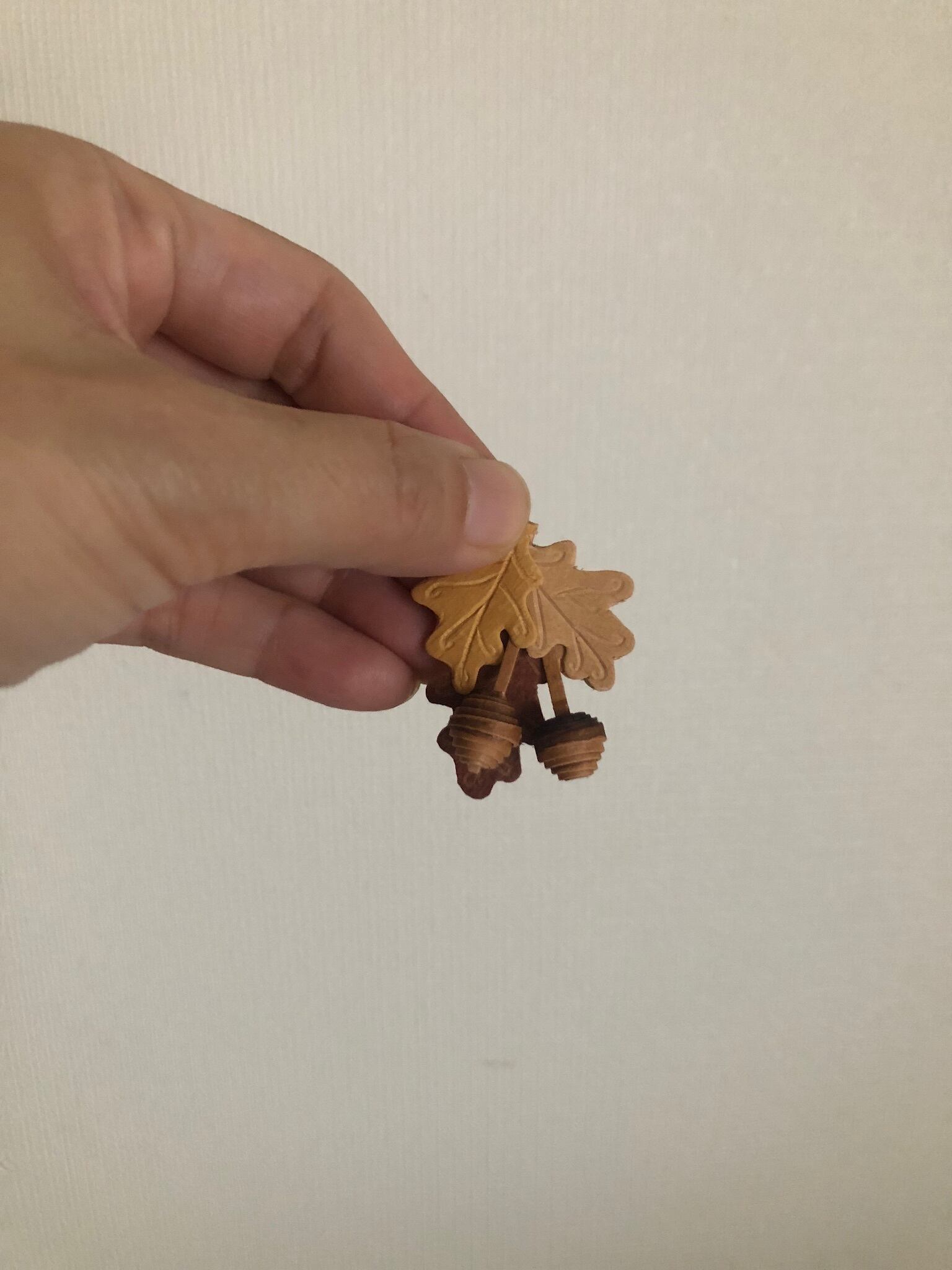白樺の樹皮を重ねて作られた可愛いらしいどんぐりのブローチ。