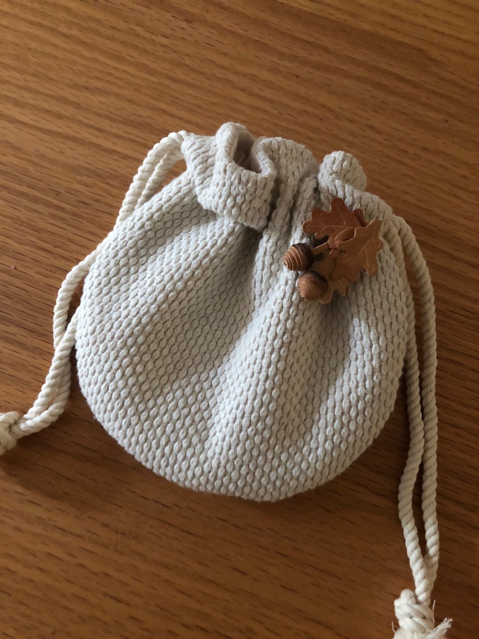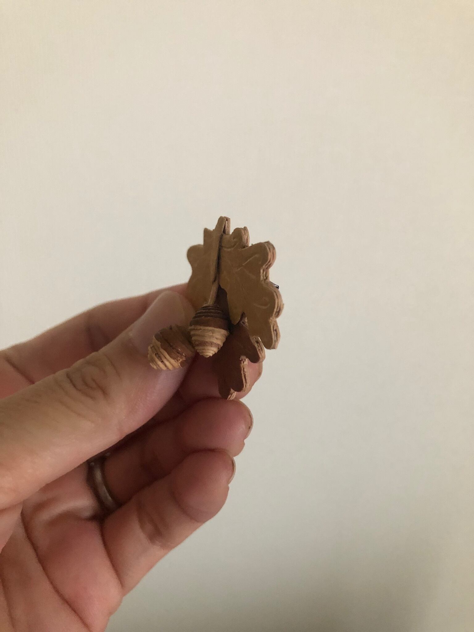 白樺の樹皮を重ねて作られた可愛いらしいどんぐりのブローチ。