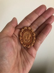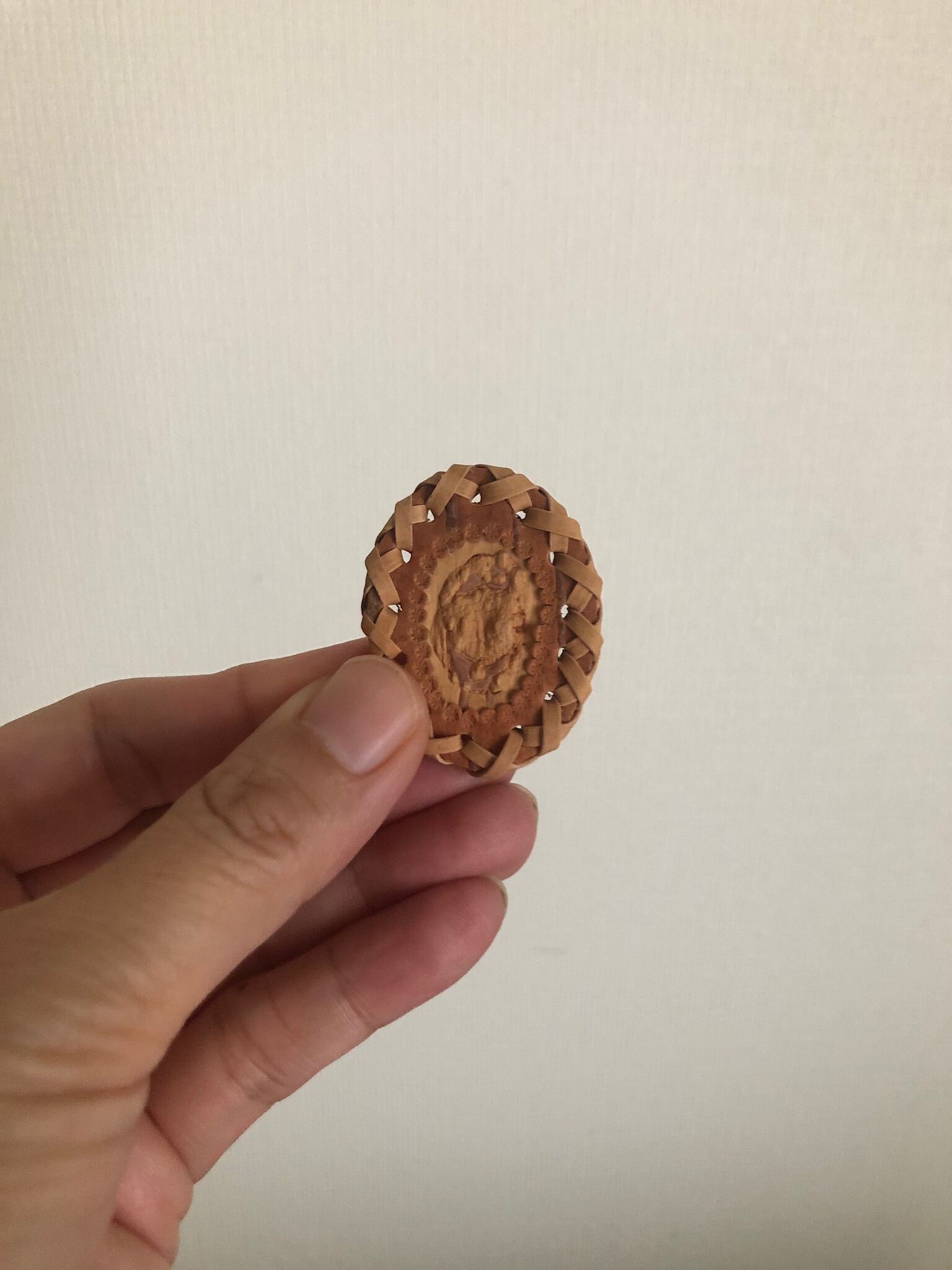 白樺の樹皮を重ねて作られた可愛いらしい楕円型のブローチ。縁かがりがまたポイント♫