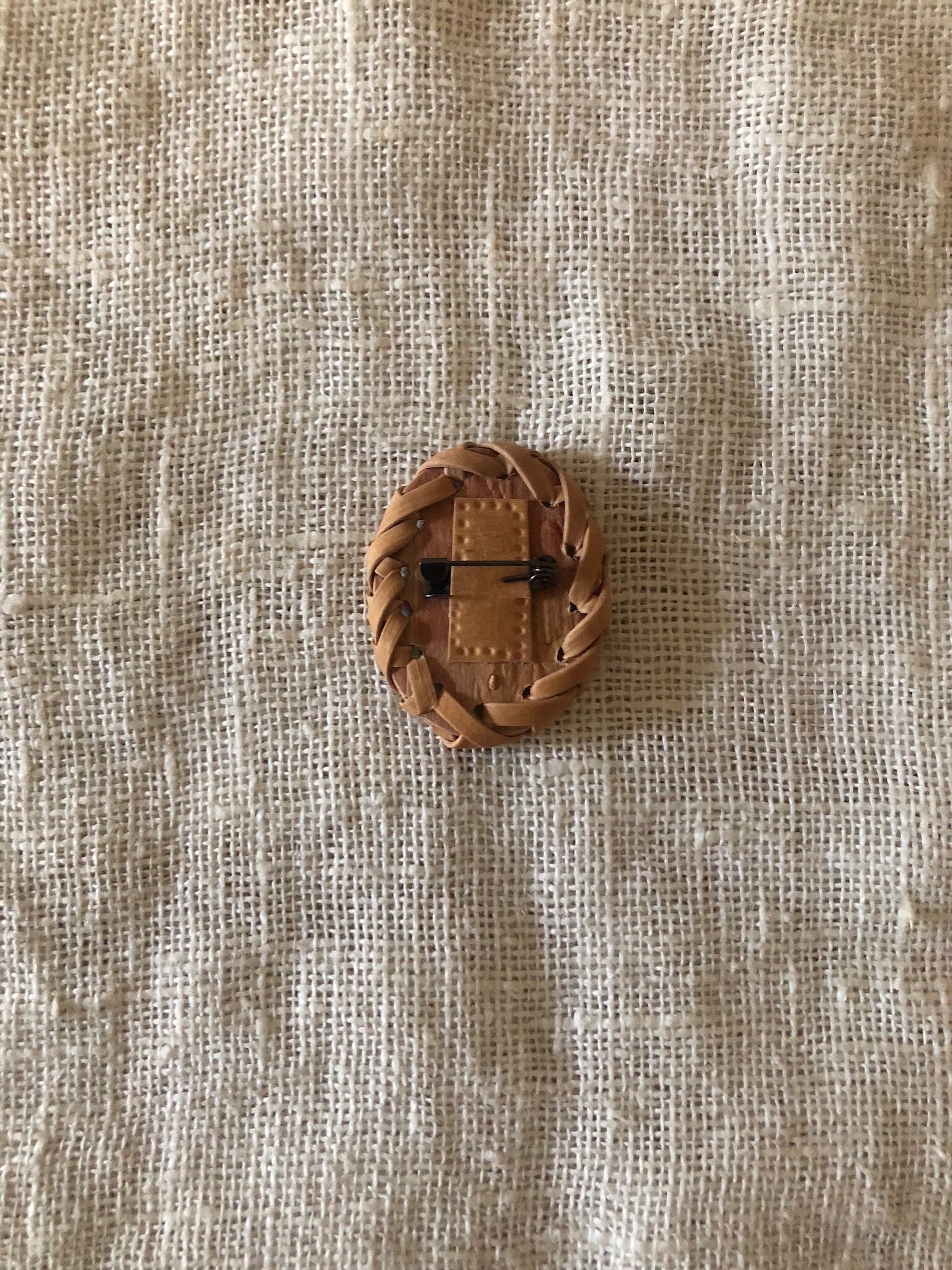白樺の樹皮を重ねて作られた可愛いらしい楕円型のブローチ。縁かがりがまたポイント♫