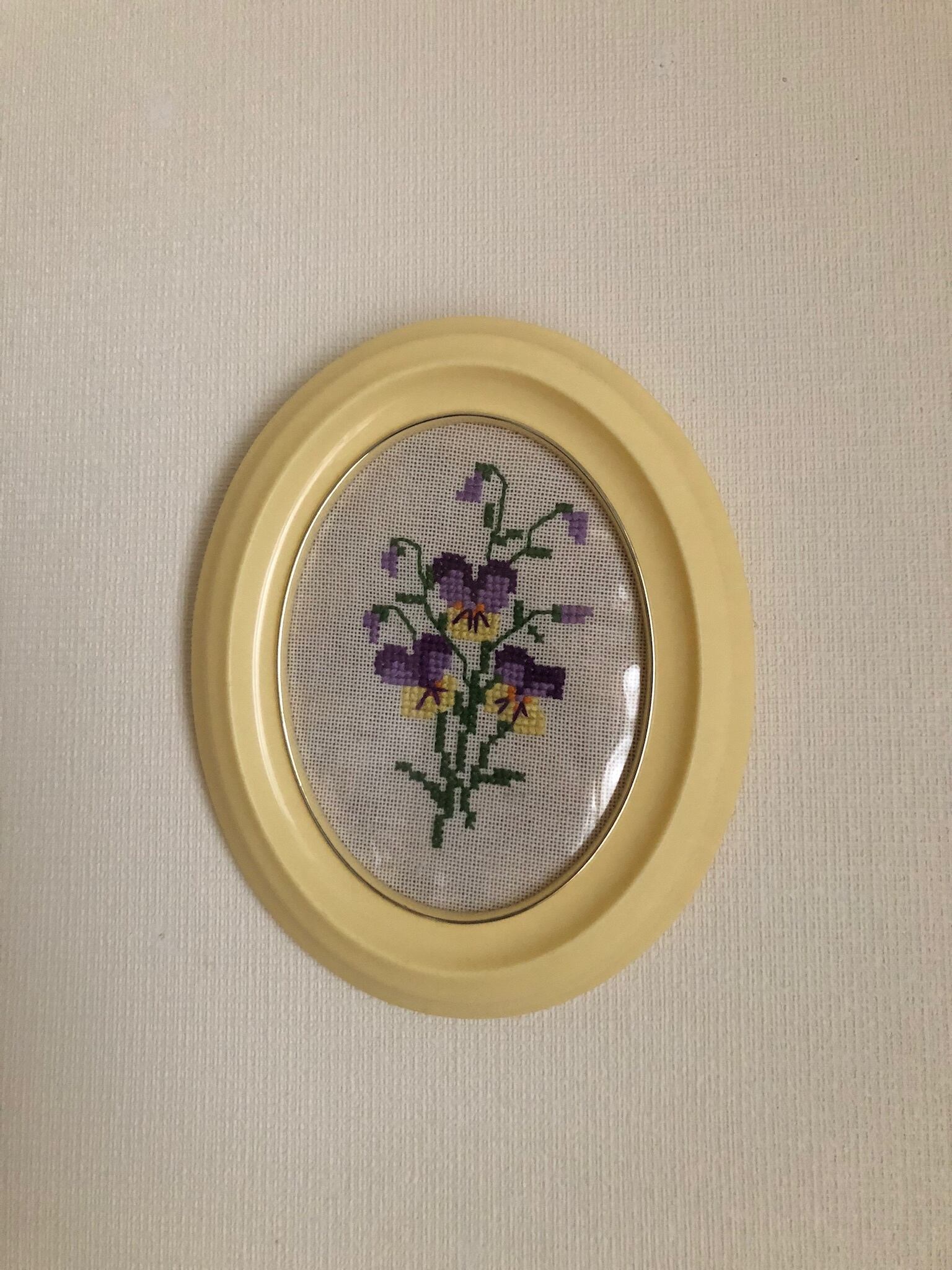 北欧 スウェーデン 丸額入りリネン刺繍飾り ビオラ ヴィンテージ