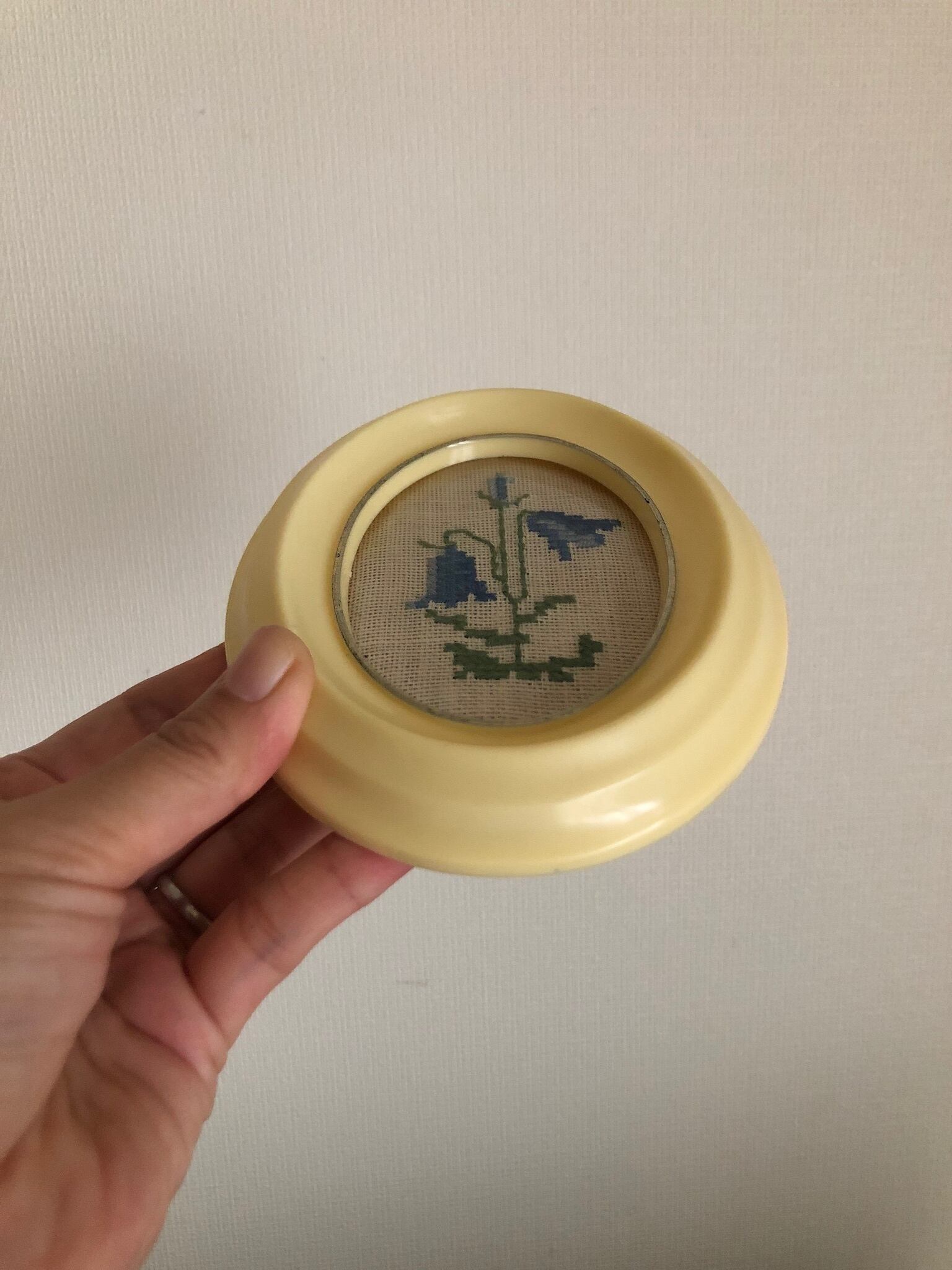 北欧 スウェーデン 丸額入りリネン刺繍飾り ブルーのお花 ヴィンテージ