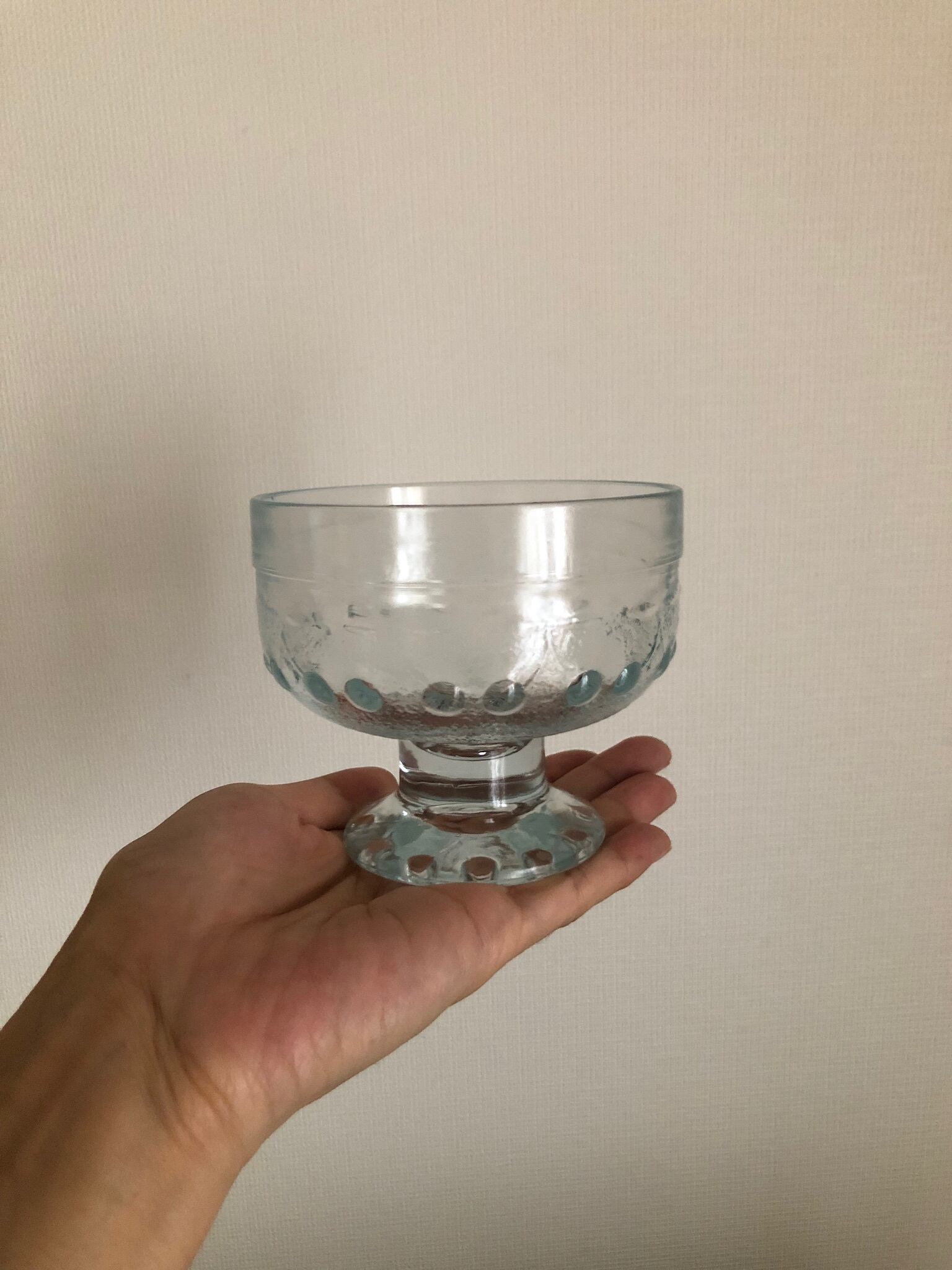 フィンランドのガラスメーカー、Riihimaen Lasi社の KIRSI キルシ シリーズのガラスの脚付きデザートボウルになります。