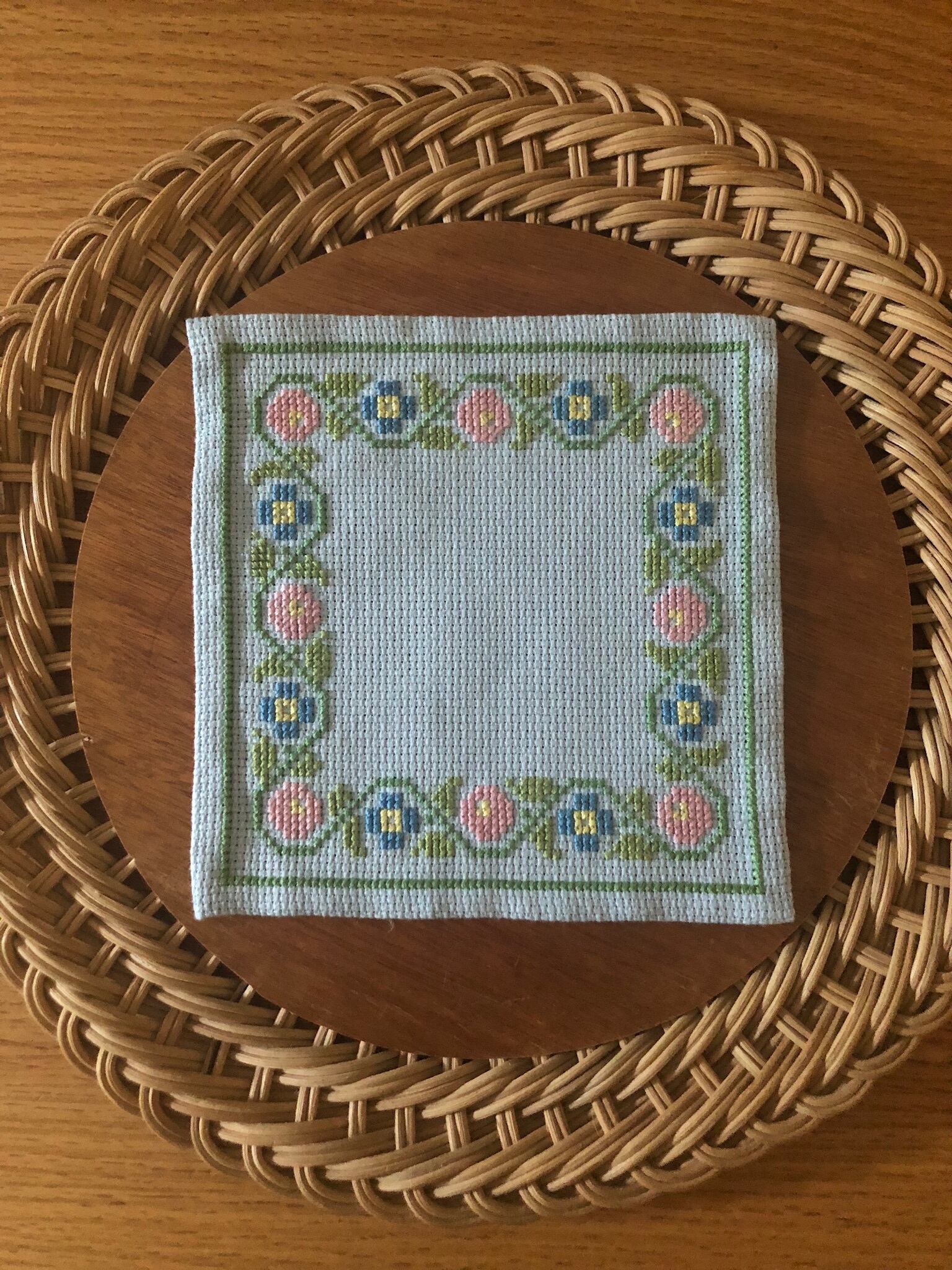 北欧 お花刺繍のブルーのクロス ヴィンテージ
