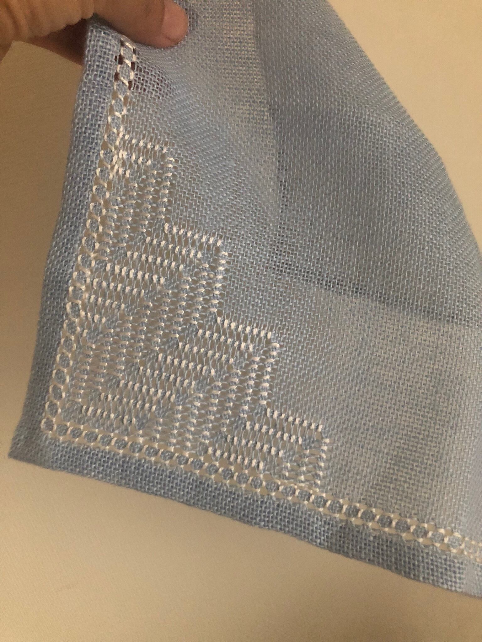 ブルーの張りのあるリネン生地と白の刺繍の組み合わせが涼しげで、今の時期にぴったりな1枚♫