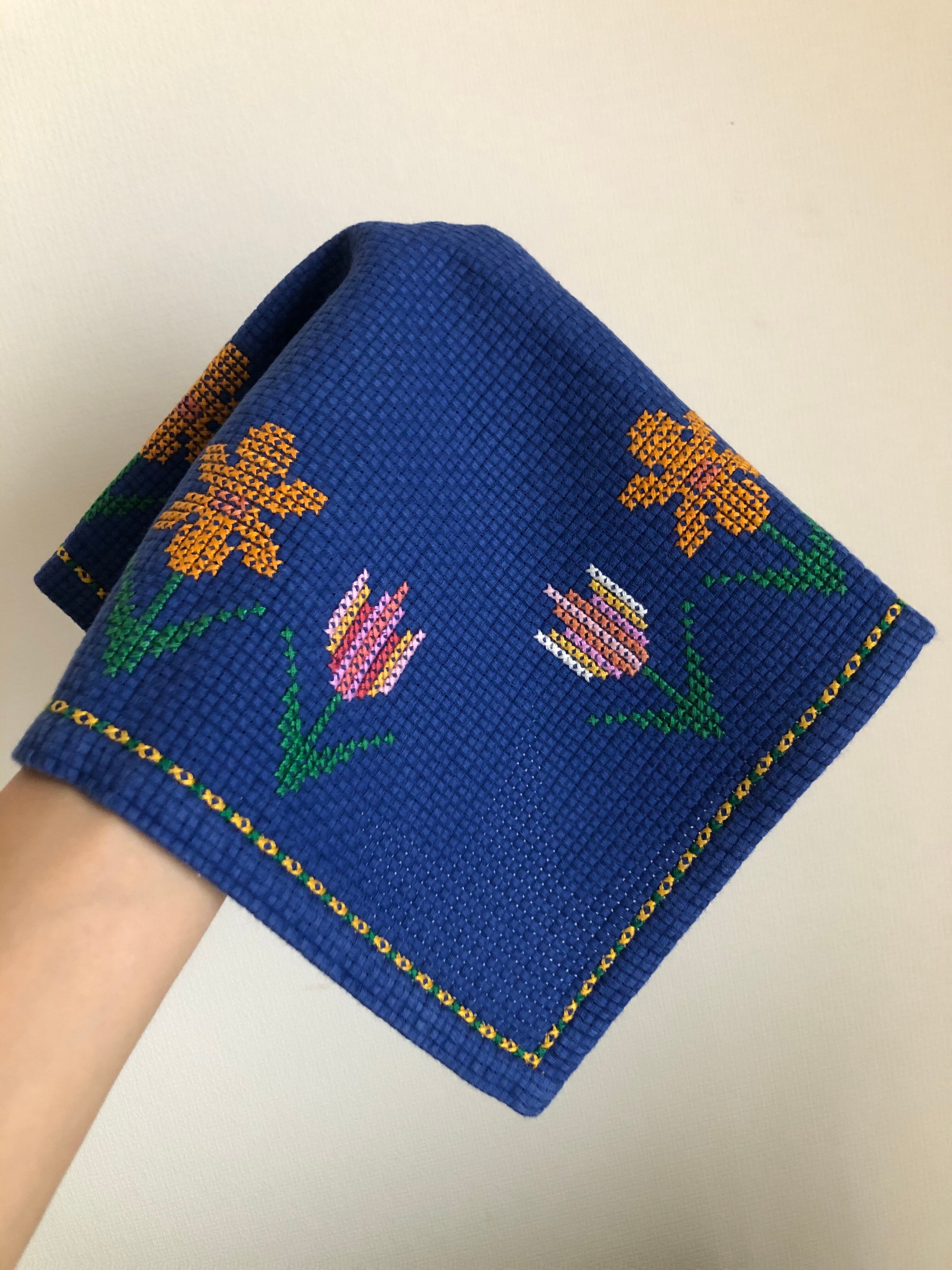 濃いブルーのコットン生地に、チューリップなどのお花の刺繍が可愛らしいクロスです♫