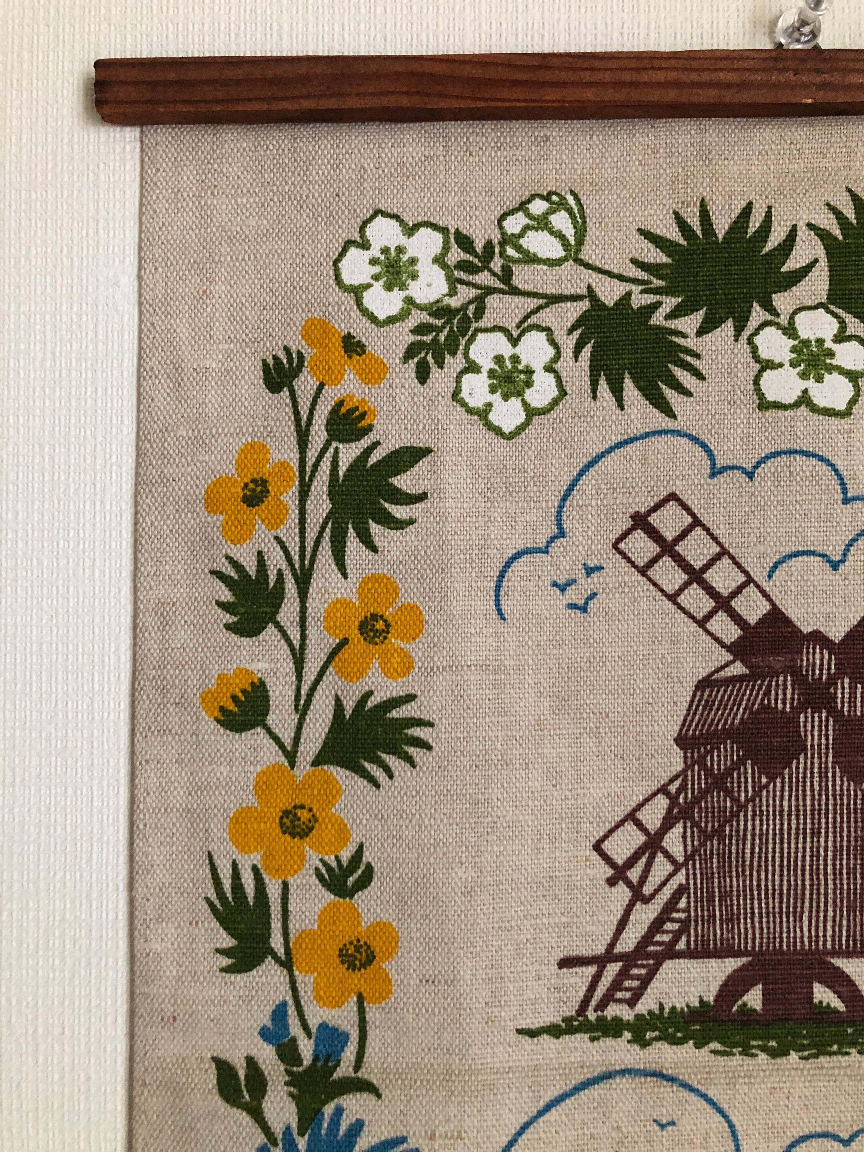 水車に、橋、たくさんのお花模様が可愛らしいタペストリーです。