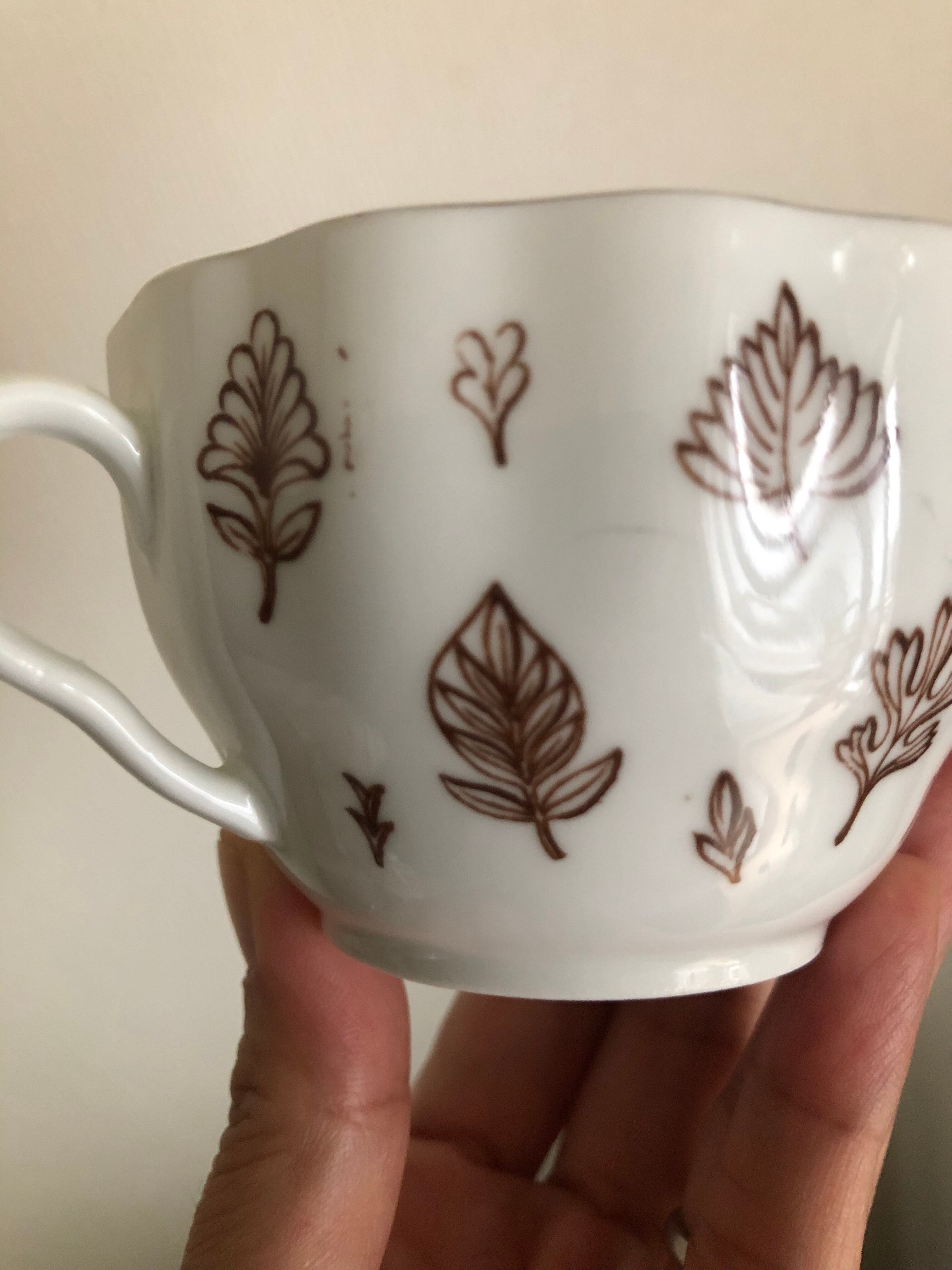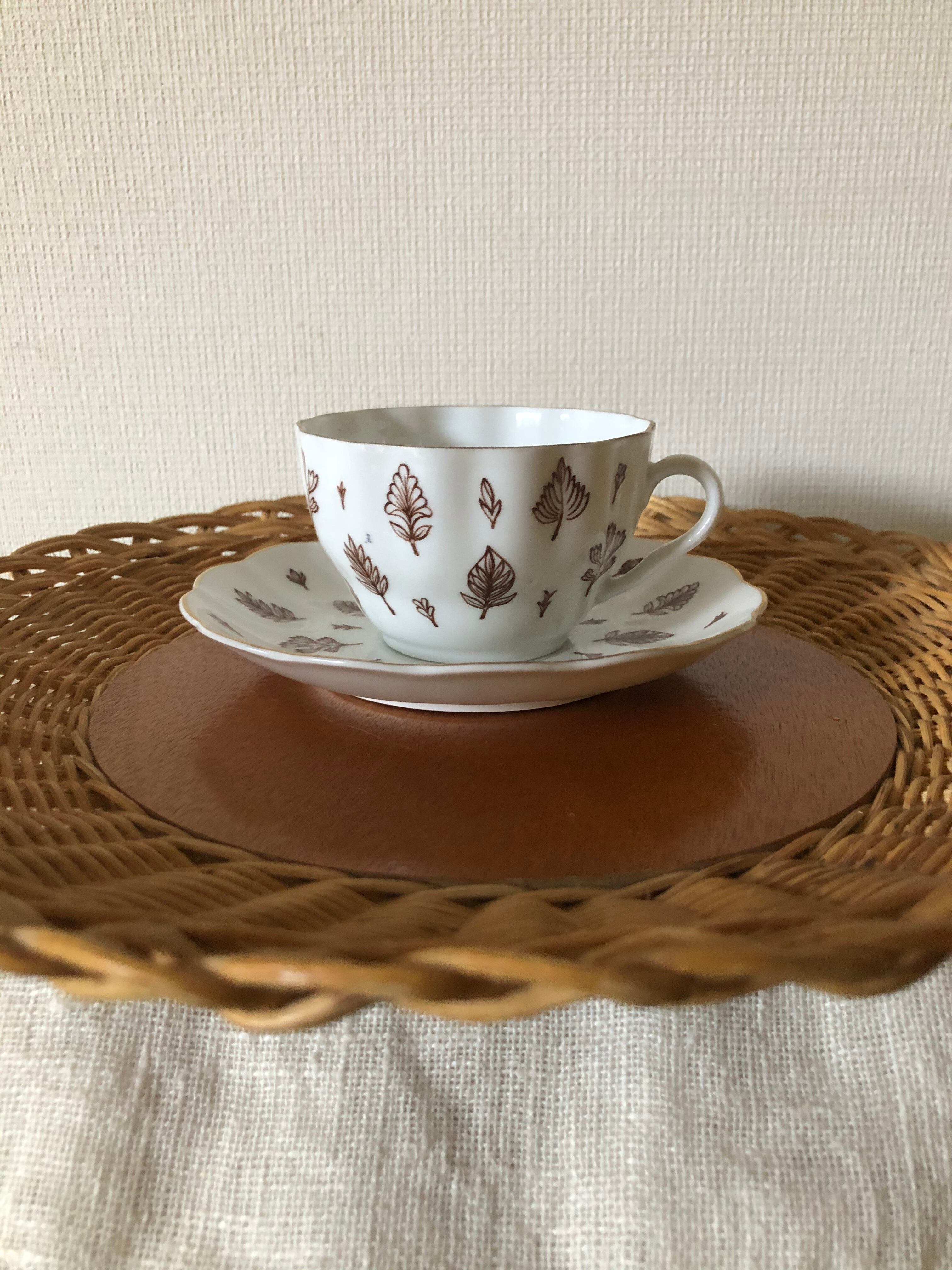 カップとソーサーに描かれた ブラウンの葉っぱが、シックで素敵な一品。