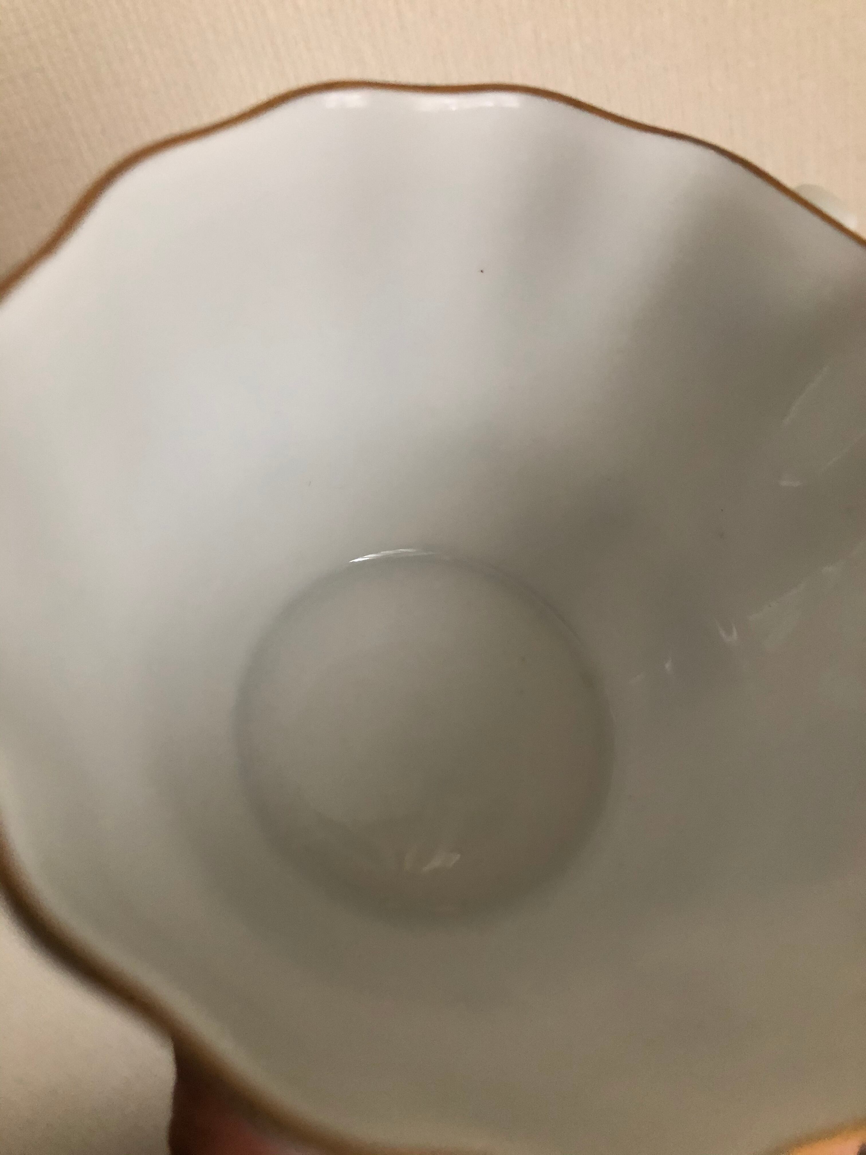 カップ、ソーサーともに、製造時からあったと思われる、ブラウンの点やわずかな凹凸、ゴールドのフチの色ムラ、ソーサーはわずかなカトラリー跡が見られますが、使用するぶんには問題なく、