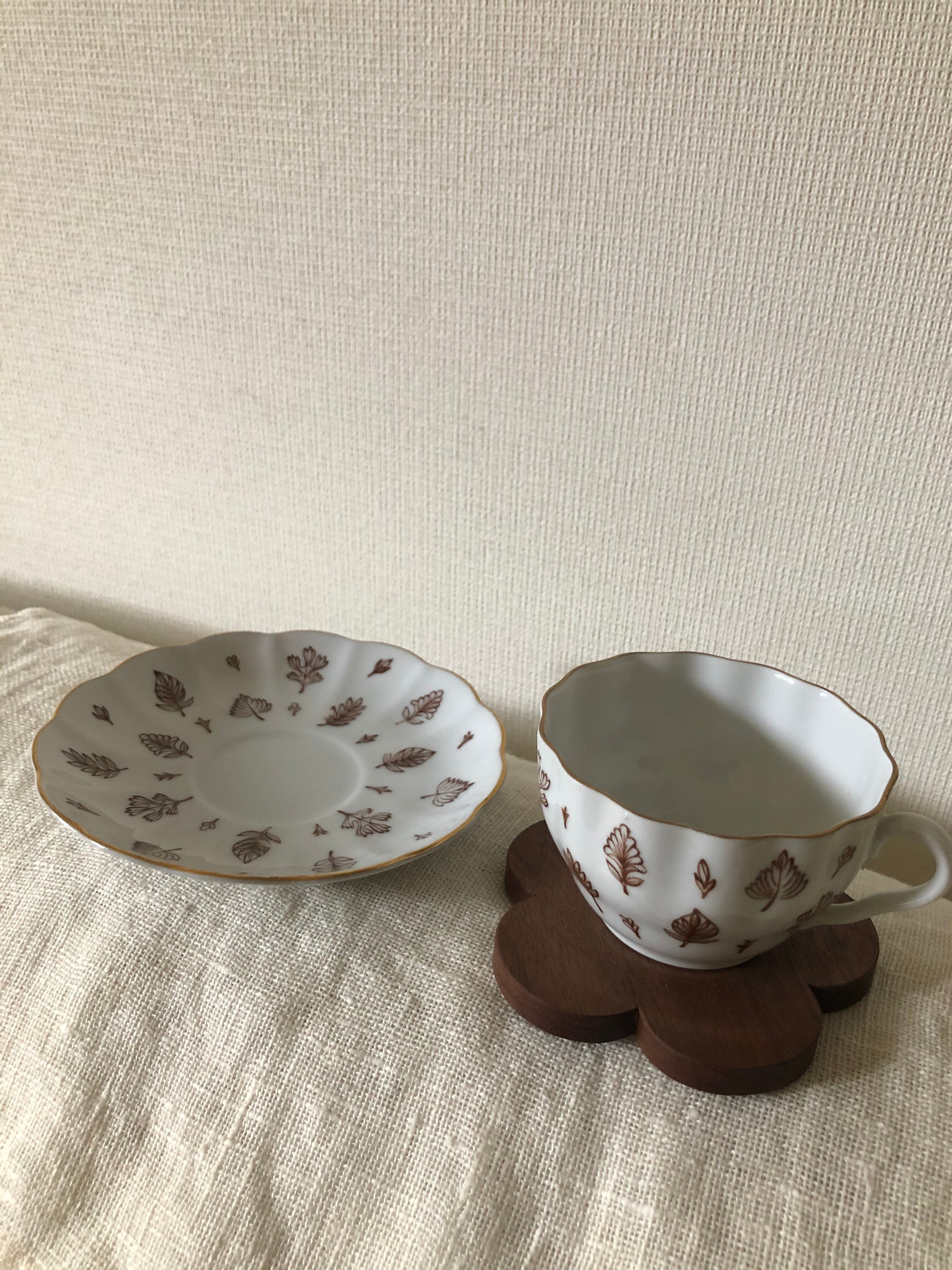 カップとソーサーに描かれた ブラウンの葉っぱが、シックで素敵な一品。
