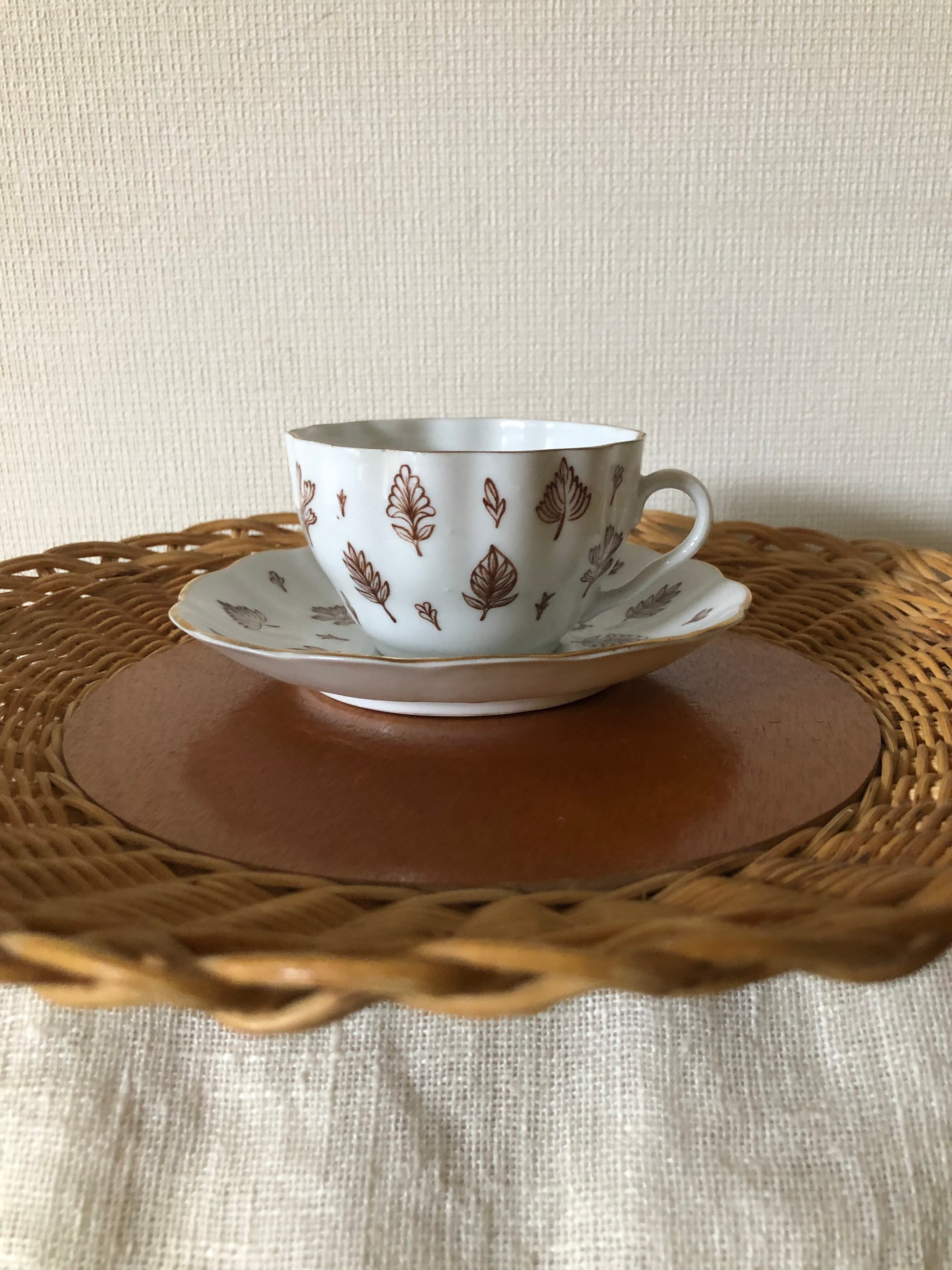 カップとソーサーに描かれた ブラウンの葉っぱが、シックで素敵な一品。