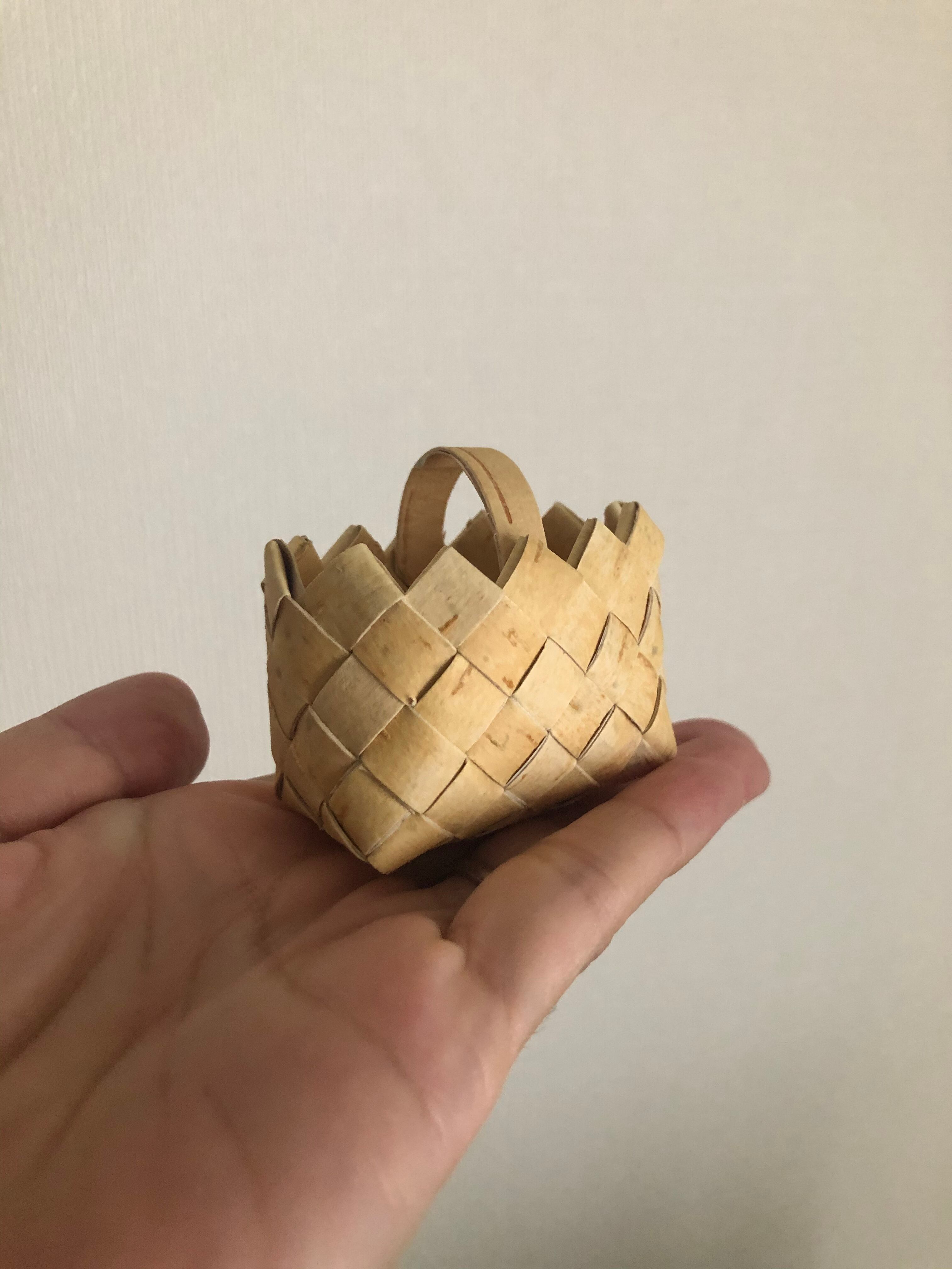 上のギザギザと、なにより手のひらに乗るミニチュアサイズが可愛らしい、白樺のバスケット♫