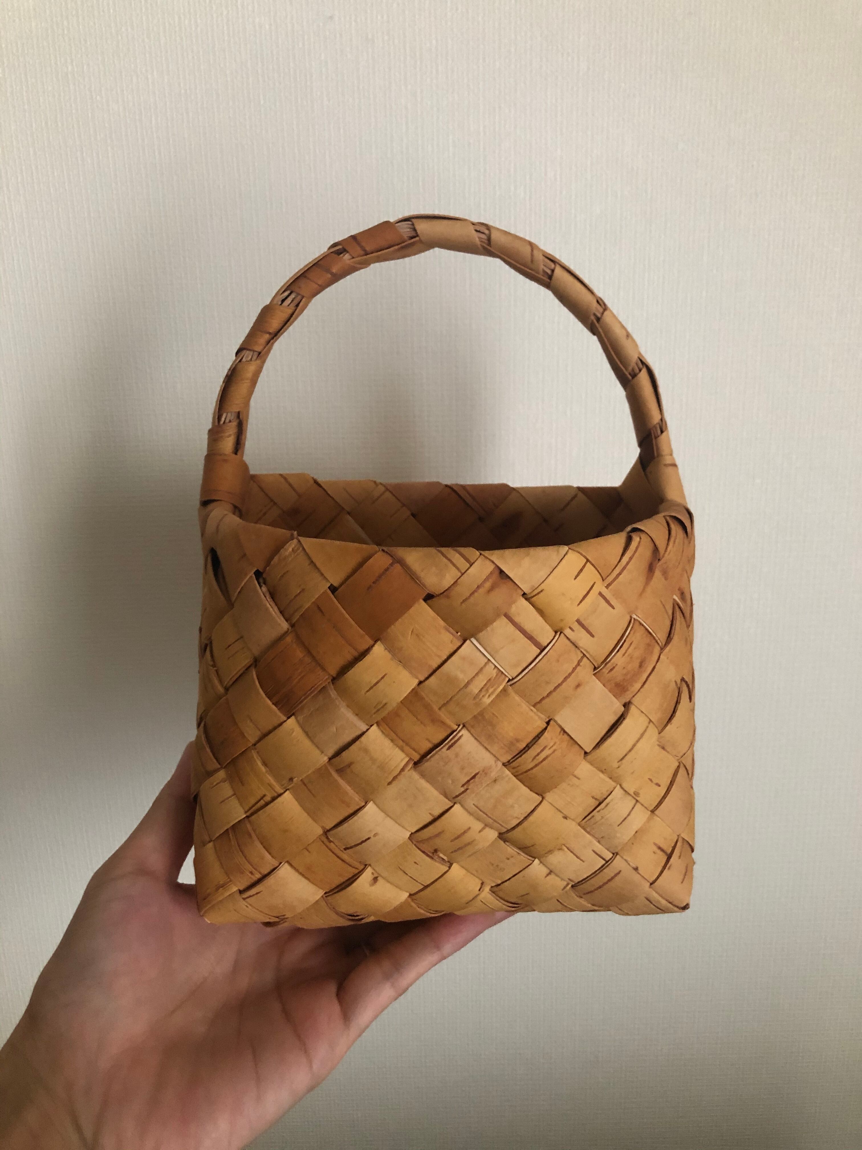 しっかりした白樺樹皮で編まれた半円型の壁掛けバスケットになります。
