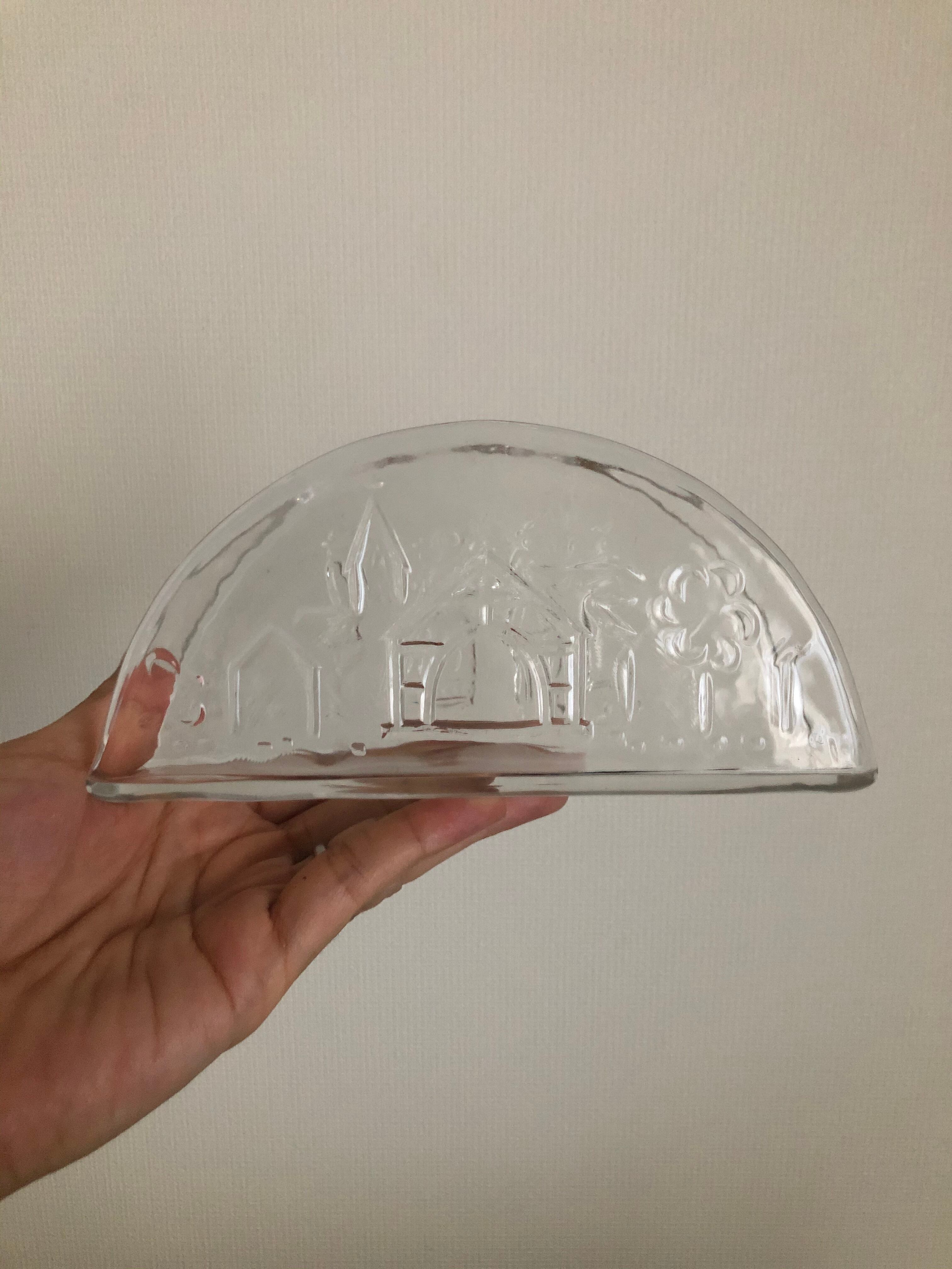 クリアなガラスの両面に、おうちや教会や木、太陽のもとに男女が踊っている風景の素朴な絵柄のタッチが可愛いらしいです。