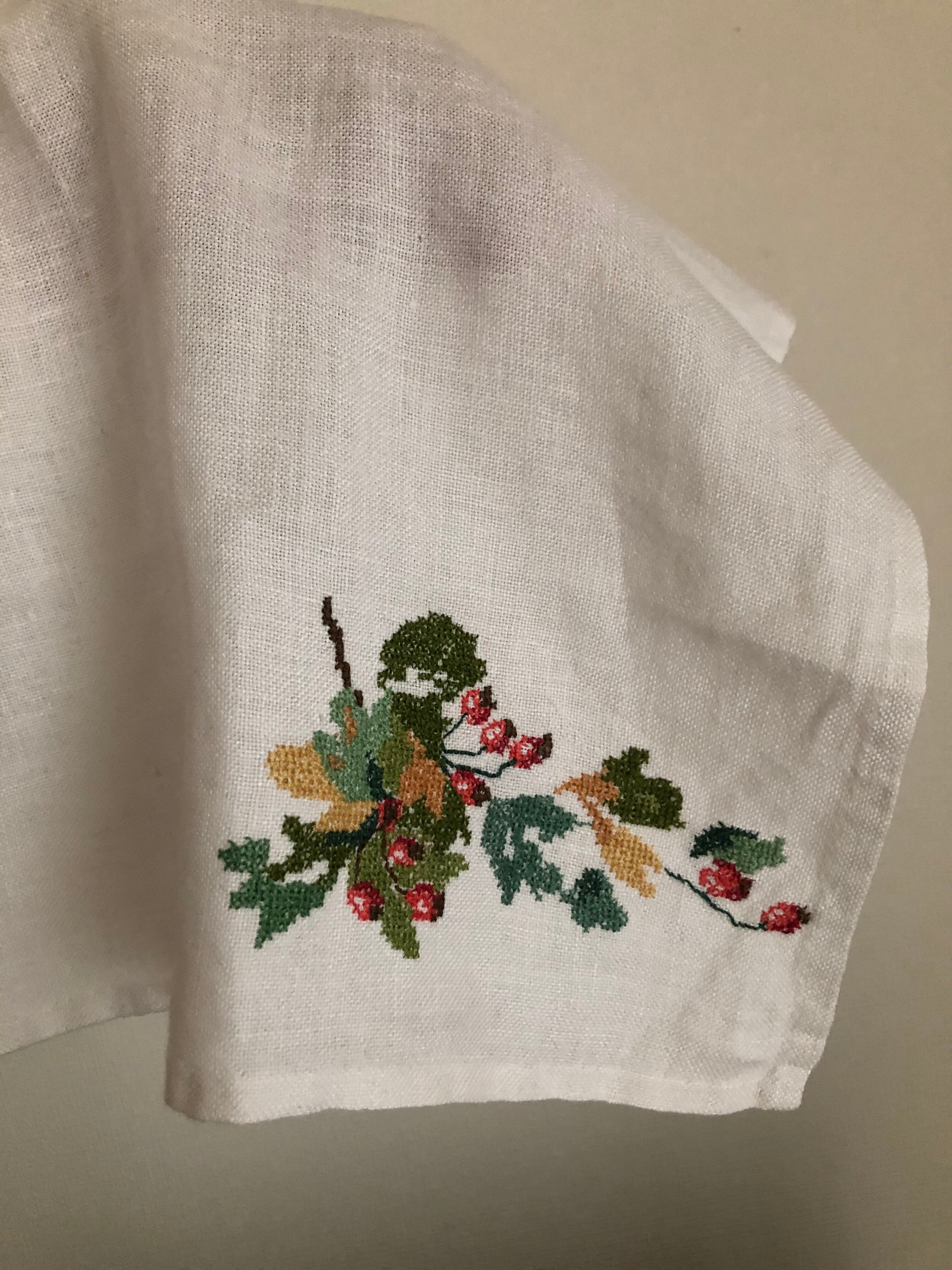 白のリネン生地に、ベリーと枝の葉っぱの刺繍が素敵で可愛らしい一枚♫