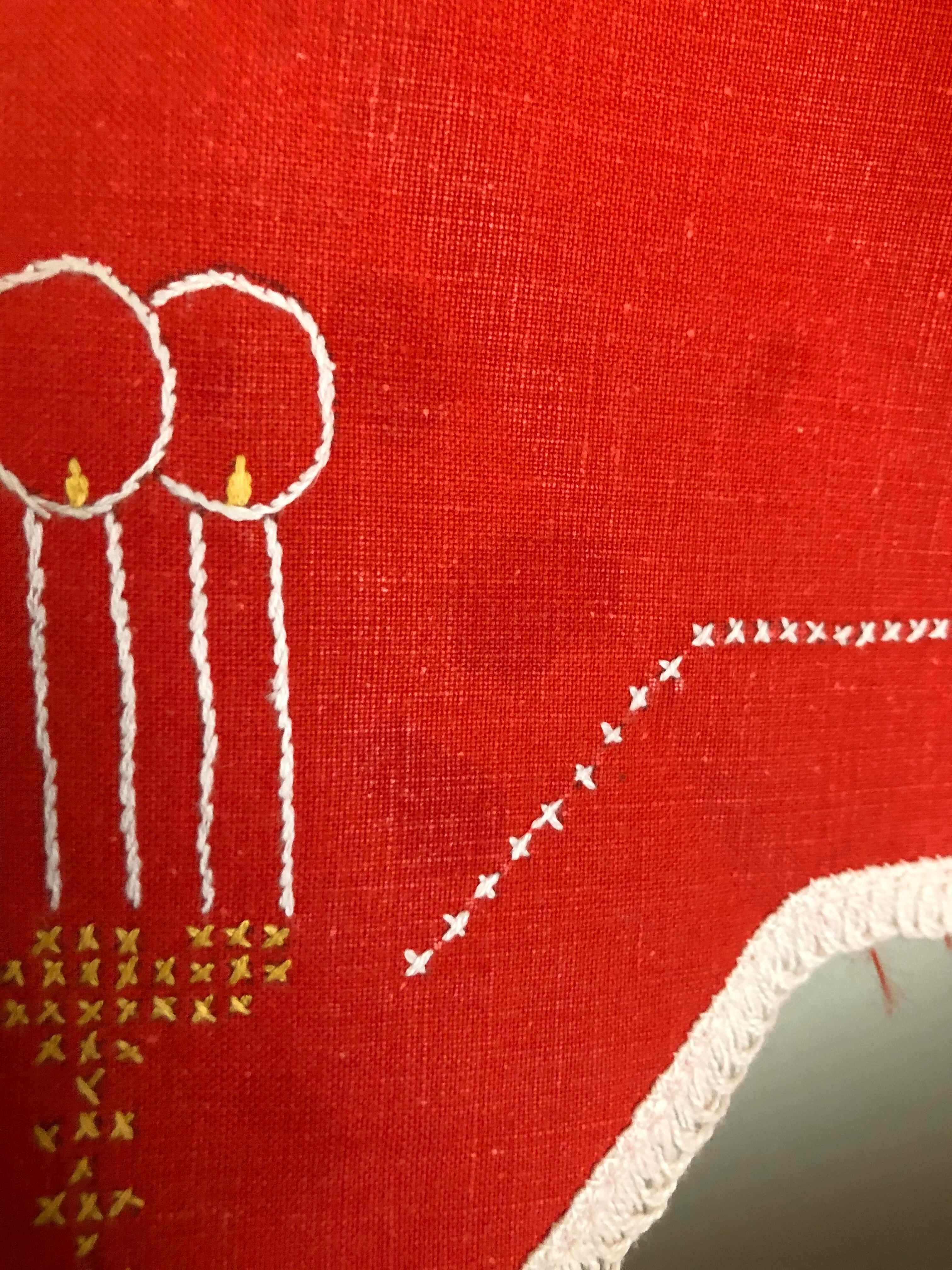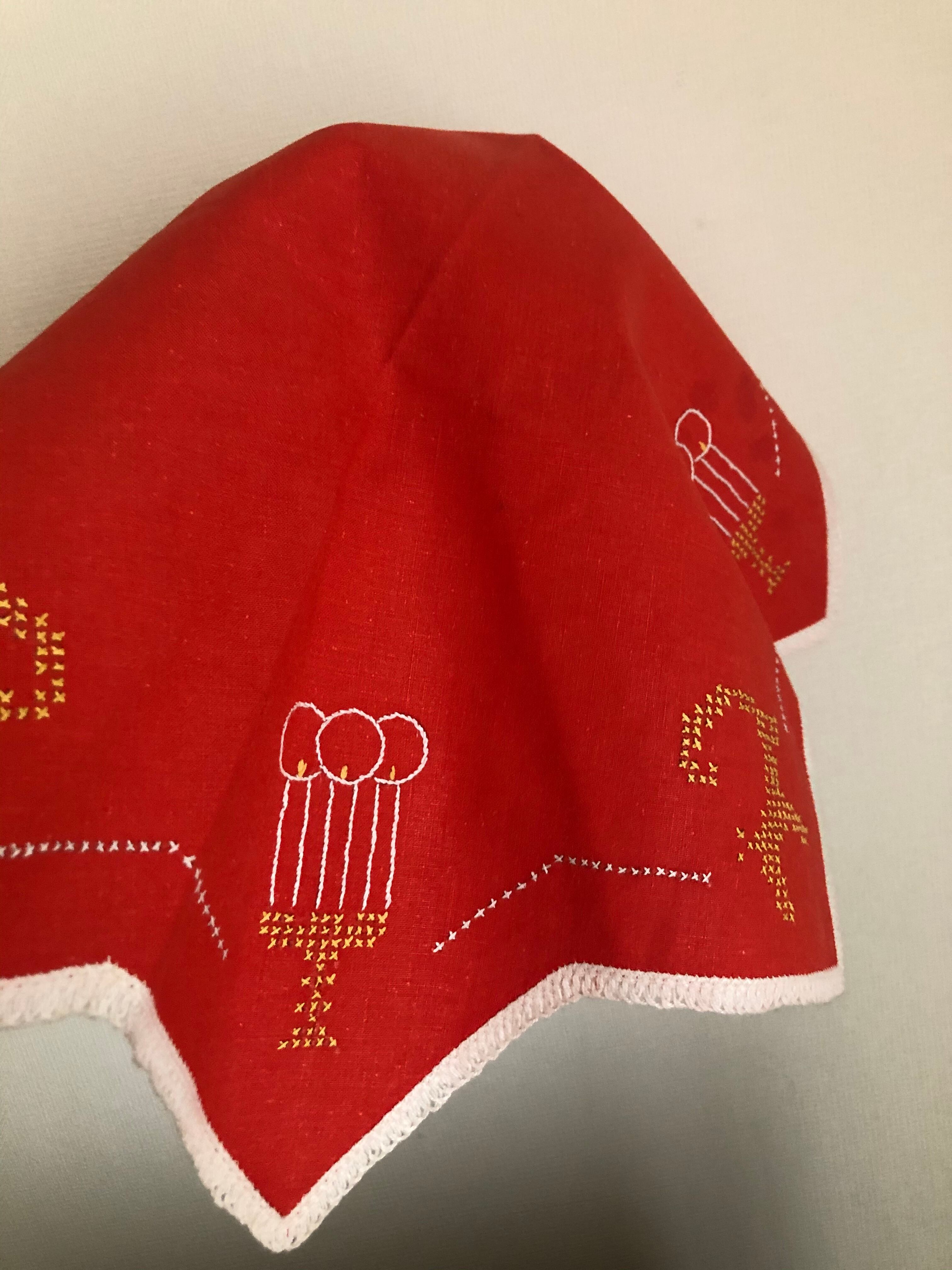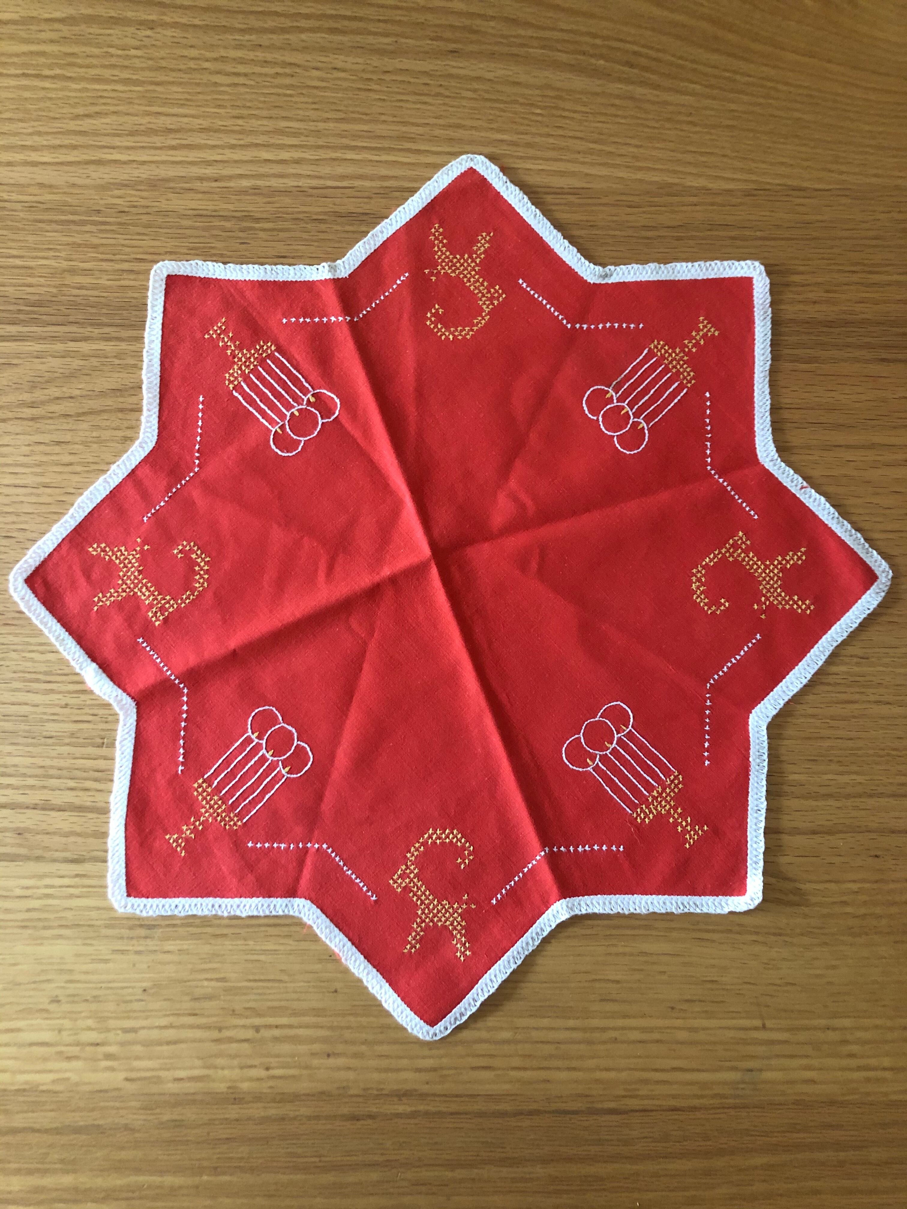 朱色のコットン生地に、トナカイと燭台、キャンドルの刺繍が、素朴で可愛らしい、クリスマスの八角系の星形型のクロス♫