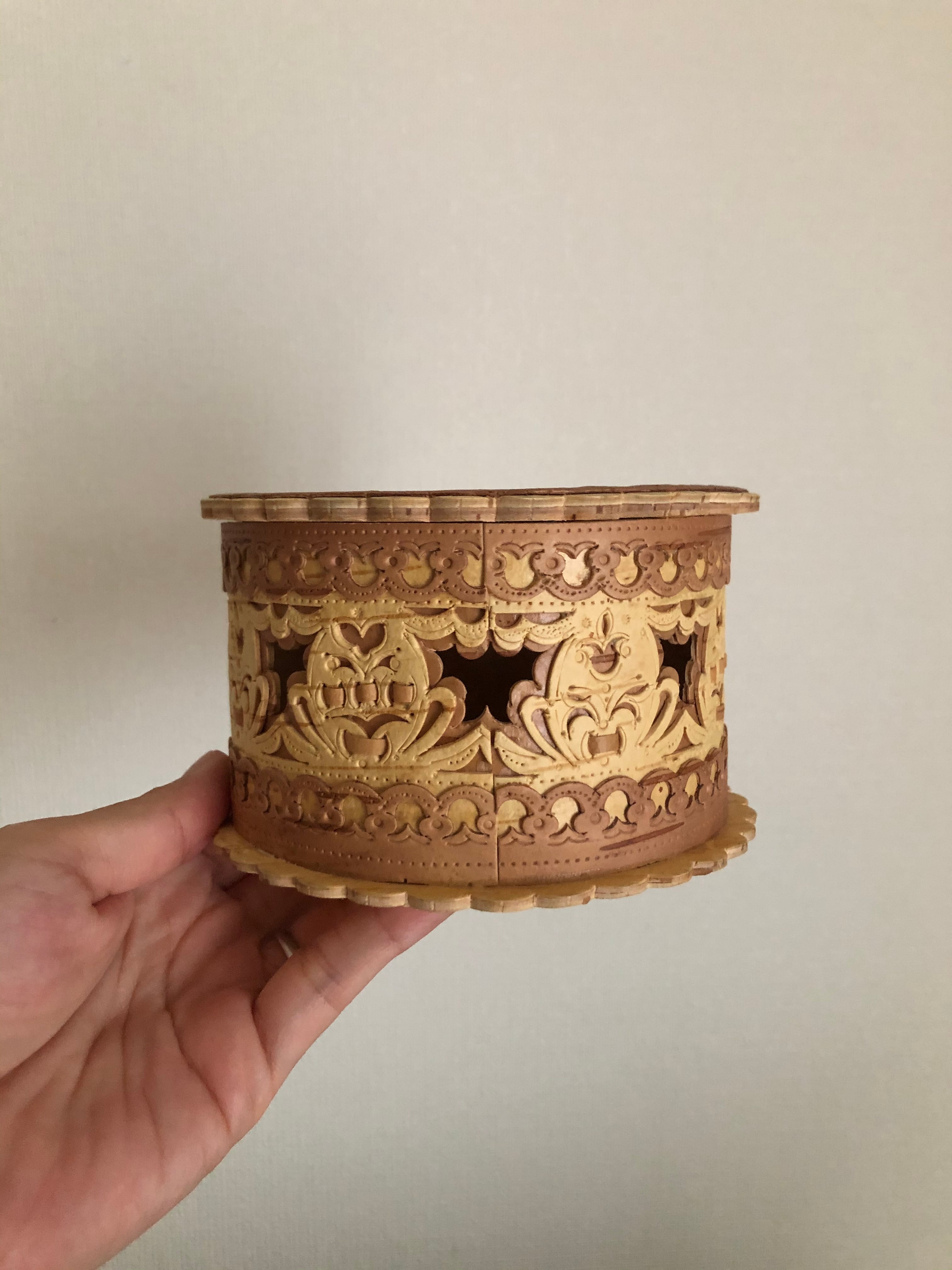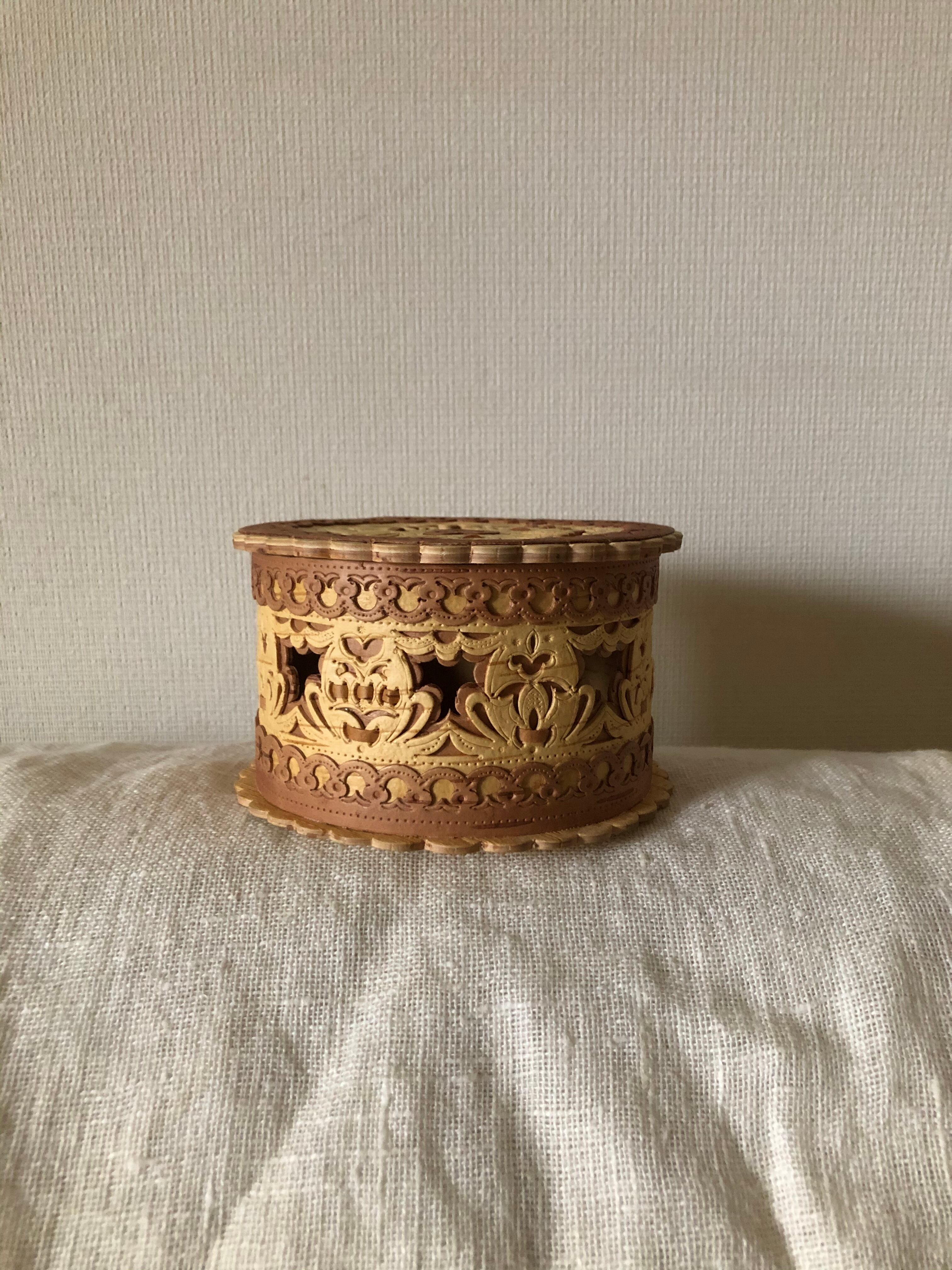 ロシアの白樺細工、ベレスタの透かし彫りの入れ物になります。