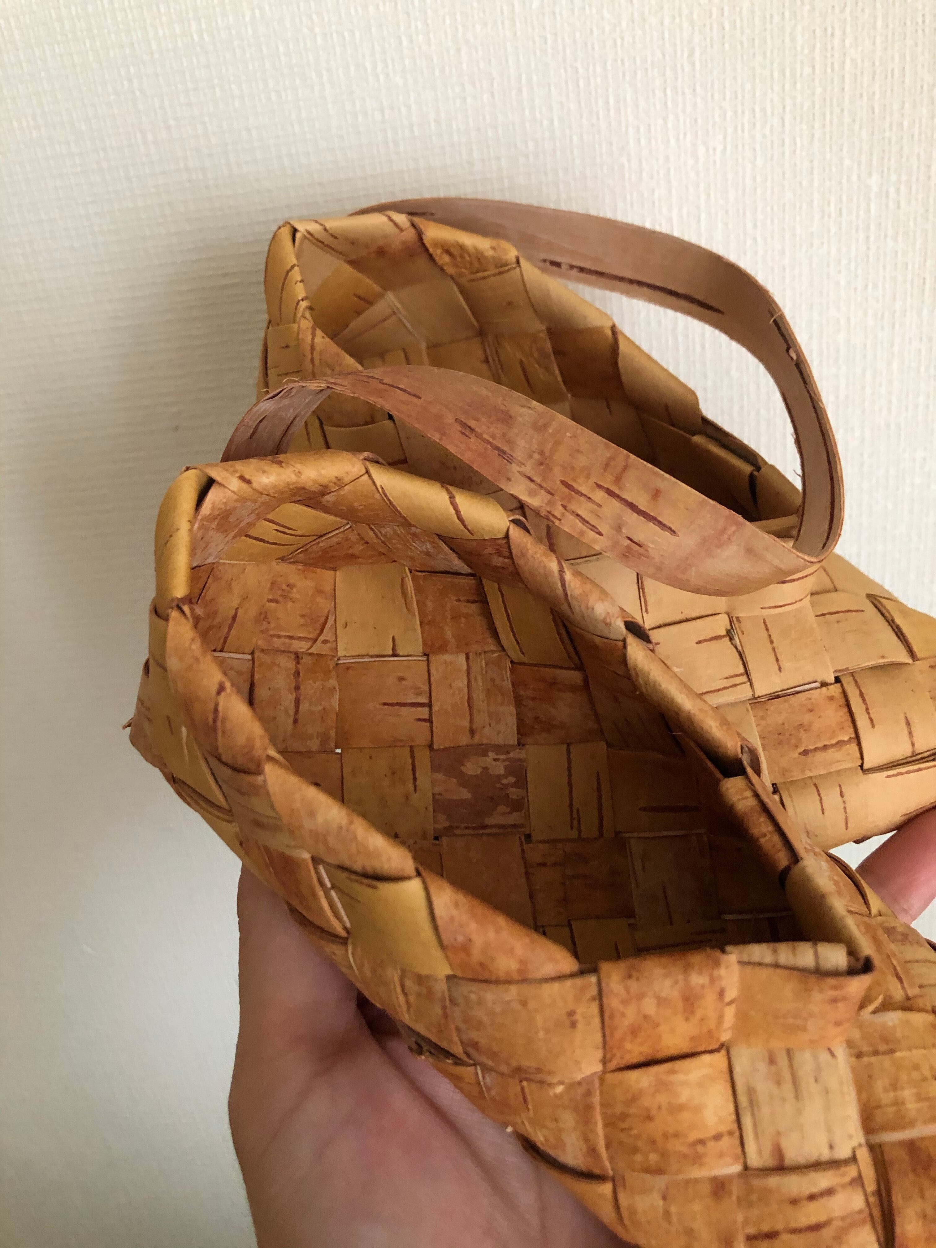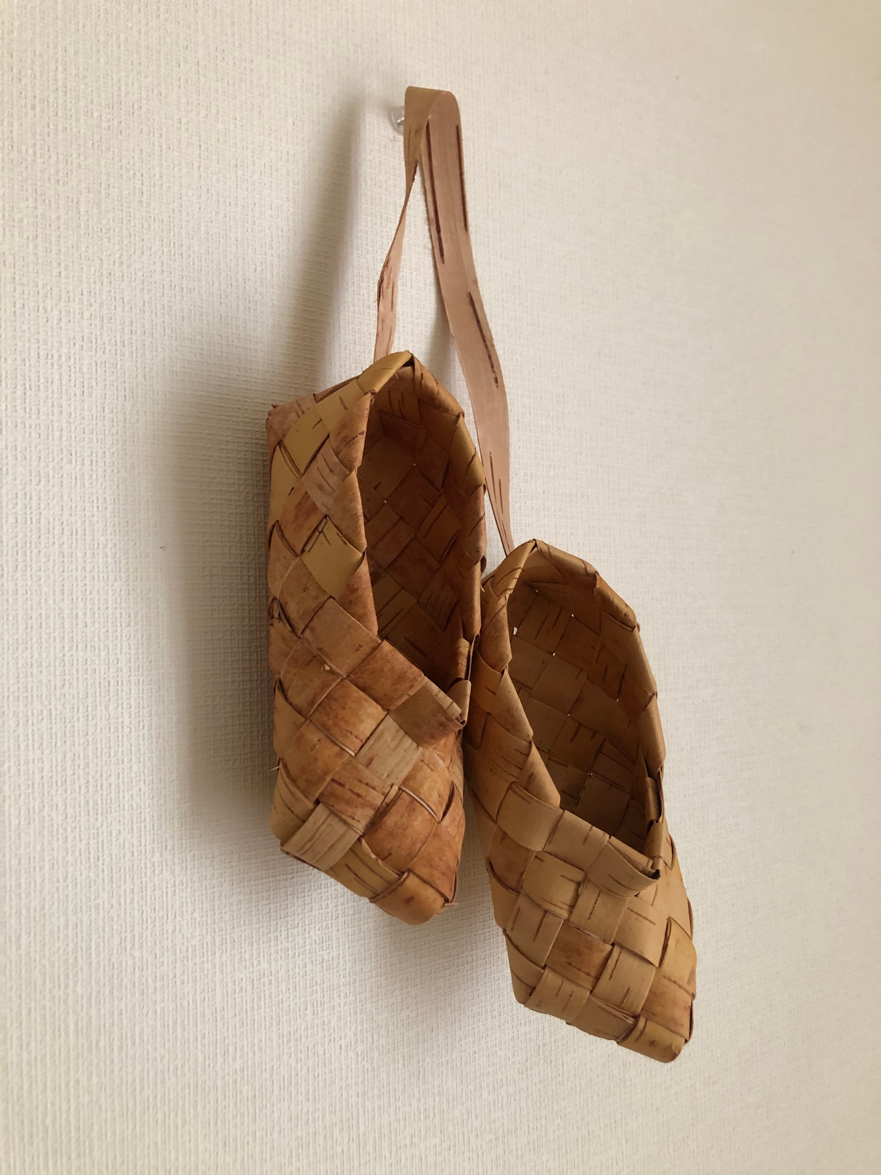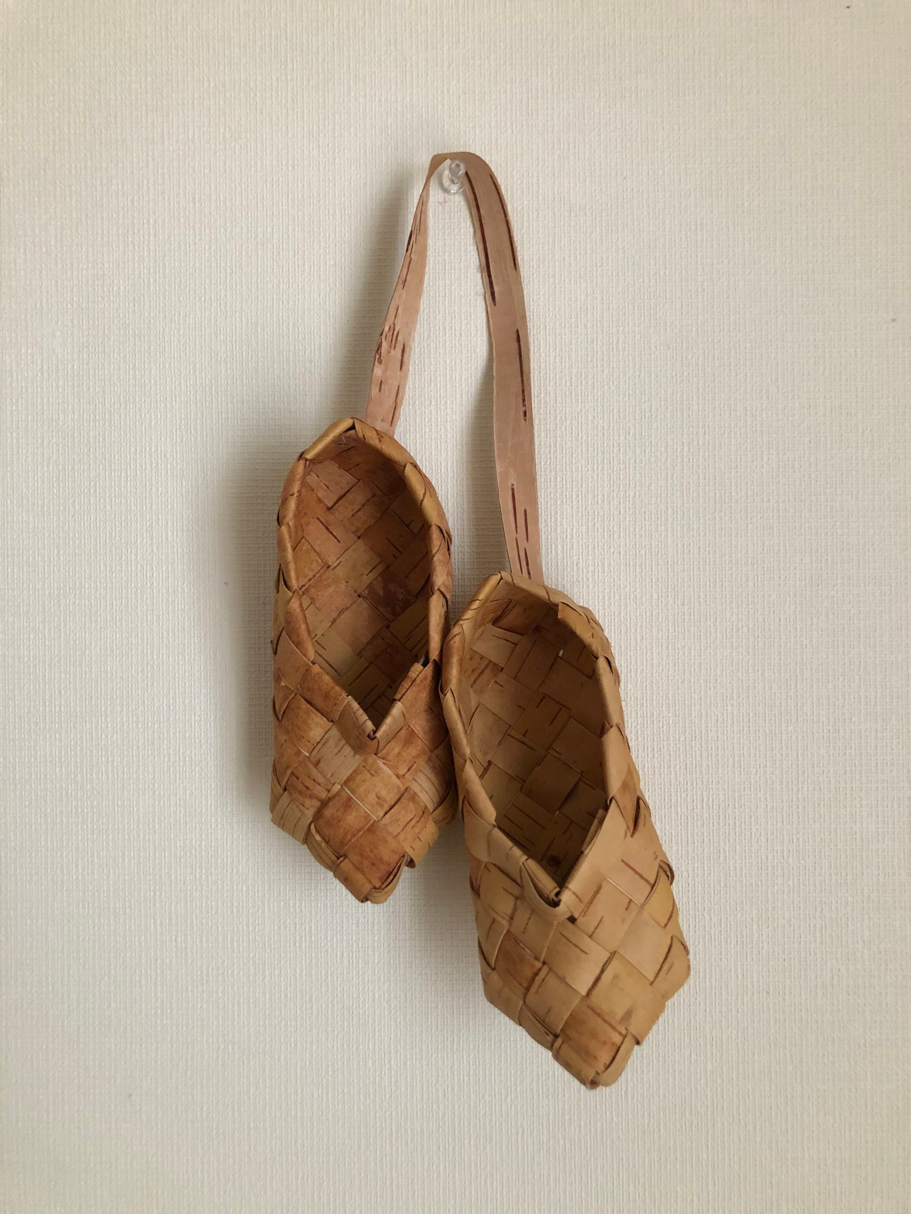 白樺の皮で編まれた靴のオーナメント。16㎝サイズなので、小さなお子様なら履いて頂ける大きさで、存在感たっぷりです♫