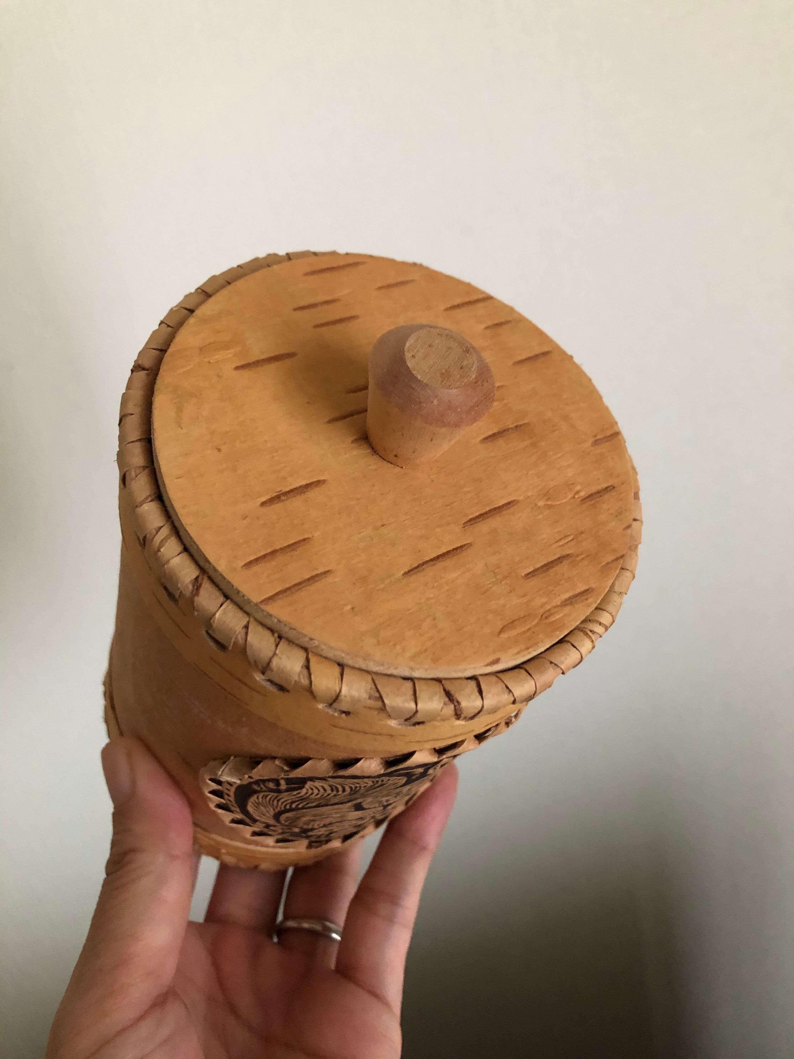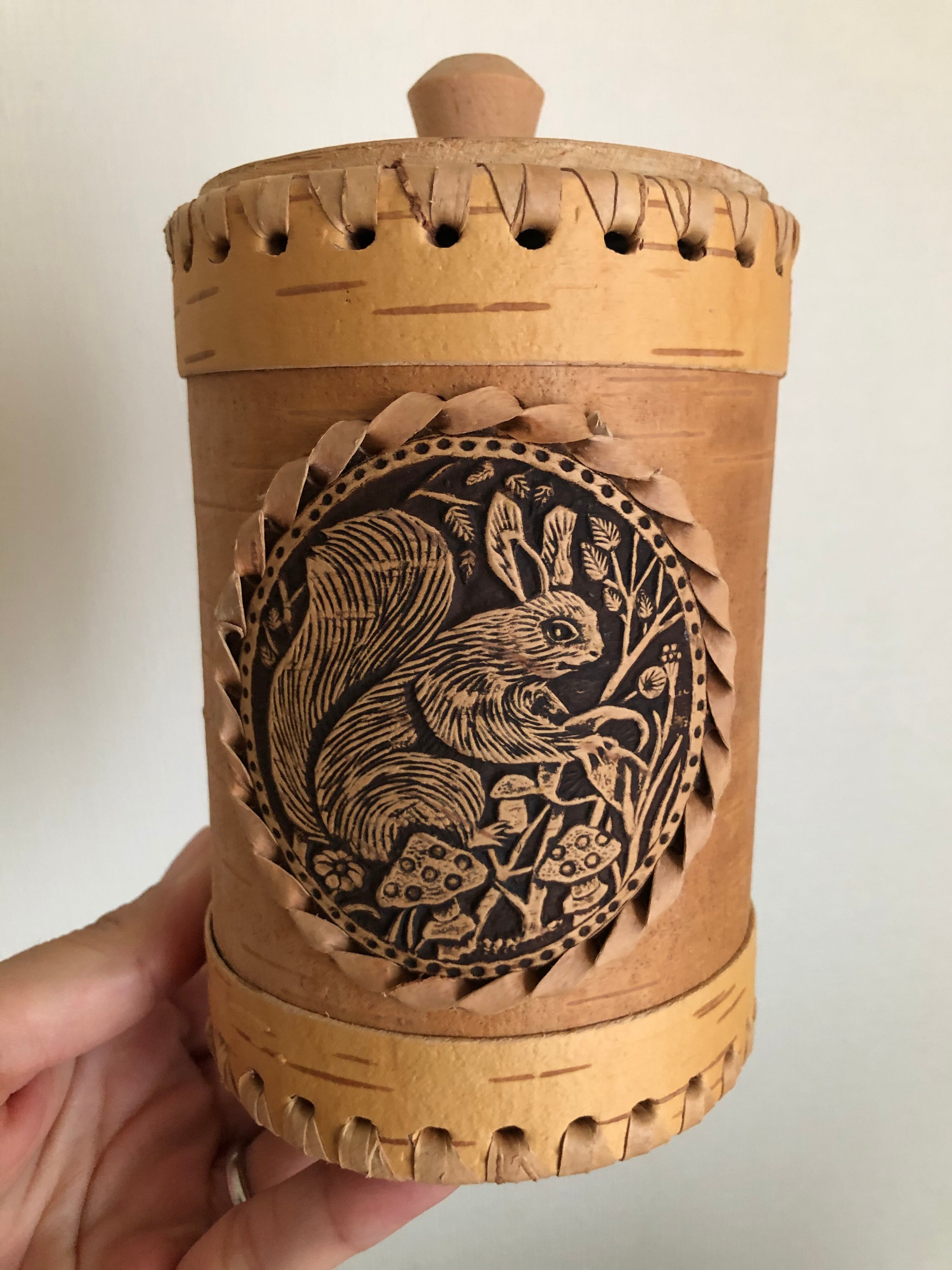 ロシア 白樺細工 ベレスタ 筒型 リスの型押しキャニスター